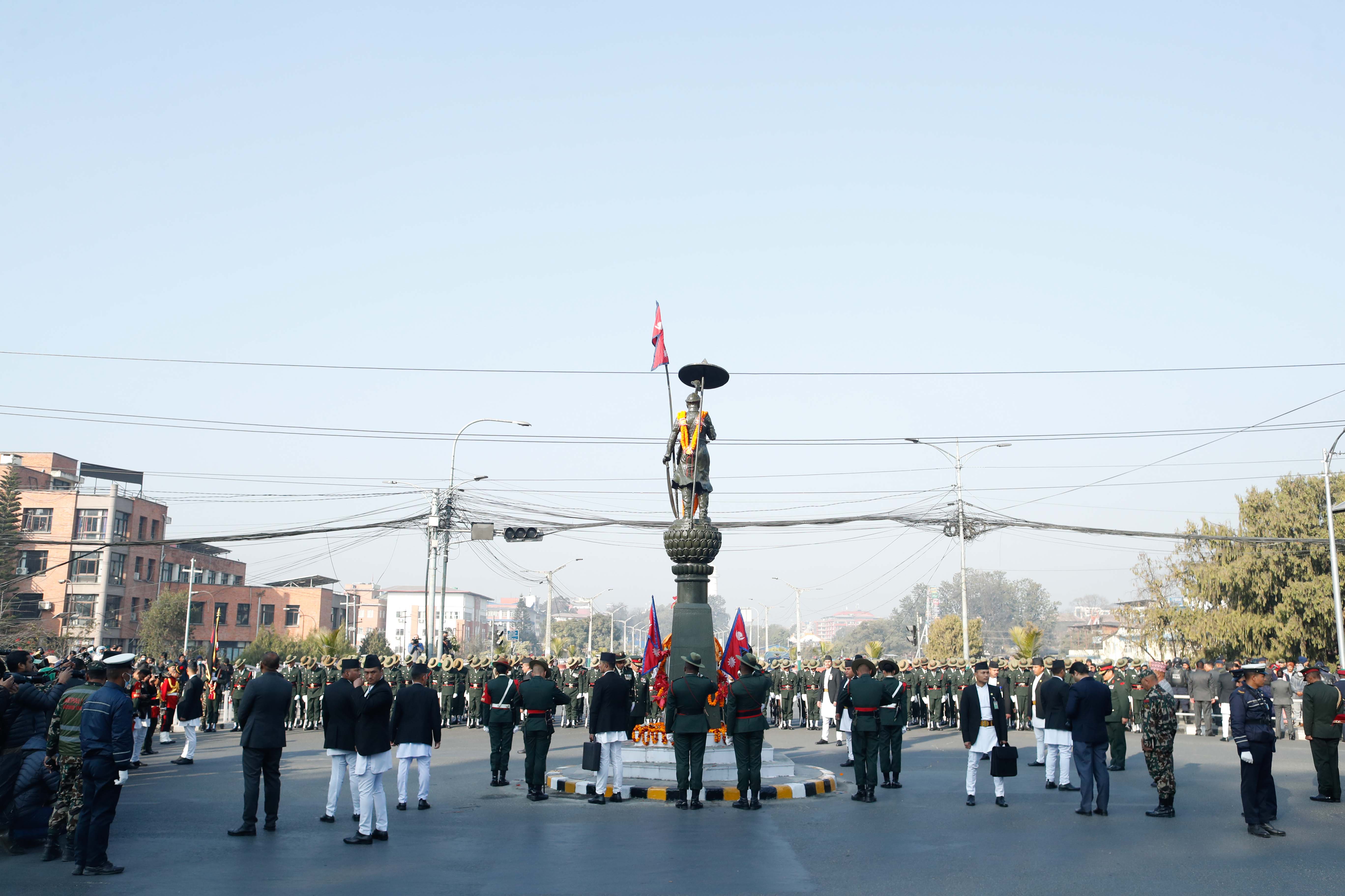 सिंहदरबारको पश्चिम ढोकाअघि रहेको शाहको सालिक परिसरमा विशेष कार्यक्रम आयोजना गरिएको छ। सो अवसरमा राष्ट्रपति रामचन्द्र पौडेलले पृथ्वीनारायण शाहको सालिकमा माल्यार्पण गरेका छन्।