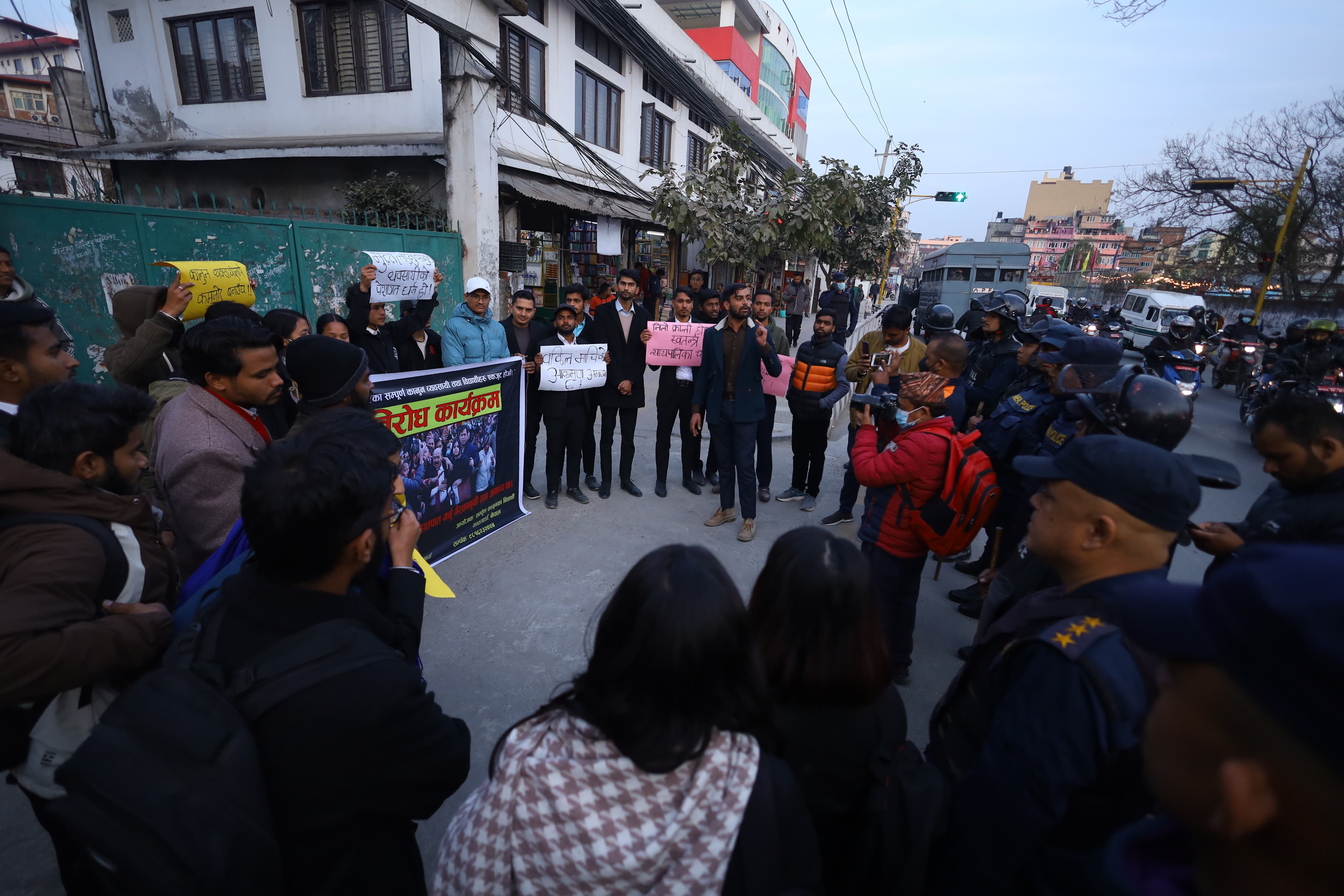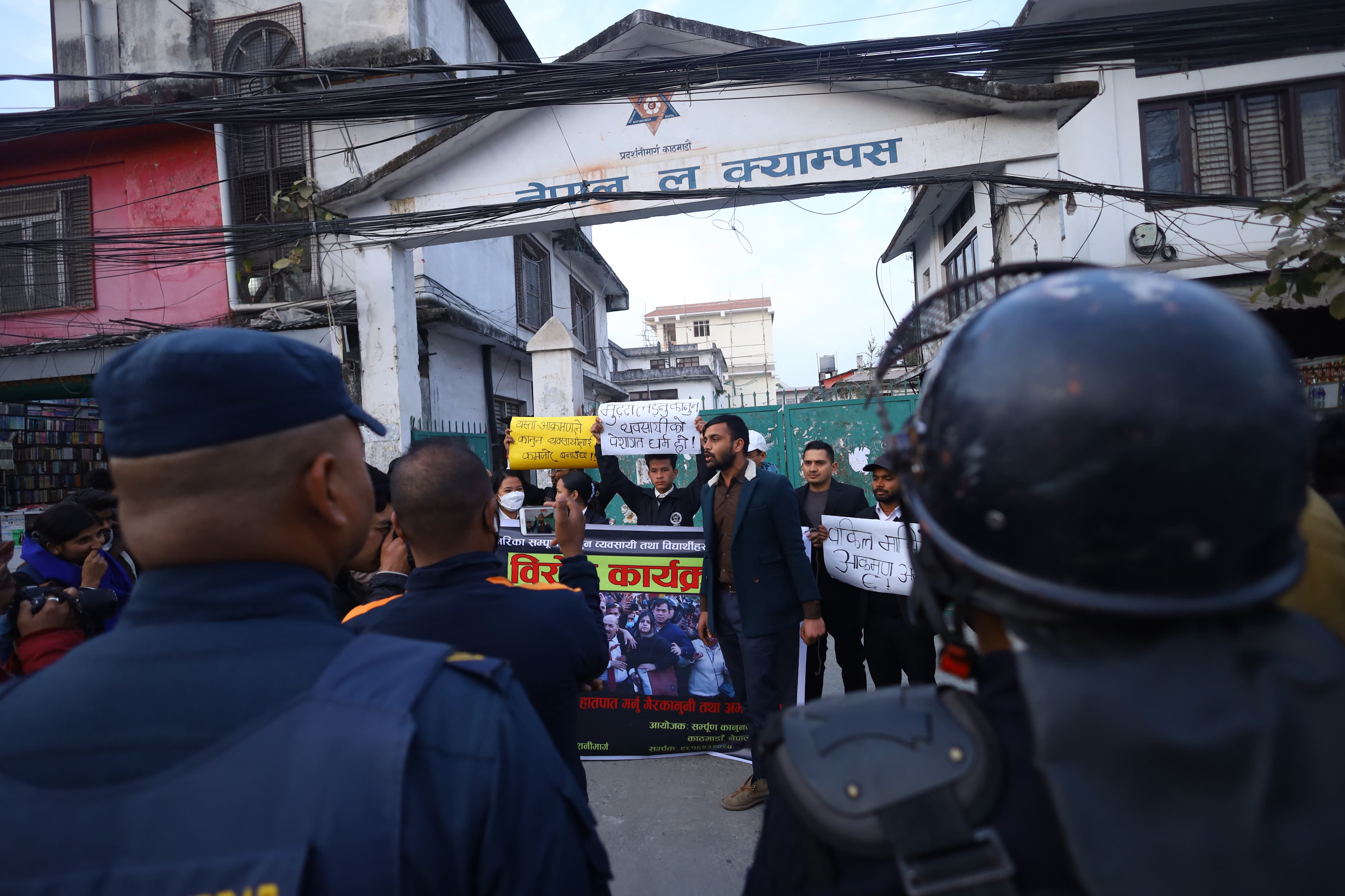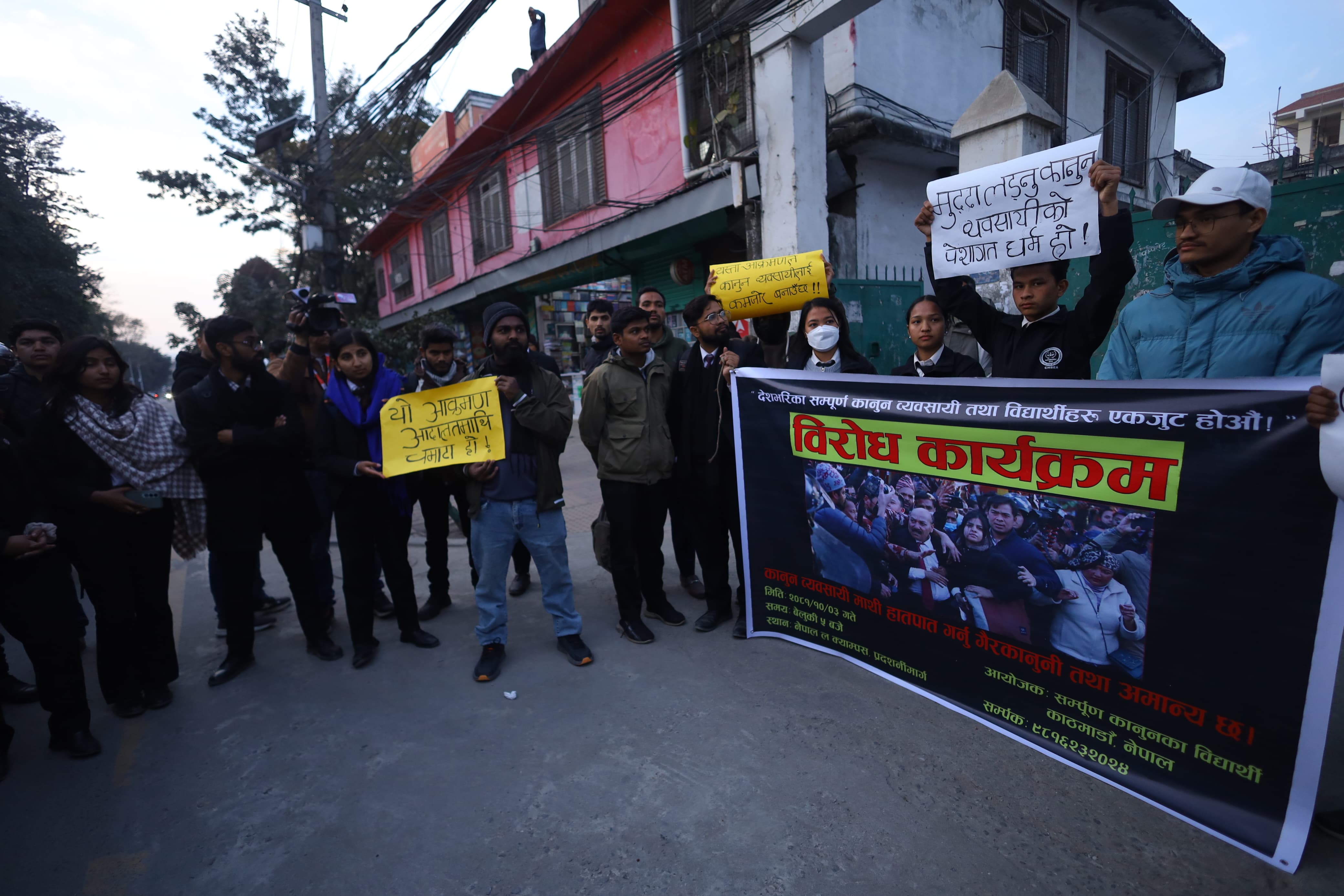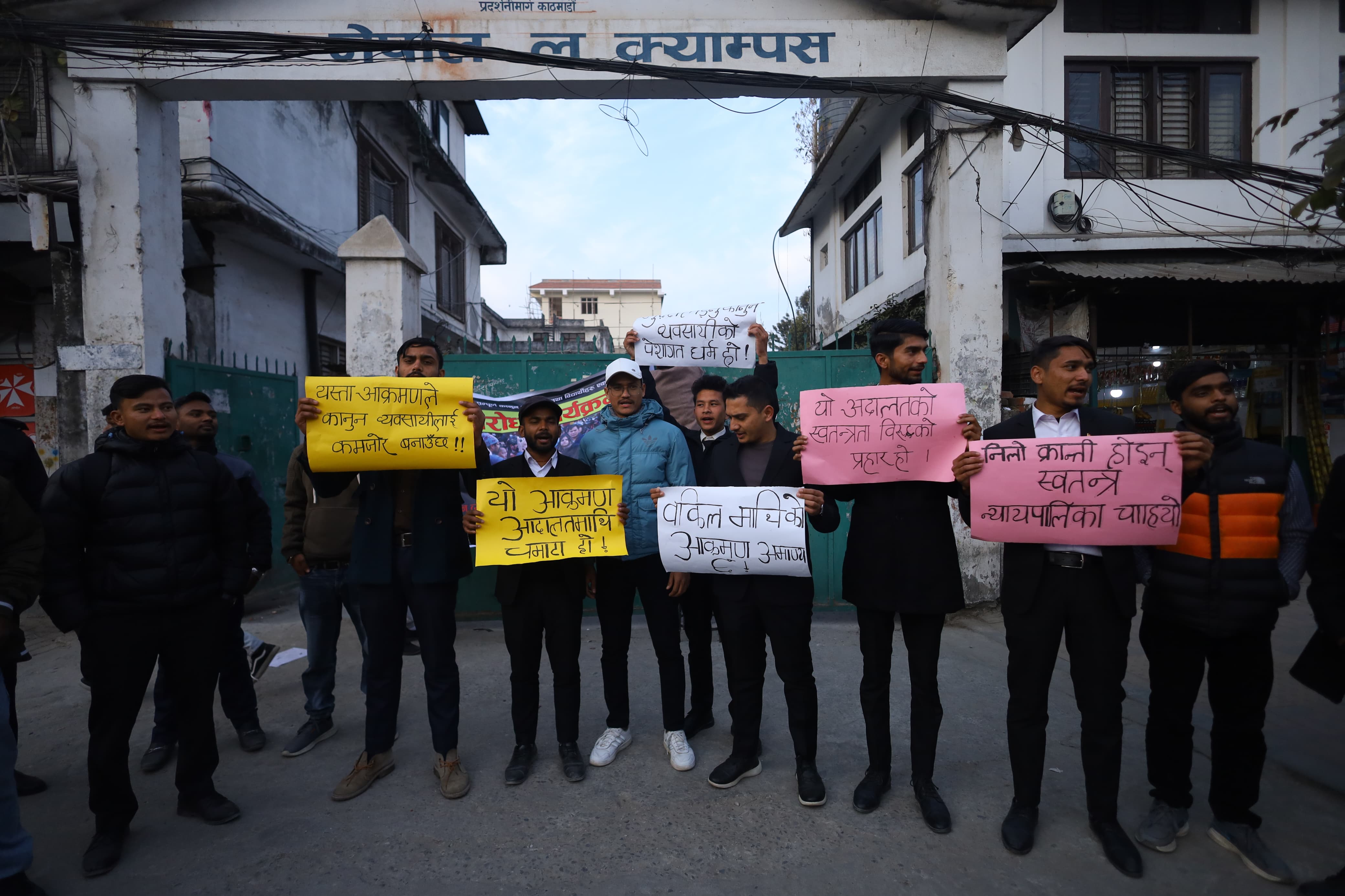 वरिष्ठ अधिवक्ता दिनेश त्रिपाठीमाथि भएको आक्रमणको विरोधमा कानून अध्ययन गरिरहेका नेपाल ल क्याम्पसका विद्यार्थीले प्रदर्शन गरेका छन्।