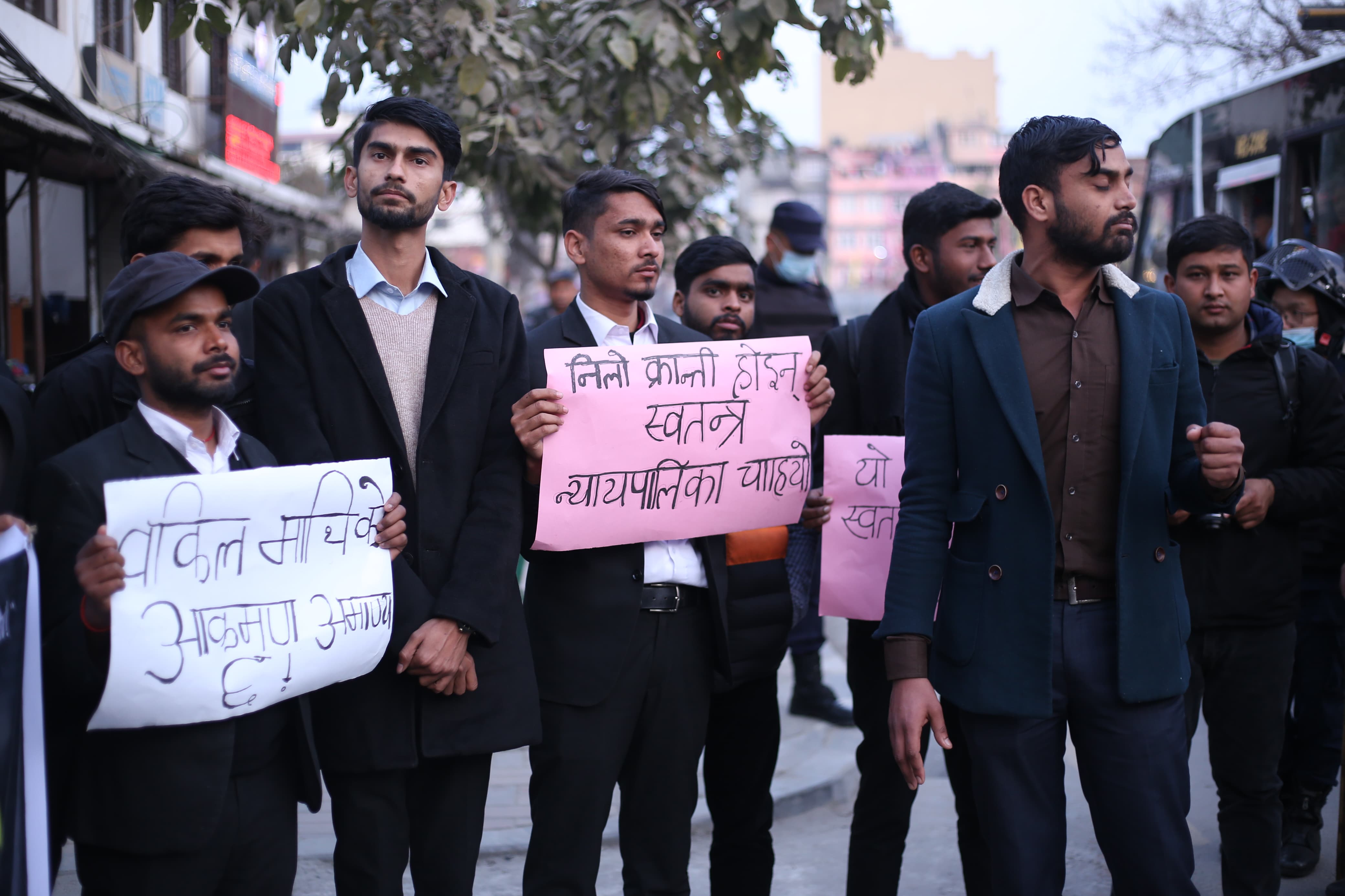 उनीहरूले ‘कानून व्यवसायीलाई कुट्न पाइँदैन’, ‘मुद्दा लड्नु कानून व्यवसायीको पेसागत धर्म हो’, ‘निलो क्रान्ति होइन स्वतन्त्र न्यायालय चाहियो’ लगायतका नारा लगाउनुका साथै प्लेकार्डसमेत प्रदर्शन गरेका छन्।