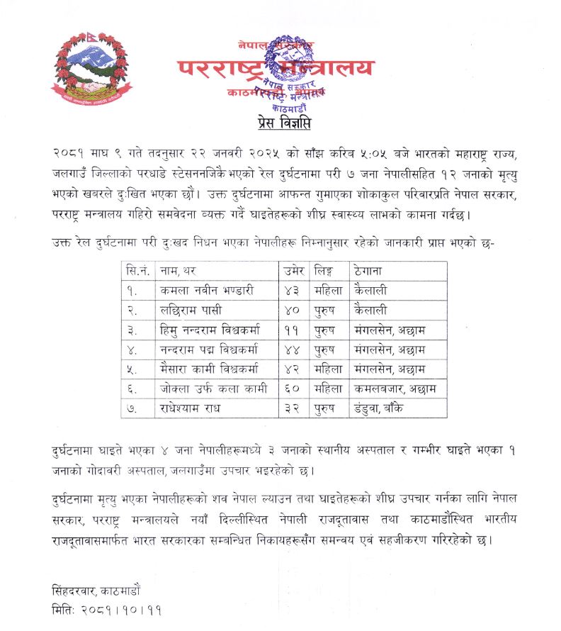 परराष्ट्र मन्त्रालयका अनुसार भारतको महाराष्ट्रमा भएको रेल दुर्घटनामा परी अछामका चार, कैलालीका दुई र बाँकेका एक गरी सात जना नेपाली नागरिकको मृत्यु भएको हो।
