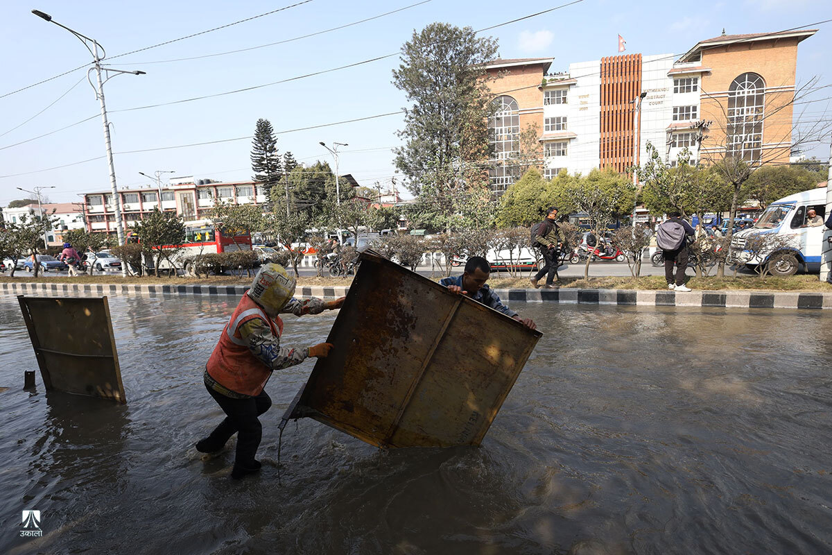 उनले भने, “पाइप फुटेपछि पानी वितरण गर्ने भल्ब बन्द गरी पाइप सफा गर्ने काम (वास आउट) भइरहेको छ। हालसम्म पानी बग्न भने रोकिएको छैन।”