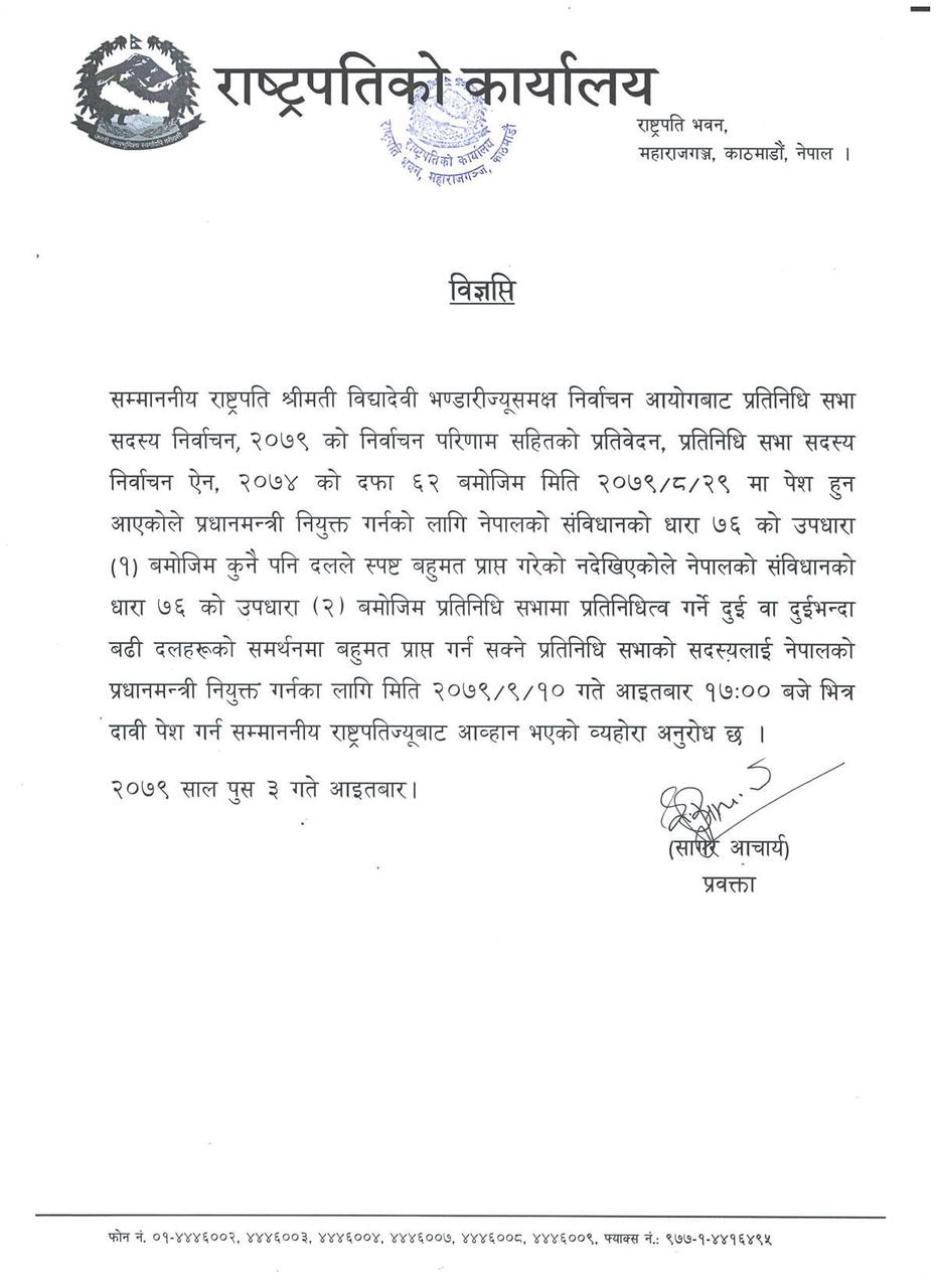 “प्रधानमन्त्री नियुक्त गर्नको लागि नेपालको संविधानको धारा ७६ को उपधारा (१) बमोजिम कुनै पनि दलले स्पष्ट बहुमत प्राप्त गरेको नदेखिएकोले नेपालको संविधानको धारा ७६ को उपधारा (२) बमोजिम प्रतिनिधि सभामा प्रतिनिधित्व गर्ने दुई वा दुईभन्दा बढी दलहरूको समर्थनमा बहुमत प्राप्त गर्न सक्ने प्रतिनिधि सभाको सदस्यलाई नेपालको प्रधानमन्त्री नियुक्त गर्नका लागि मिति २०७९/९/१० गते आइतबार १७स:०० बजे भित्र दाबी पेश गर्न सम्माननीय राष्ट्रपतिज्यूबाट आव्हान भएको ब्यहोरा अनुरोध छ,” राष्ट्रपति कार्यालयले जारी गरेको विज्ञप्तिमा भनिएको छ।