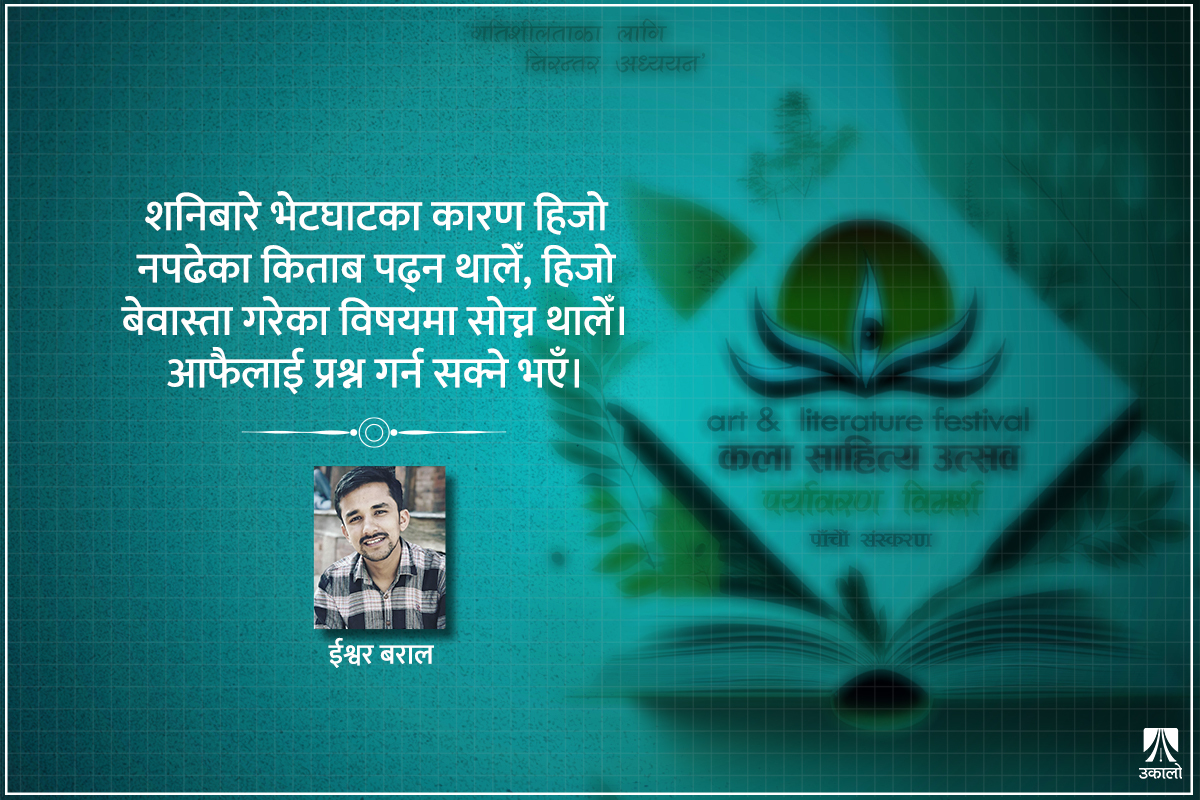 प्रसाईले वर्णन गरिरहेको यो उत्सव कस्तो कार्यक्रम हो भनेर ठम्याउन मलाई हम्मे परिरह्यो। दुई वर्षपहिले नै यस्तै प्रकृतिको कार्यक्रम भइसकेको बताउँदै, यसपटक अझ उन्नत हुने उनी दाबी गर्दै थिए। जति बुझेँ, त्यसका आधारमा अनुमान लगाएँ, झापातिर चलिरहने कविता गोष्ठी र भाषणबाजीका कार्यक्रमभन्दा पक्कै भिन्न होला।