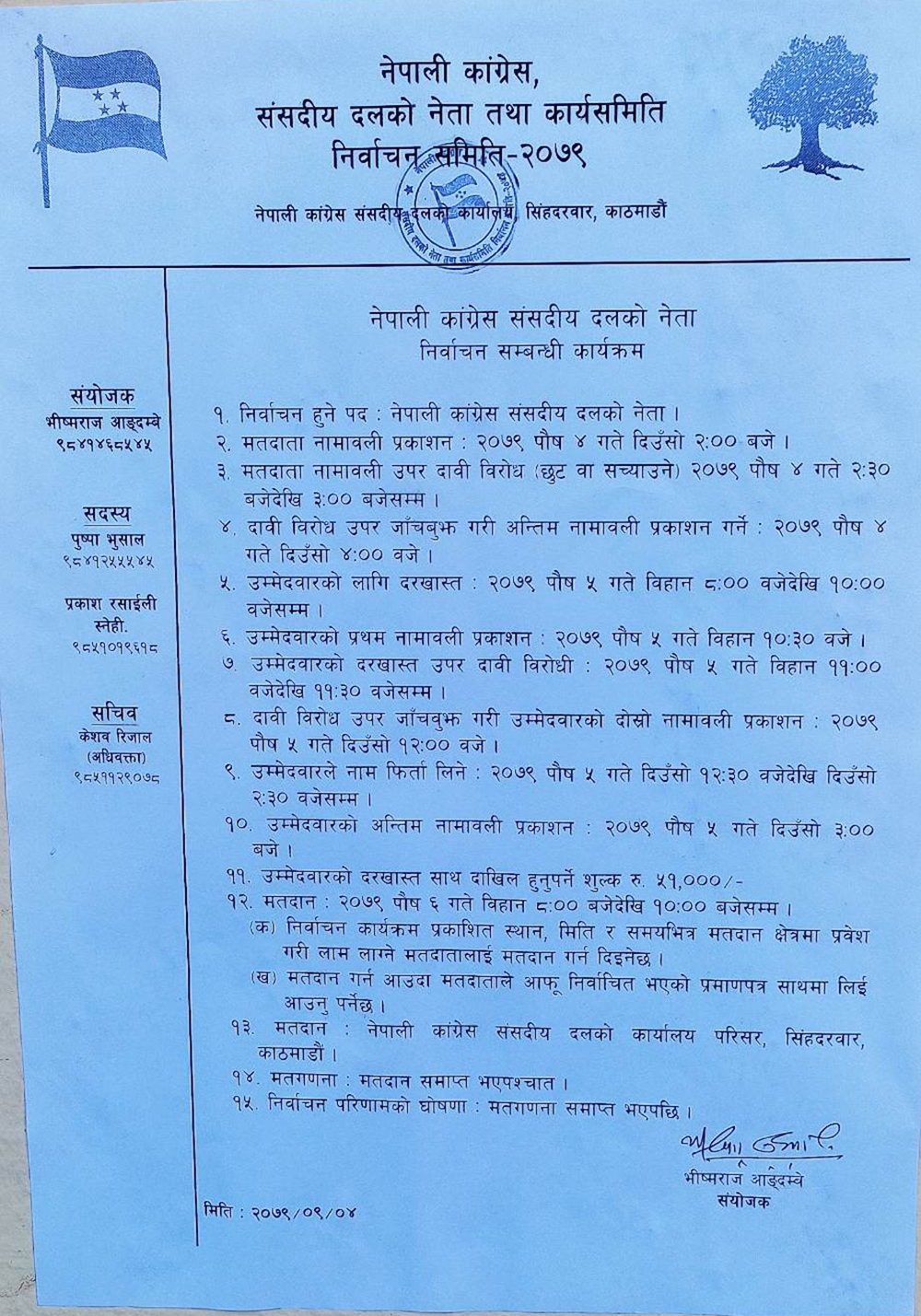 पार्टी कार्यालय सानेपामा बसेको बैठकले बुधबार निर्वाचन गर्ने निर्णय गरेको हो। आइतबार बसेको केन्द्रीय कार्यसम्पादन समितिको बैठकले निर्वाचनका लागि समिति बनाउने निर्णय गरेको थियो। सहमहामन्त्री भीष्मराज आङदेम्बेको संयोजकत्वमा रहेको समितिमा केन्द्रीय सदस्यहरू पुष्पा भुसाल र प्रकाश रसाइली स्नेही सदस्य छन्।