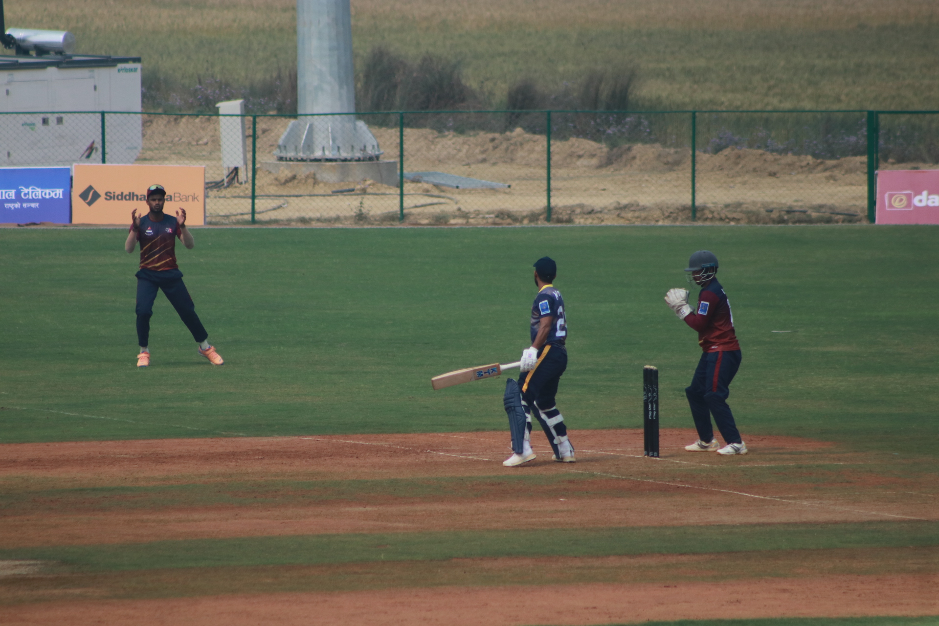 यस्तै, विनोद भण्डारीले ५० बल खेल्ने क्रममा ५ चौका प्रहार गरी अविजित ४७ रन बनाए। तीर्थराज दासले ३६, विवेक यादवले ३० र कुशल मल्लले २६ रन बनाए।