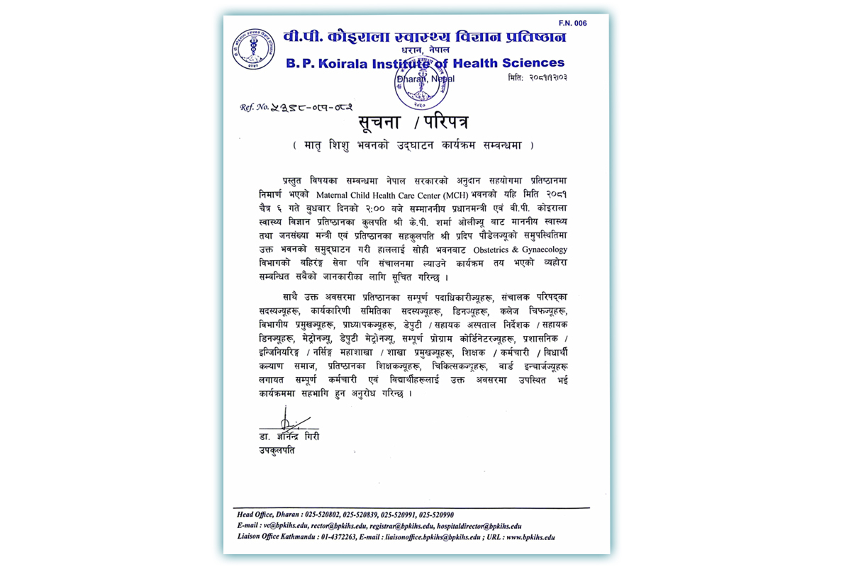 एमसीएच भवन उद्घाटनका अवसरमा प्रतिष्ठानका सम्पूर्ण पदाधिकारी, कार्यकारिणी समिति सदस्य, डिन, कलेज चिफसहित सबैलाई अनिवार्य उपस्थित हुन उपकुलपति डा. गिरीले आइतबारै परिपत्र जारी गरिसकेका छन्।पानी, बिजुलीसमेत नरहेको भवनमा हतार गरेर उद्घाटनको कार्यक्रम राखिएको बारेमा प्रतिष्ठानका सहप्रवक्ता डा. अभिजित किनरले उकालोसँग भने, “धरानमा पानी कहाँ छ र? कतै छैन नि। बिजुली भने अस्थायी रूपमा जोडिएको छ।”