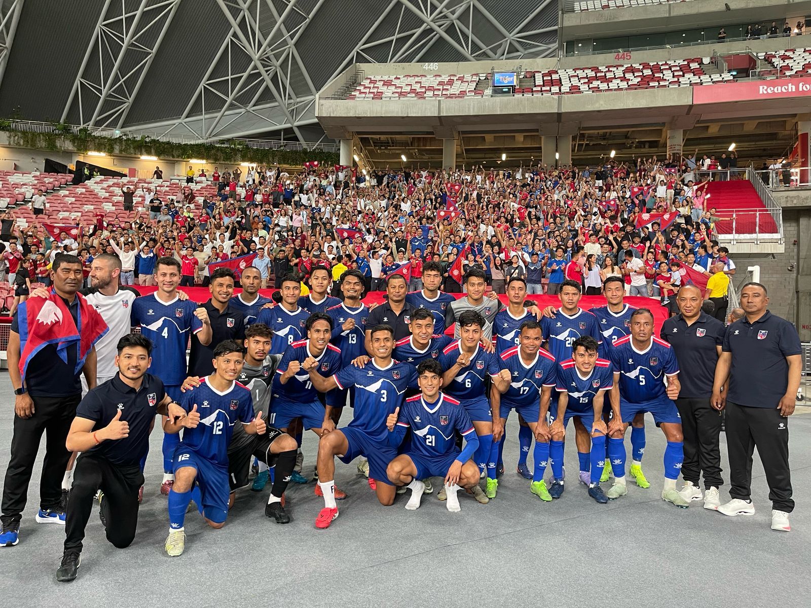 काठमाडौँ– अन्तर्राष्ट्रिय मैत्रीपूर्ण खेलमा नेपालले सिंगापुरलाई पराजित गरेको छ। सिंगापुर नेसनल स्टेडियममा शुक्रबार साँझ भएको खेलमा नेपालले सिंगापुरमाथि ऐतिहासिक जित हात पारेको हो।