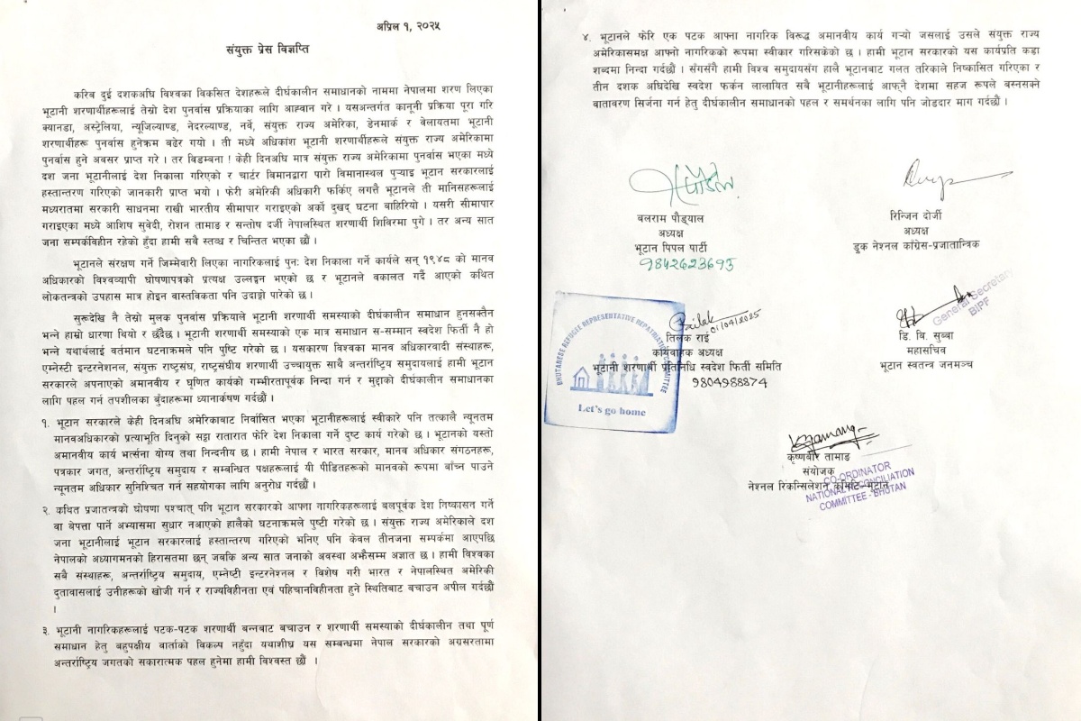 संयुक्त विज्ञप्तिमा भुटान पिपल पार्टीका अध्यक्ष बलराम पौड्याल, भुटानी शरणार्थी प्रतिनिधि स्वदेश फिर्ती समितिका कार्यवाहक अध्यक्ष तिलक राई, ड्रुक नेसनल कांग्रेस(प्रजातान्त्रिक) अध्यक्ष रिन्जिन दोर्जी, भुटान स्वतन्त्र जनमञ्चका महासचिव डीबी सुब्बा र नेशनल रिकन्सिलेसन कमिटी–भुटानका संयोजक कृष्णवीर तामाङले हस्ताक्षर गरेका छन्।