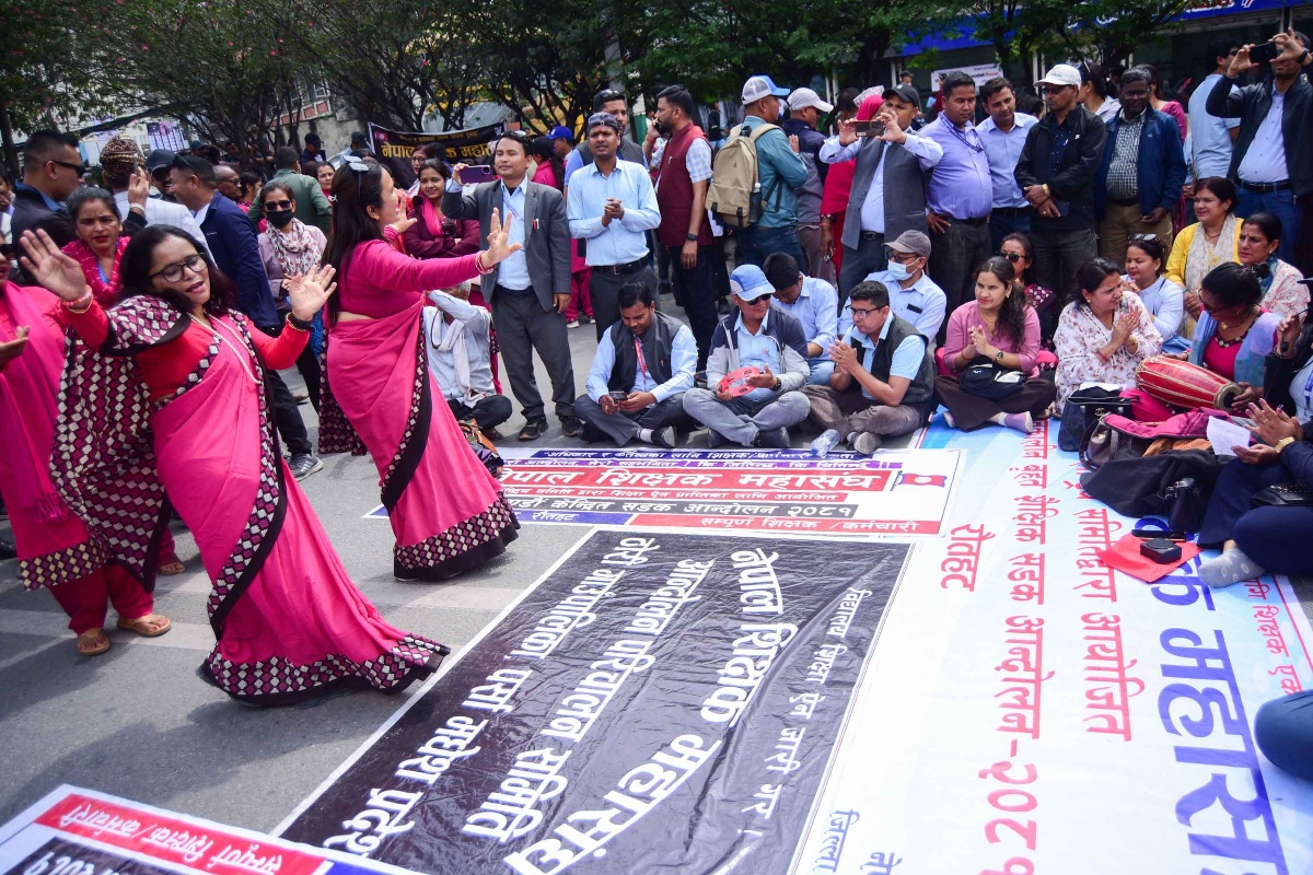 काठमाडौँ– नेपाल सरकार र नेपाल शिक्षक महासंघबीच विगतमा भएका सम्झौता कार्यान्वयनको माग गर्दै राजधानीकेन्द्रित शिक्षक आन्दोलन शनिबार पनि जारी रह्यो। प्रत्येक दिन बिहान ११ः०० बजे माइतीघर–बबरमहलमा भेला भई जिल्लागत रूपमा ब्यानरसहित जुलुस प्रदर्शन, सडकमै भाषण, गीतसंगीत र नाचगान गर्नु आन्दोलनरत शिक्षकको दिनचर्या नै बनेको छ।