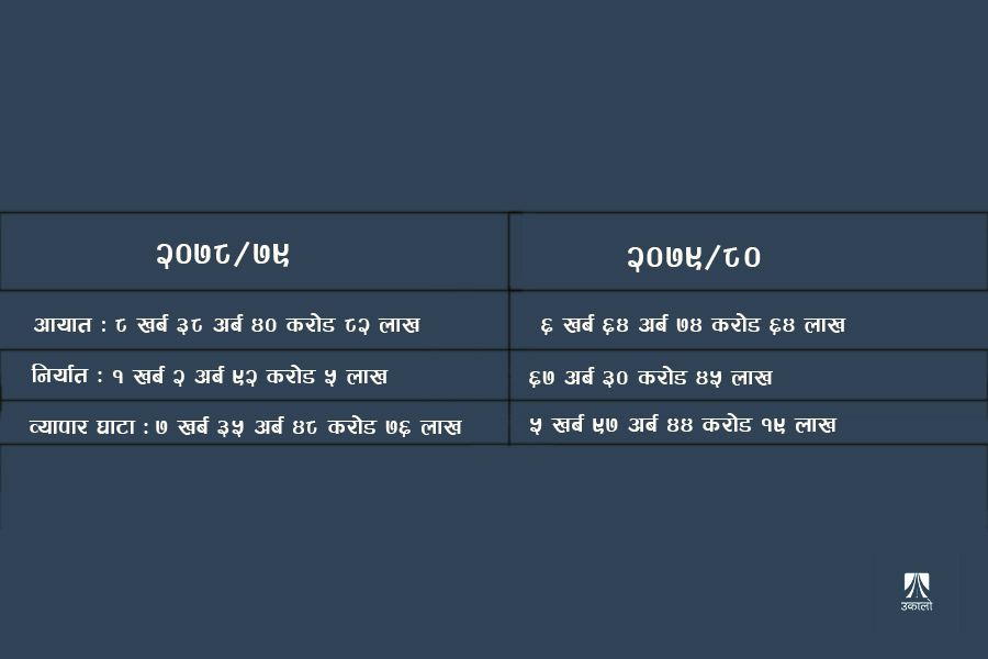 चालु आर्थिक वर्षको उक्त अवधिमा आयात २०.७१ प्रतिशतले घटेर ६ खर्ब ६४ अर्ब ७४ करोड ६४ लाखमा झरेको छ। निर्यातमा पनि ३४.६१ प्रतिशतले कमी आएको छ। अघिल्लो वर्षमा सो अवधिमा १ खर्ब बढीको निर्यात गरेको नेपालले चालु आर्थिक वर्षमा भने ६७ अर्बमा मात्र सीमित भएको छ। पछिल्लो मंसिरमा १२ अर्ब ५३ करोड रुपैयाँबराबरको मात्र निर्यात भएको विभागको तथ्यांकले देखाउँछ।