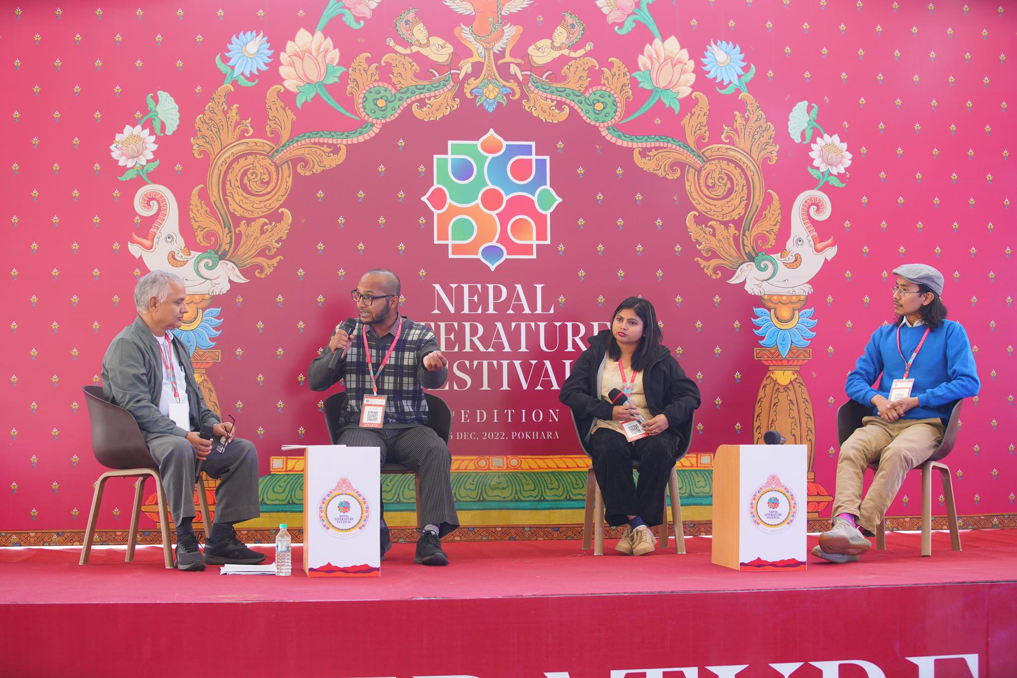 पोखरा– नेपाल लिटेरचर फेस्टिभलअन्तर्गत तेस्रो दिनको पहिलो सेसन ‘दुर्गमका सर–मिस’मा उभ्याइएको थियो, स्वयंसेवक शिक्षक मोइन उद्दीन, गुञ्जन मिस (लुइँटेल) र मिङ्मा तेन्जिङ केसी। सेसनको सहजीकरण पत्रकार राजेन्द्र दाहालले गरेका थिए।
