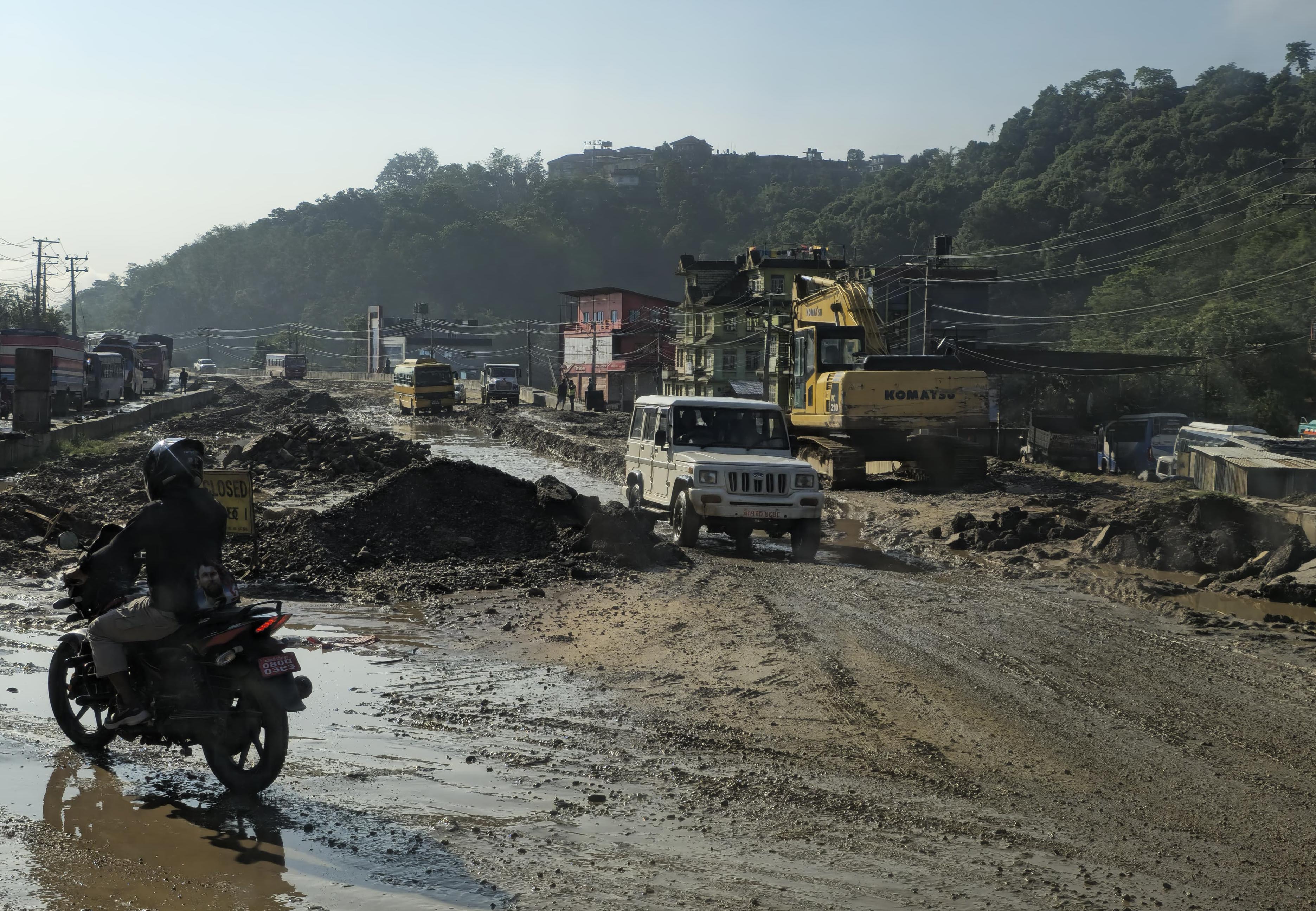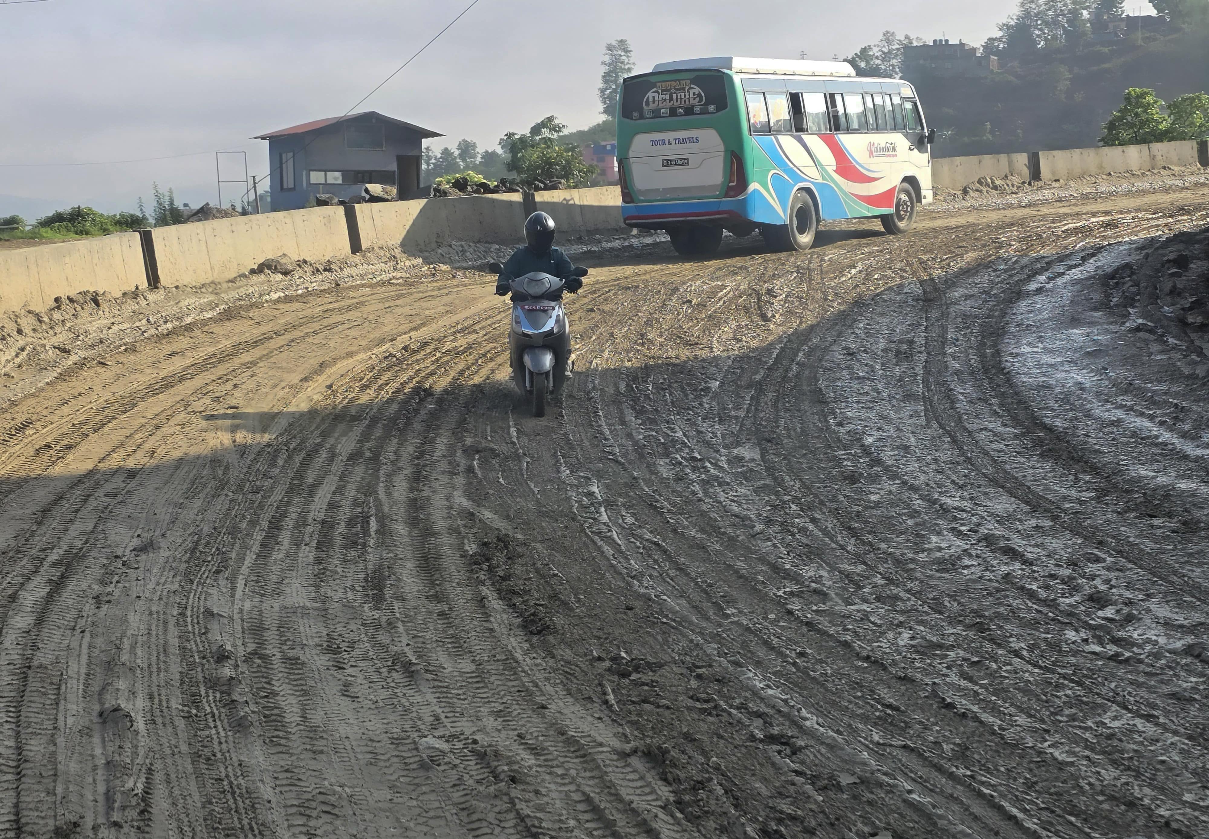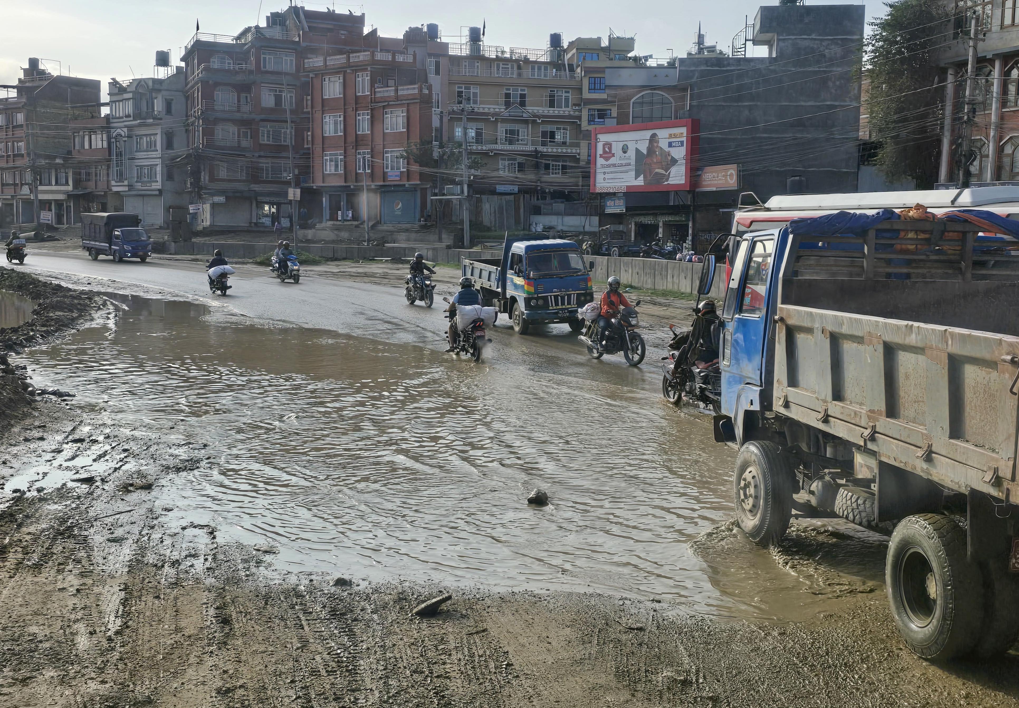 सडकमा रहेको हिलोमा सवारी चिप्लिएर दुर्घटना हुने जोखिम बढेको छ। साँगा–धुलिखेल सडकखण्ड ६ लेनमा विस्तार भइरहेको छ।