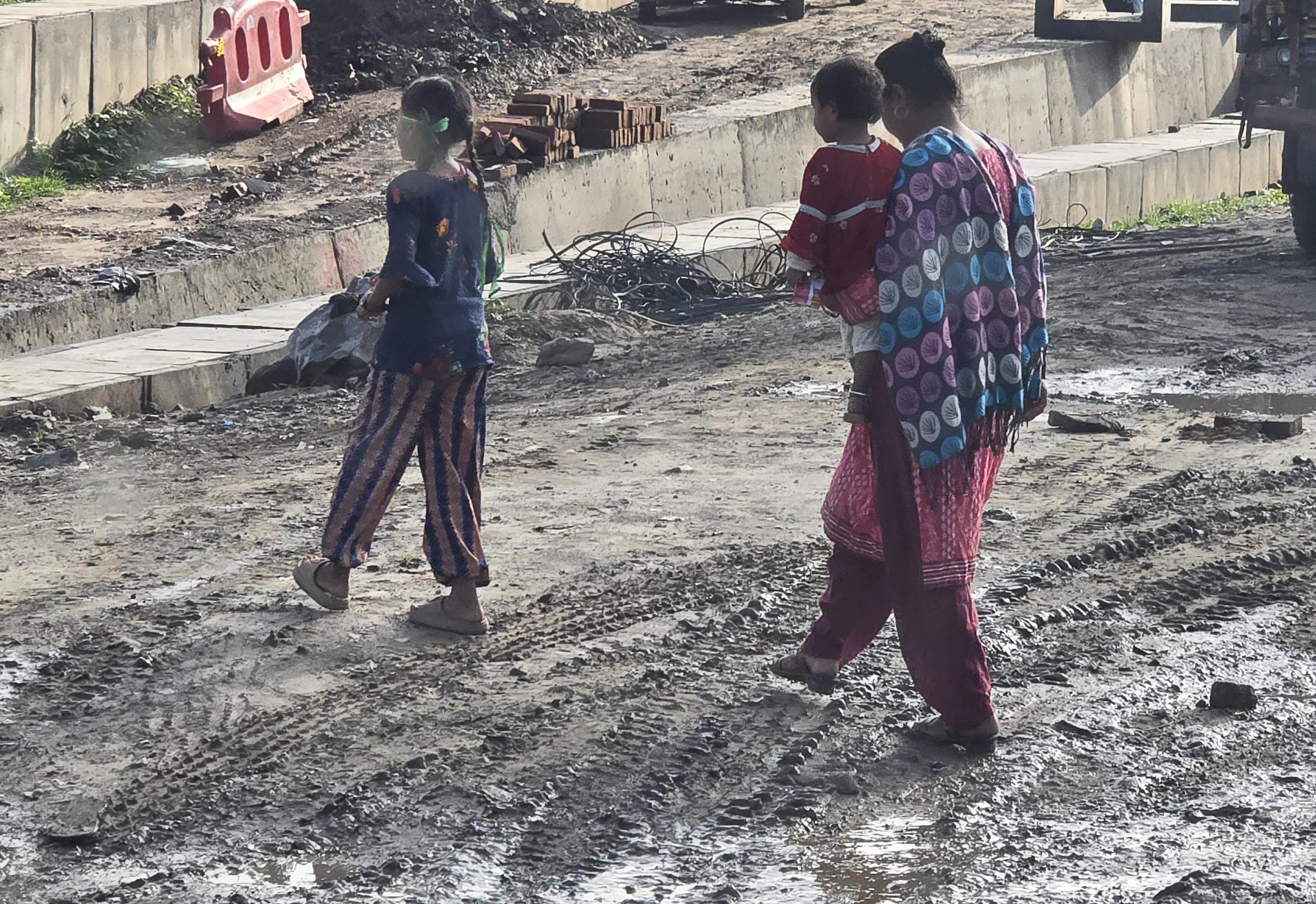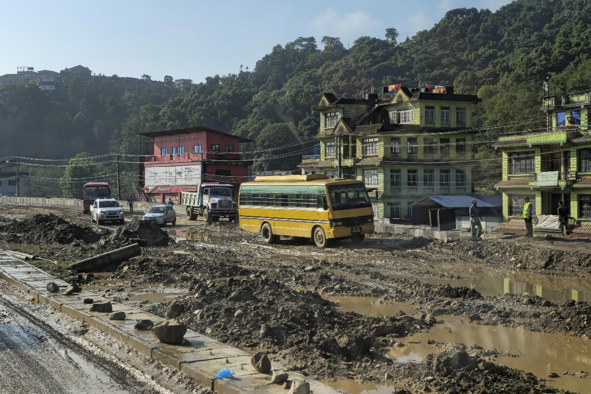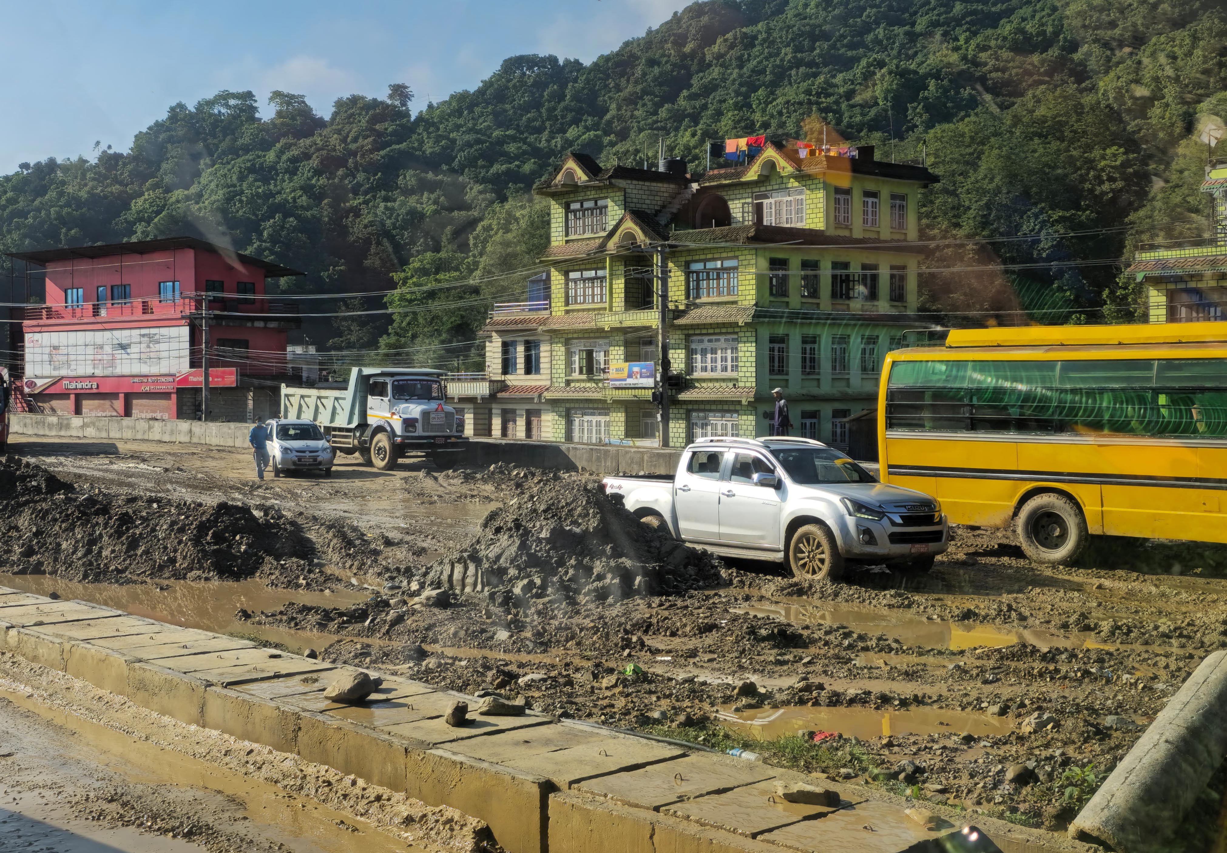 सडकमा रहेको हिलोमा सवारी चिप्लिएर दुर्घटना हुने जोखिम बढेको छ। साँगा–धुलिखेल सडकखण्ड ६ लेनमा विस्तार भइरहेको छ।