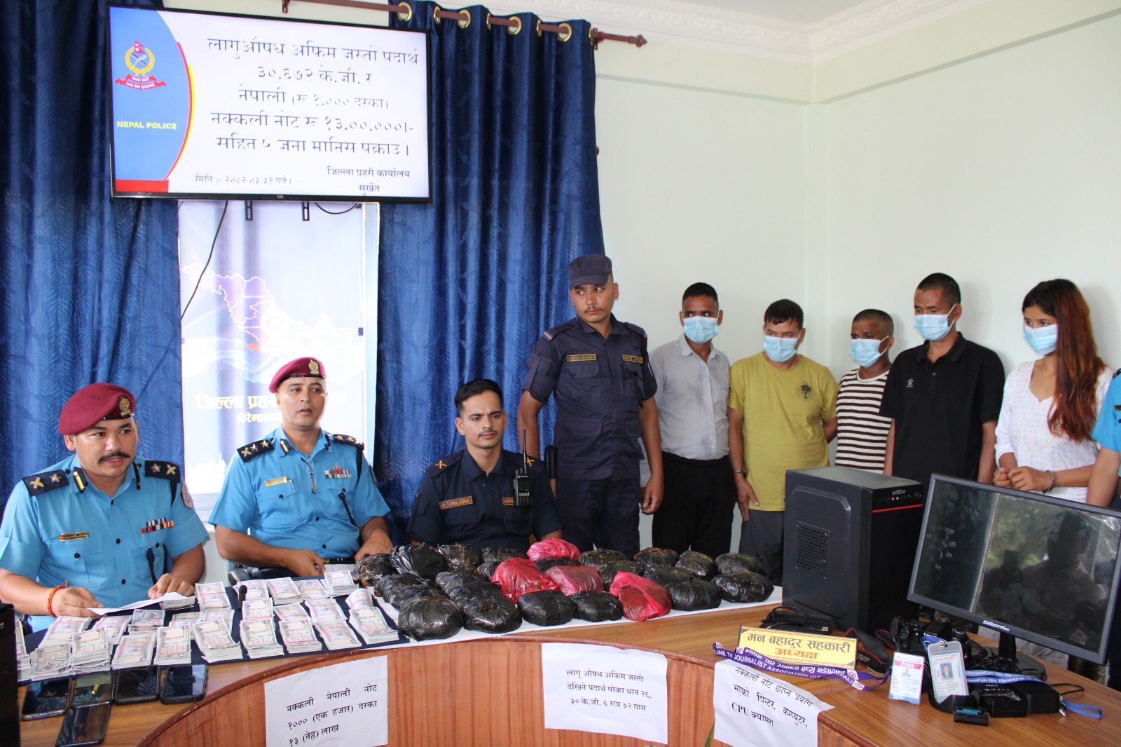 जिल्ला प्रहरी कार्यालय सुर्खेतले १३ लाख नक्कली नोट र ठूलो मात्रामा अफिमसहित नक्कली नोट छाप्ने तथा लागुऔषध कारोबारमा संलग्न ५ जनालाई पक्राउ गरेको छ।