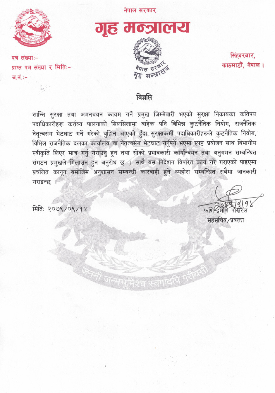 गृह मन्त्रालयका प्रवक्ता सहसचिव फणीन्द्रमणि पोखरेलले सुरक्षाकर्मी पदाधिकारीले भेटघाट गर्नुपर्ने भएमा स्पष्ट प्रयोजन खुलाइ विभागीय स्वीकृति लिनुपर्ने जानकारी गराएका छन्।