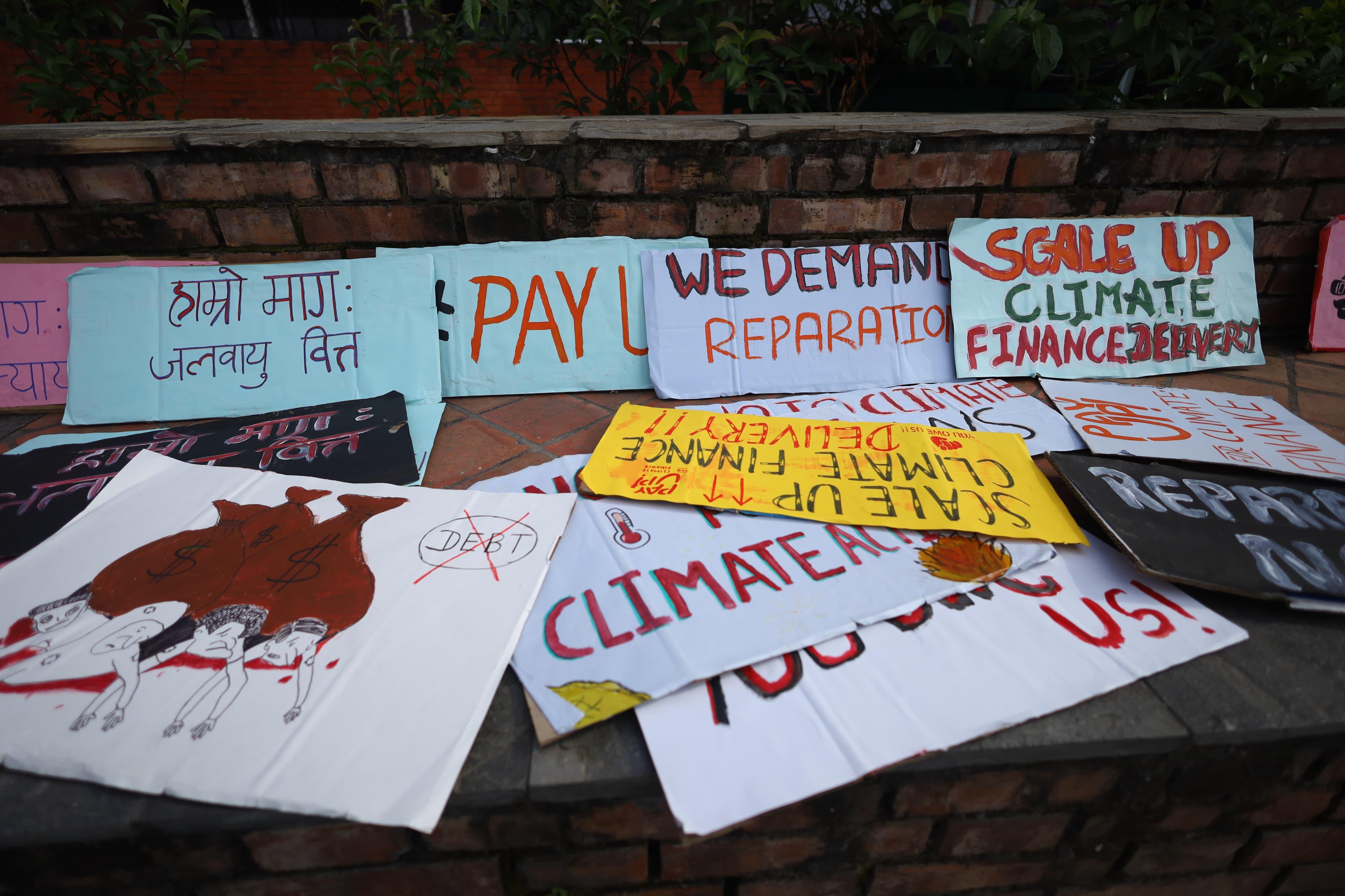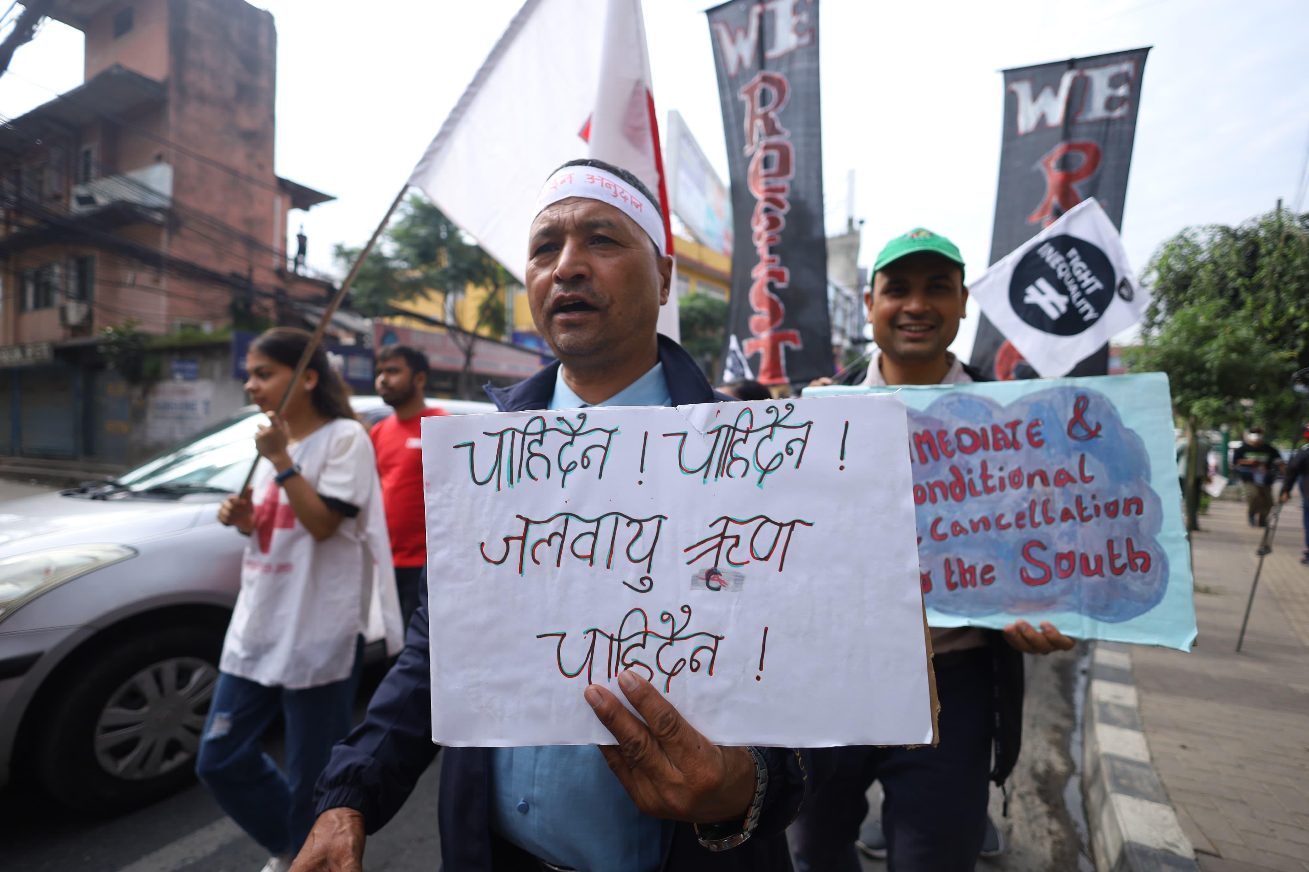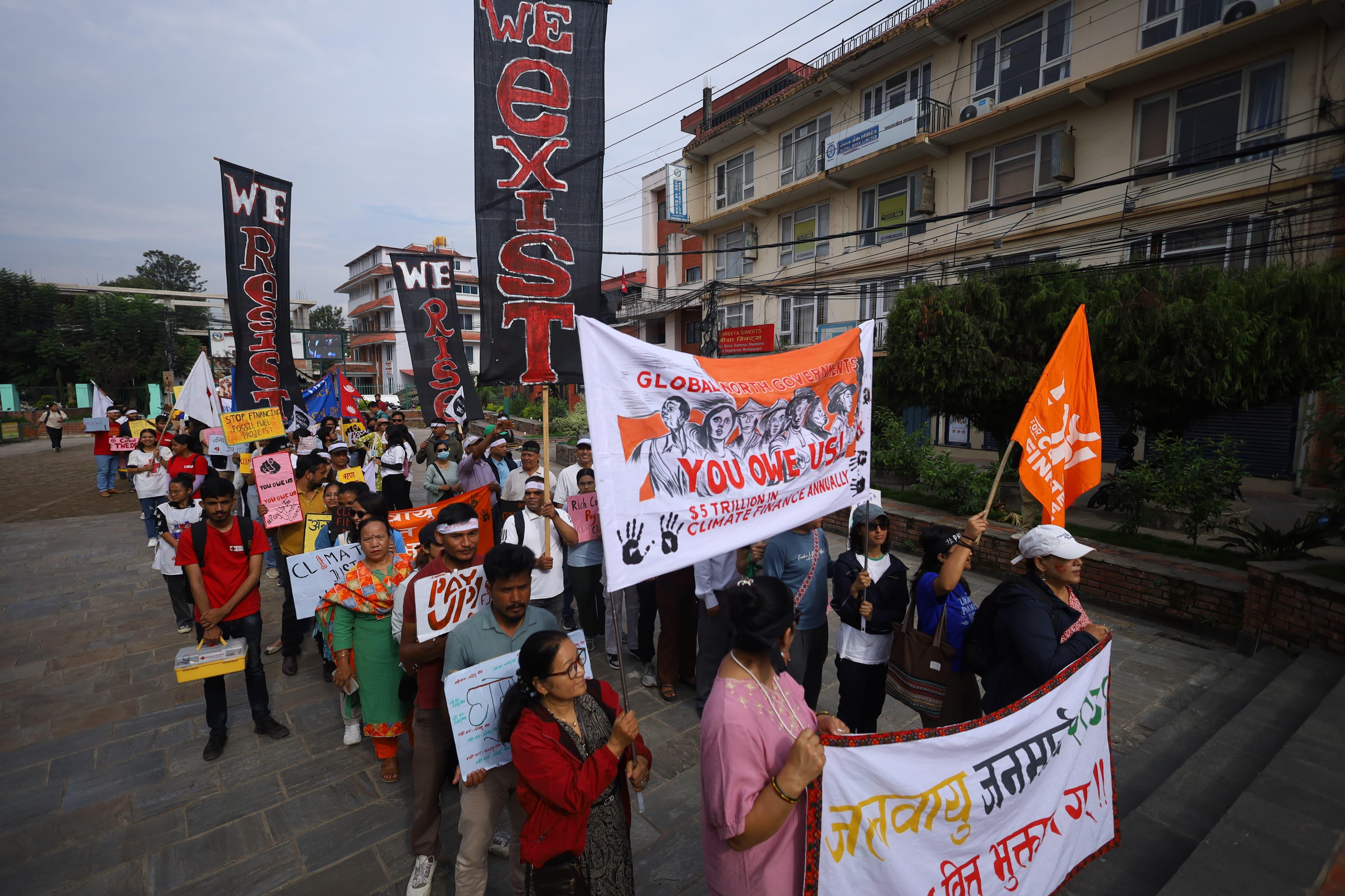 जलवायु न्यायको माग गर्दै युवाहरूले ललितपुरको जावलाखेलमा ‘पिल्स क्लाइमेट मार्च २०२४’ गरेका छन्। र्यालीमा सहभागीले विकसित मुलुकहरू खनिज, पेट्रोलियम एवं औद्योगिक उत्सर्जनबाट प्रदूषण बढाउन मुख्य जिम्मेवार रहेको र यसको मारमा नेपाल जस्ता राष्ट्र परेको भन्दै क्षतिपूर्ति तिर्नुपर्ने माग गरेका छन्। विकसित देशले नेपाल जस्तो कम हरितगृह ग्यास उत्सर्जन गर्ने देशलाई तिर्नुपर्ने दायित्व पनि ऋणका रूपमा दिन खोजेको भन्दै विरोध गरेका छन्। तस्वीर: नेपाल फोटो लाइब्रेरी