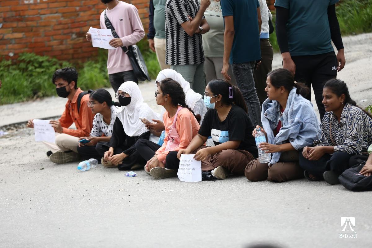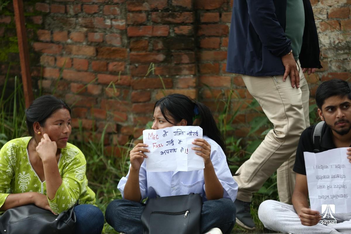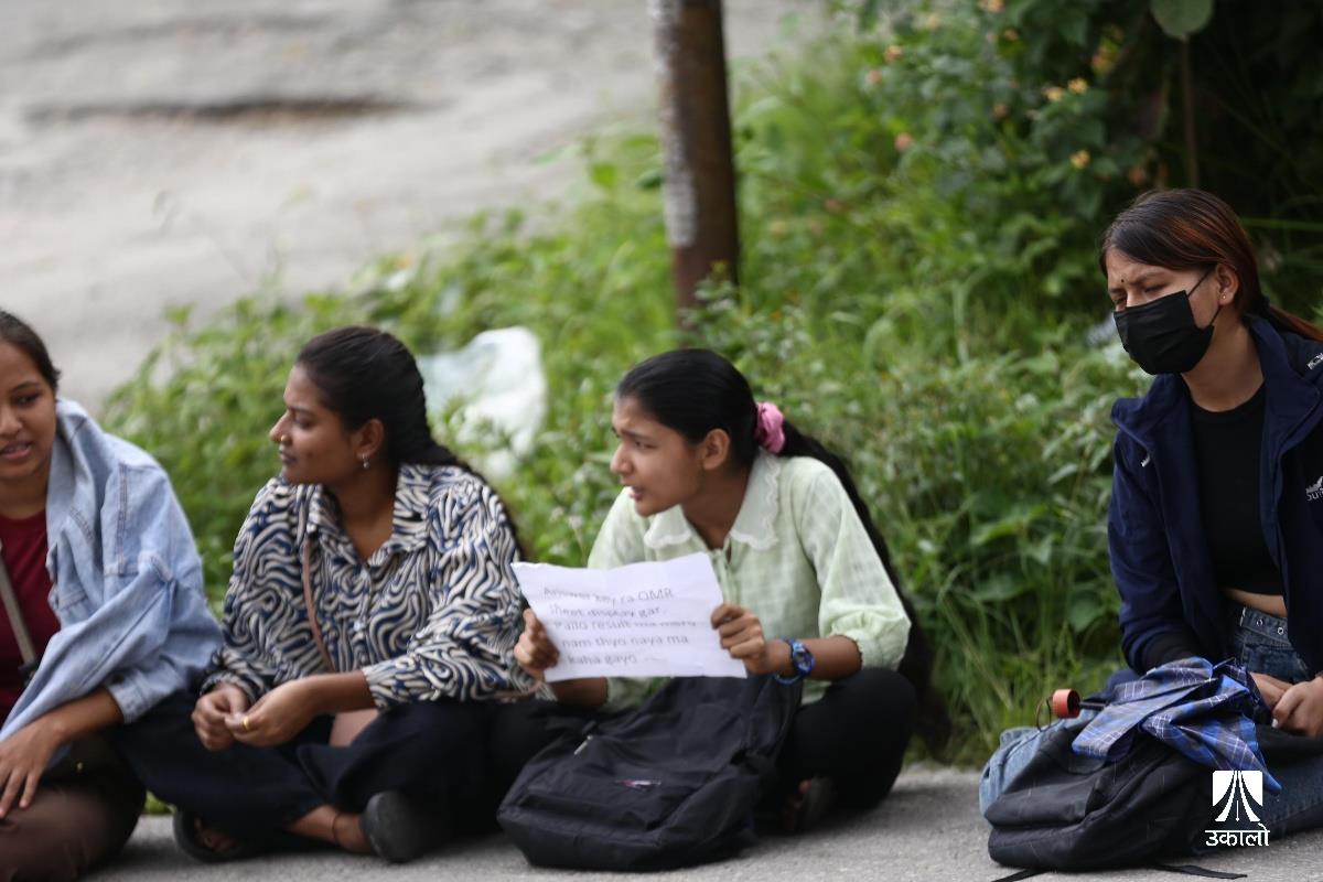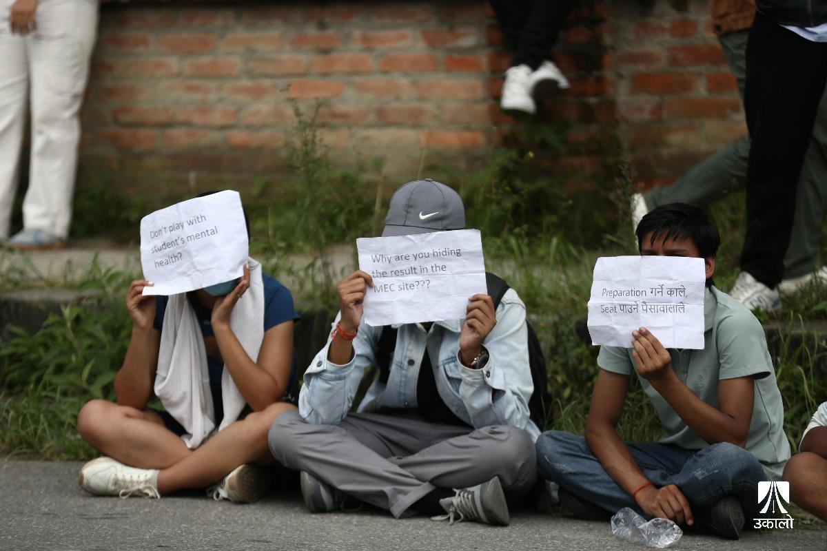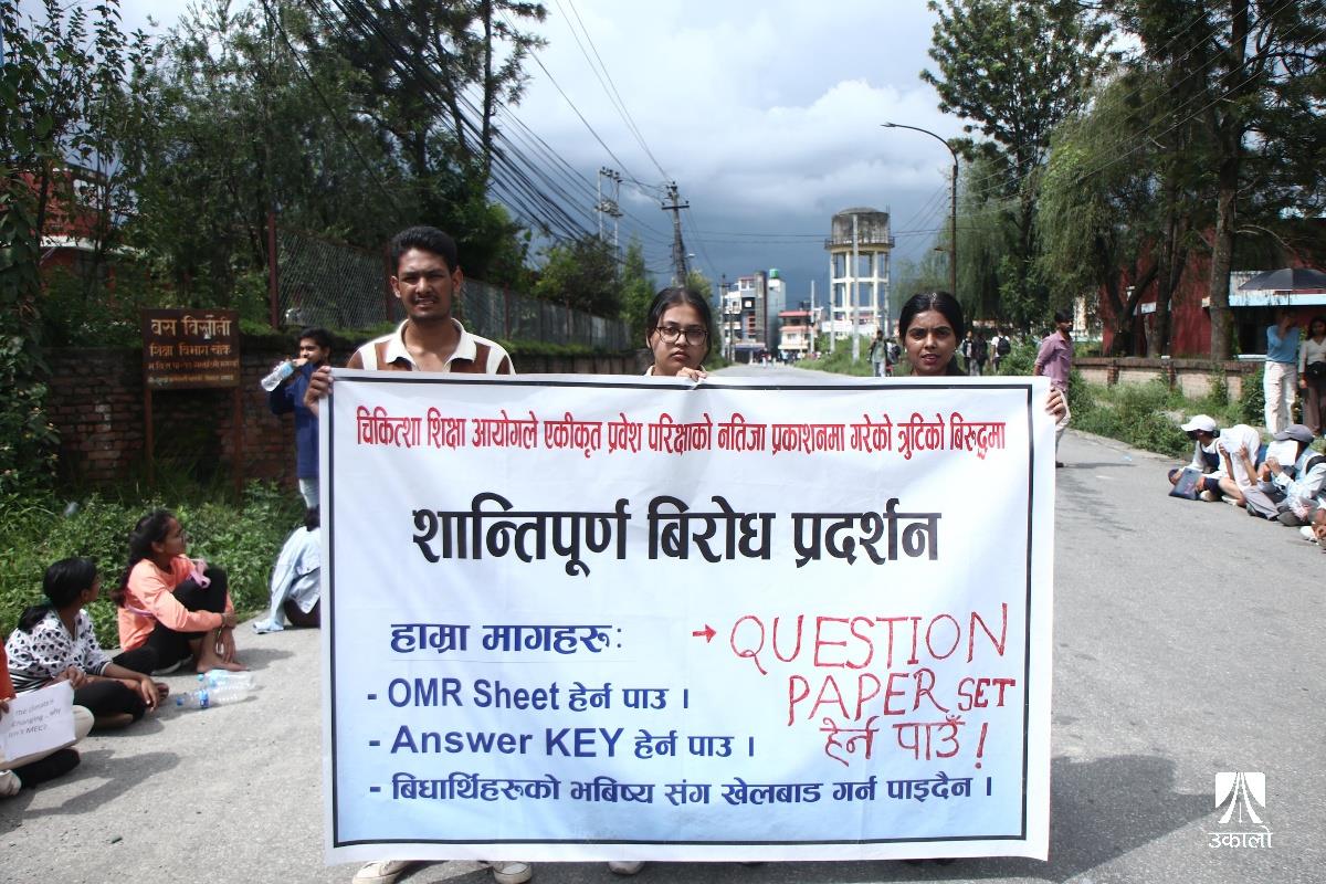 विद्यार्थीहरूले चिकित्सा शिक्षा आयोगको एकीकृत प्रवेश परीक्षाको नतिजा प्रकाशनमा त्रुटि भएको भन्दै विरोध प्रदर्शन गरेका छन्। आयोगले एकीकृत प्रवेश परीक्षाको नतिजा प्रकाशनमा त्रुटि गरेको भन्दै चिकित्सा शिक्षा अगाडि एमबीबीएस र पारामेडिकल प्रवेश परीक्षा दिएका विधार्थीले विरोध प्रदर्शन गरेका हुन्। उनीहरूले ‘प्रश्नपत्र सेट’, ‘ओएमआर सिट’, ‘एन्सर कि’ हर्न पाउनुपर्ने माग राखेका छन्। उनीहरूले ‘विद्यार्थीको भविष्यसँग खेलवाड गर्न पाइँदैन’, ‘एमइसीले गल्ती नहेराइ फेल गर्नु नै अपराध हो’, ‘विद्यार्थीको भविष्य निर्धारण गर्ने जस्तो परीक्षामा राजनीति चल्दैन। चल्दैन’, ‘प्रिपेरेसन गर्ने काले, सिट पाउने पैसावाले’ लगायतका नारा लेखिएका प्लाकार्ड बोकेका थिए। तस्वीर : नेपाल फोटो लाइब्रेरी