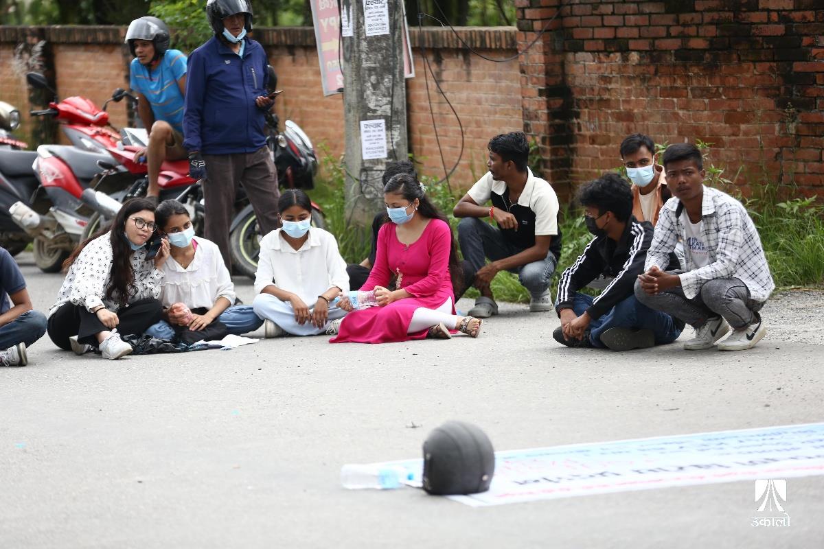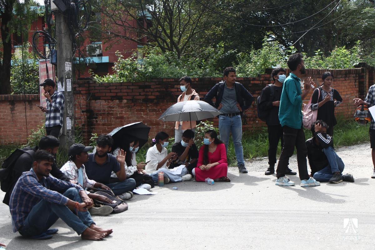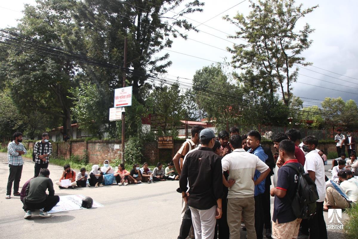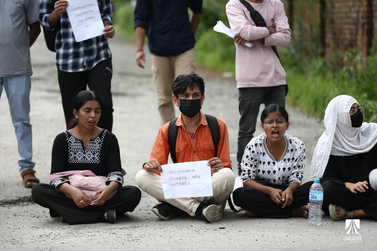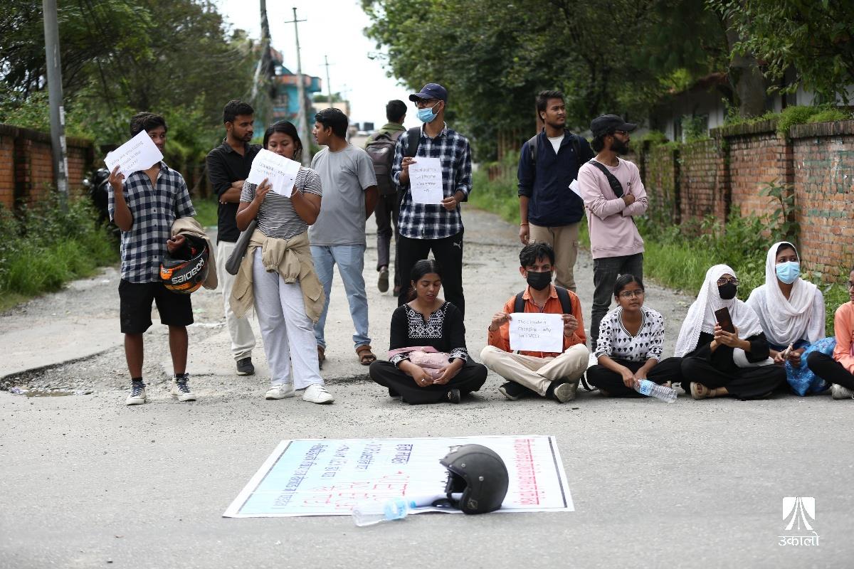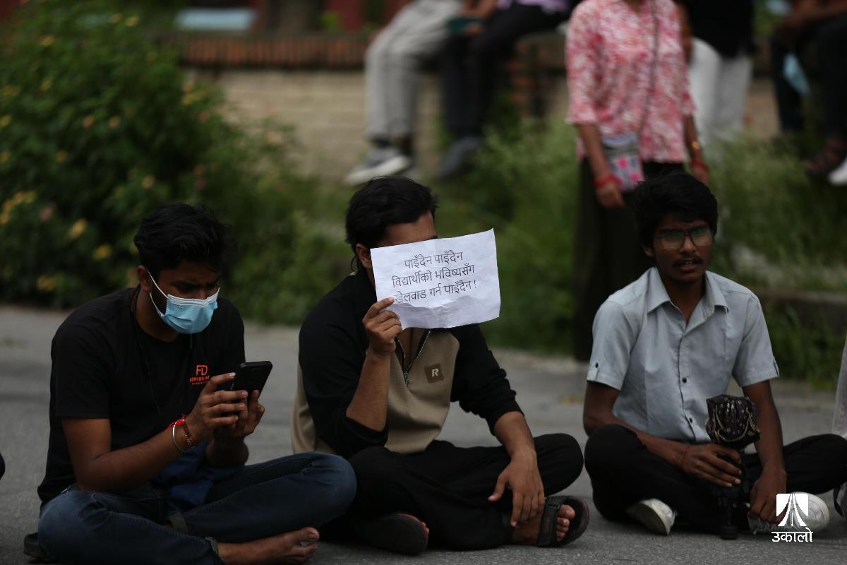 विद्यार्थीहरूले चिकित्सा शिक्षा आयोगको एकीकृत प्रवेश परीक्षाको नतिजा प्रकाशनमा त्रुटि भएको भन्दै विरोध प्रदर्शन गरेका छन्। आयोगले एकीकृत प्रवेश परीक्षाको नतिजा प्रकाशनमा त्रुटि गरेको भन्दै चिकित्सा शिक्षा अगाडि एमबीबीएस र पारामेडिकल प्रवेश परीक्षा दिएका विधार्थीले विरोध प्रदर्शन गरेका हुन्। उनीहरूले ‘प्रश्नपत्र सेट’, ‘ओएमआर सिट’, ‘एन्सर कि’ हर्न पाउनुपर्ने माग राखेका छन्। उनीहरूले ‘विद्यार्थीको भविष्यसँग खेलवाड गर्न पाइँदैन’, ‘एमइसीले गल्ती नहेराइ फेल गर्नु नै अपराध हो’, ‘विद्यार्थीको भविष्य निर्धारण गर्ने जस्तो परीक्षामा राजनीति चल्दैन। चल्दैन’, ‘प्रिपेरेसन गर्ने काले, सिट पाउने पैसावाले’ लगायतका नारा लेखिएका प्लाकार्ड बोकेका थिए। तस्वीर : नेपाल फोटो लाइब्रेरी