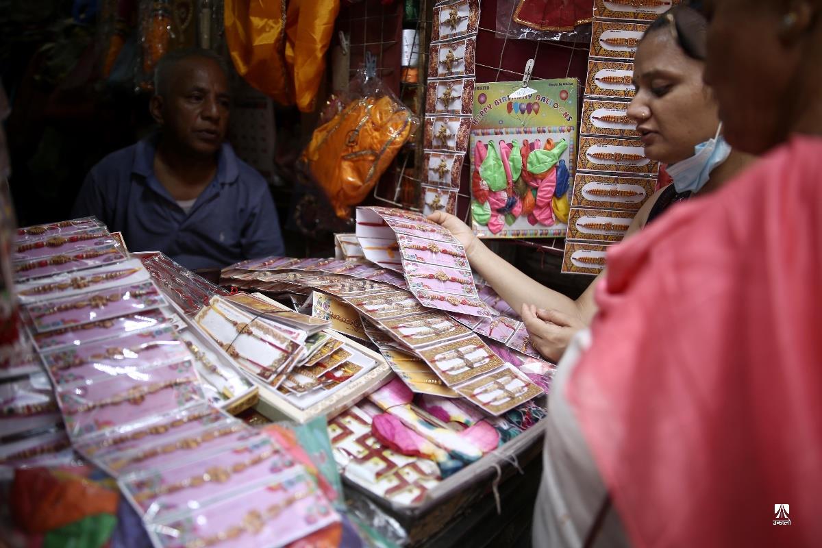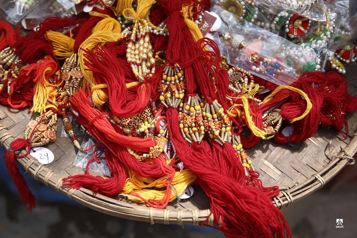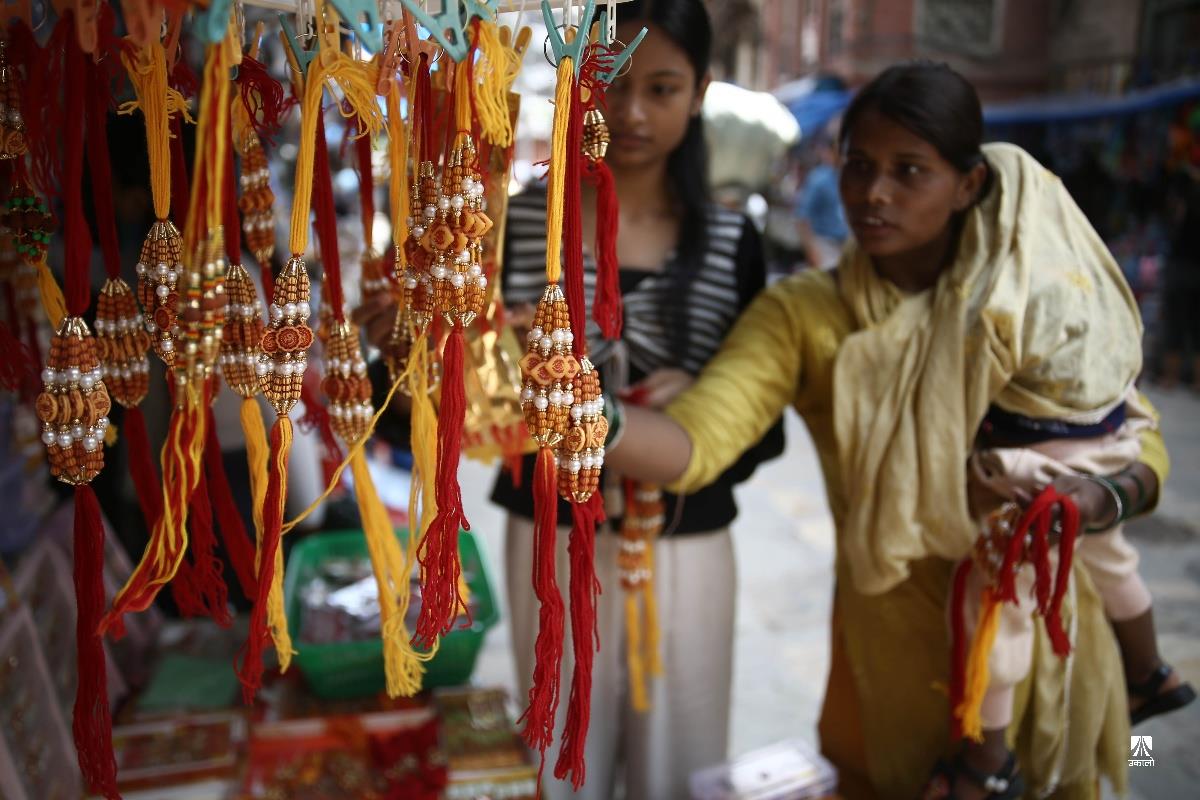 प्रत्येक वर्ष श्रावण शुक्ल पूर्णिमाका दिनमा मनाइने उपाकर्म, ऋषितर्पणी र रक्षा बन्धन यस वर्ष भदौ ३ गते परेको छ। यस पर्वमा विधिपूर्वक स्नान, ऋषि तर्पण, जनै परिवर्तन साथै हातमा डोरो बाँधी मनाइन्छ। सत्ययुगमा दानवद्वारा लखेटिएका देवगणलाई गुरु वृहस्पतिले रक्षा विधान तयार गरी बलशाली दानवराज बली बाँधिए, त्यसैले म तिमीलाई बाँध्छु, यसले तिमी सुरक्षित बन तथा विचलित नहोऊ भनी डोरो बाँधेर जोगाएका थिए भन्ने पौराणिक मान्यताका आधारमा चलेको रक्षा बन्धनको परम्परा आज पनि प्रचलित छ। यही अवसरमा राजधानीको असन, इन्द्रचोकको बजारमा जनैका लागि डोरो तथा आफ्नो दाजुभाइका लागि राखी किन्ने सर्वसाधारणको बाक्लो भीड लागेको छ। अहिले बजारमा प्रतिगोटा राखीको ३०, ५०, १०० र सोभन्दा बढी मूल्यको पनि बिक्री भइरहेको छ भने डोरोको मूल्य १०० वटाको ५०० रुपैयाँमा बिक्री भइरहेको व्यापारी बताउँछन्। तस्वीर : नेपाल फोटो लाइब्रेरी