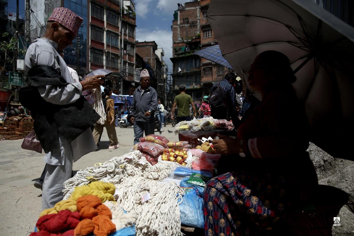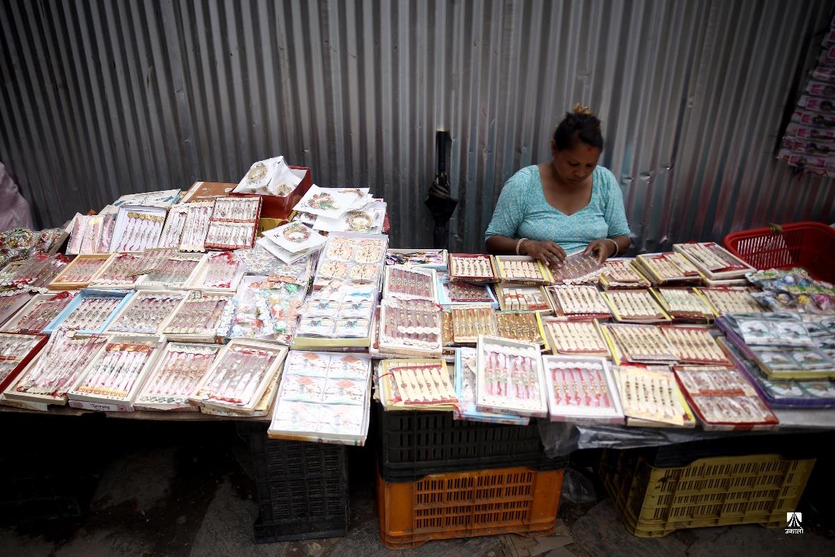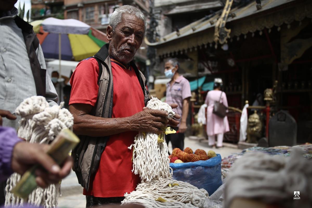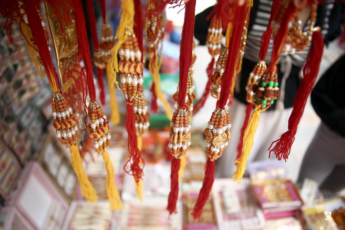 प्रत्येक वर्ष श्रावण शुक्ल पूर्णिमाका दिनमा मनाइने उपाकर्म, ऋषितर्पणी र रक्षा बन्धन यस वर्ष भदौ ३ गते परेको छ। यस पर्वमा विधिपूर्वक स्नान, ऋषि तर्पण, जनै परिवर्तन साथै हातमा डोरो बाँधी मनाइन्छ। सत्ययुगमा दानवद्वारा लखेटिएका देवगणलाई गुरु वृहस्पतिले रक्षा विधान तयार गरी बलशाली दानवराज बली बाँधिए, त्यसैले म तिमीलाई बाँध्छु, यसले तिमी सुरक्षित बन तथा विचलित नहोऊ भनी डोरो बाँधेर जोगाएका थिए भन्ने पौराणिक मान्यताका आधारमा चलेको रक्षा बन्धनको परम्परा आज पनि प्रचलित छ। यही अवसरमा राजधानीको असन, इन्द्रचोकको बजारमा जनैका लागि डोरो तथा आफ्नो दाजुभाइका लागि राखी किन्ने सर्वसाधारणको बाक्लो भीड लागेको छ। अहिले बजारमा प्रतिगोटा राखीको ३०, ५०, १०० र सोभन्दा बढी मूल्यको पनि बिक्री भइरहेको छ भने डोरोको मूल्य १०० वटाको ५०० रुपैयाँमा बिक्री भइरहेको व्यापारी बताउँछन्। तस्वीर : नेपाल फोटो लाइब्रेरी