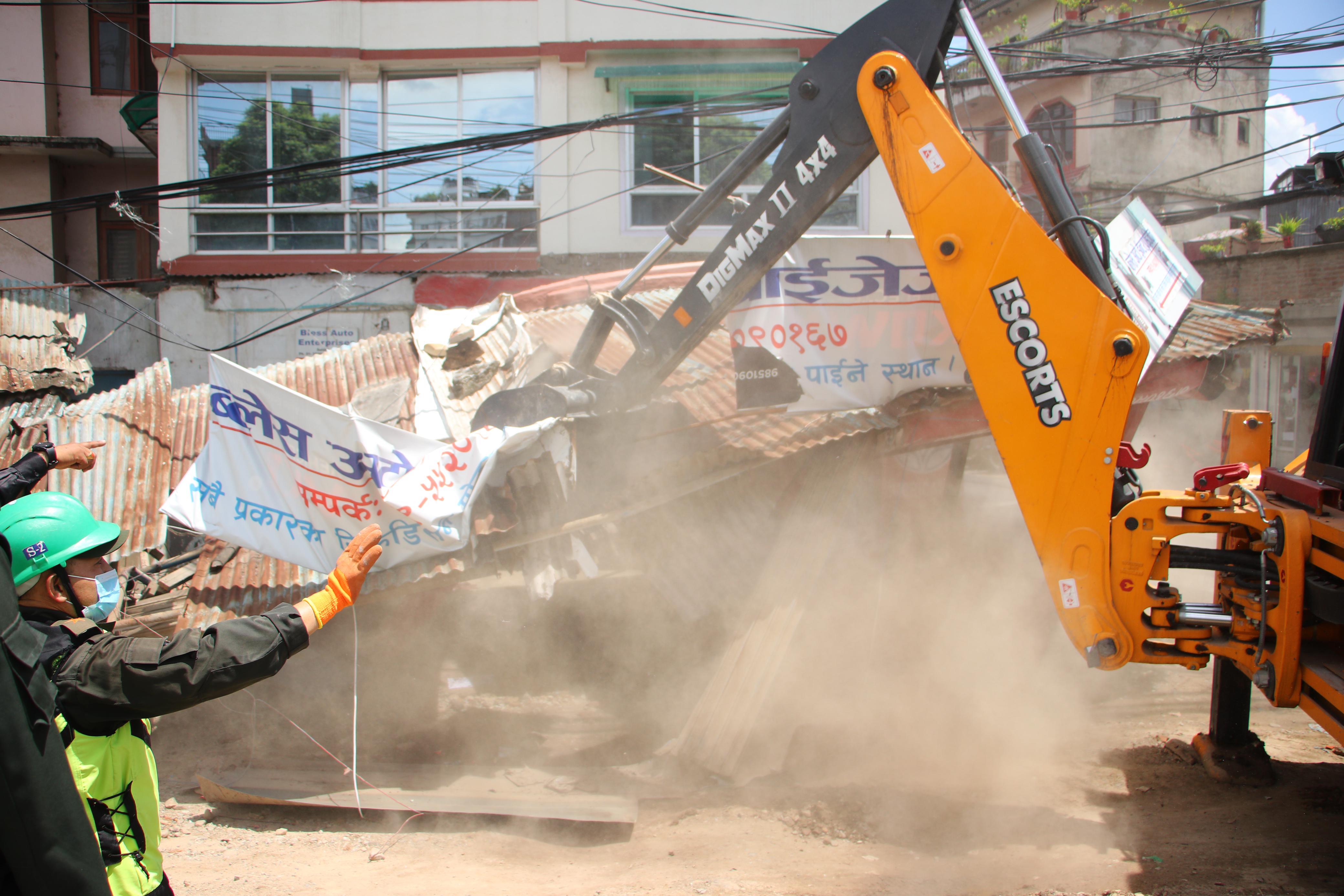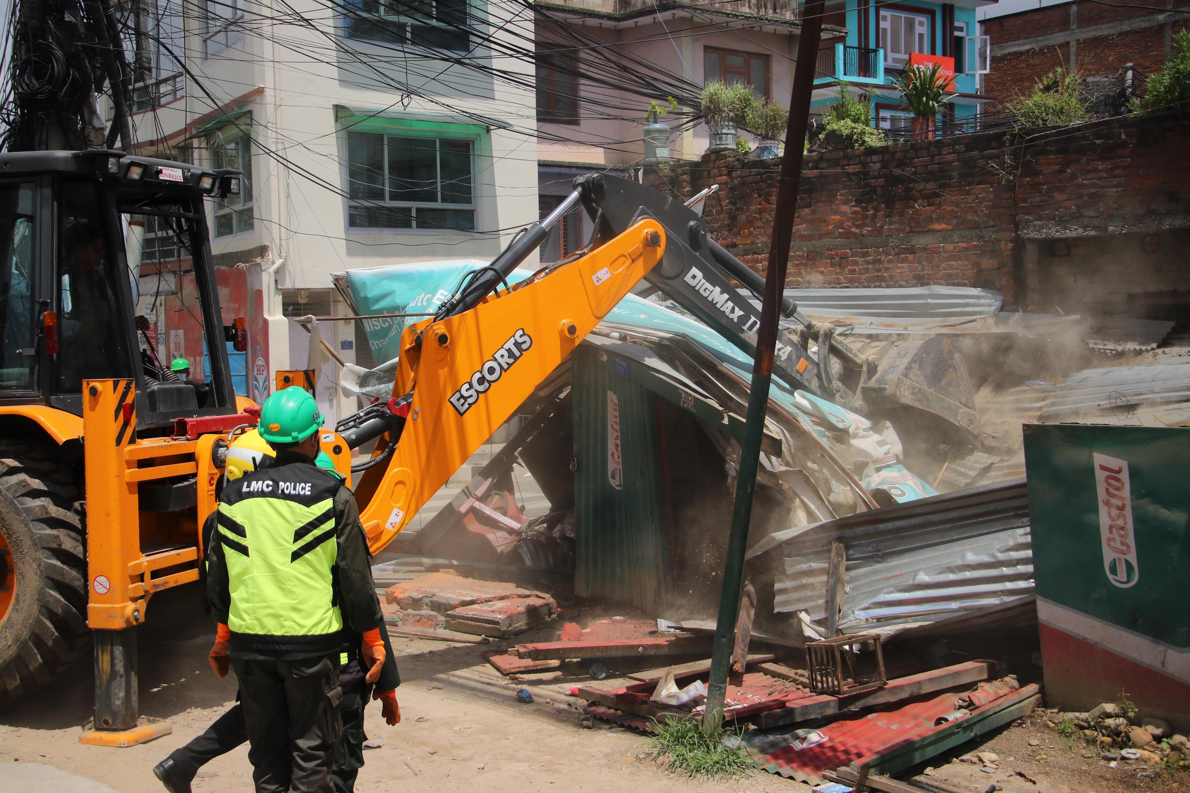 ललितपुर महानगरपालिकाले सातदोबाटोस्थित चक्रपथ छेउमा रहेका टहरामा डोजर चलाएको छ। महानगर प्रहरी बलले बिहीबार बिहान सो क्षेत्रमा रहेका नक्सापास नभएका तीनवटा टहरा भत्काएको हो। तस्वीर: नेपाल फोटो लाइब्रेरी