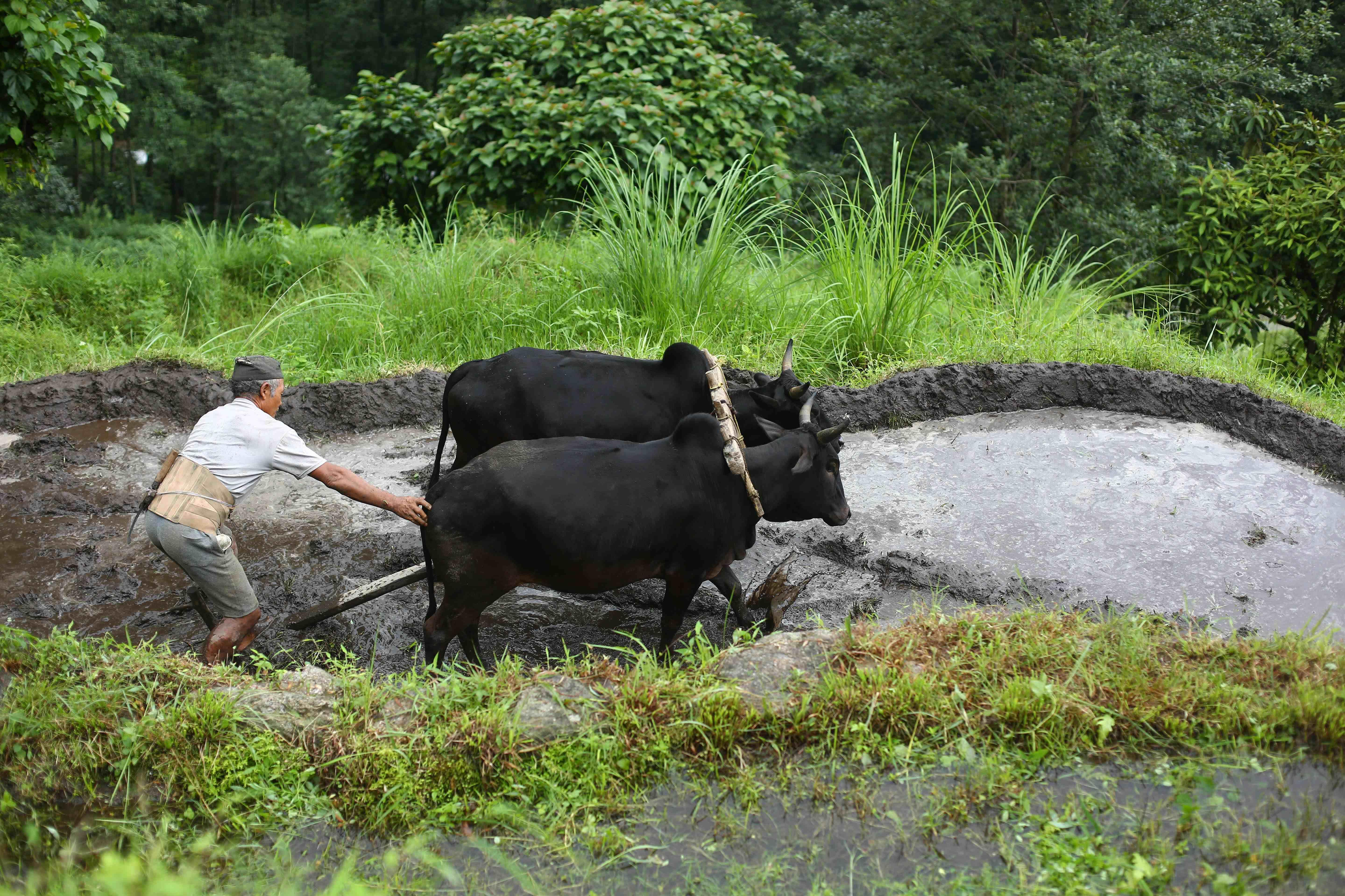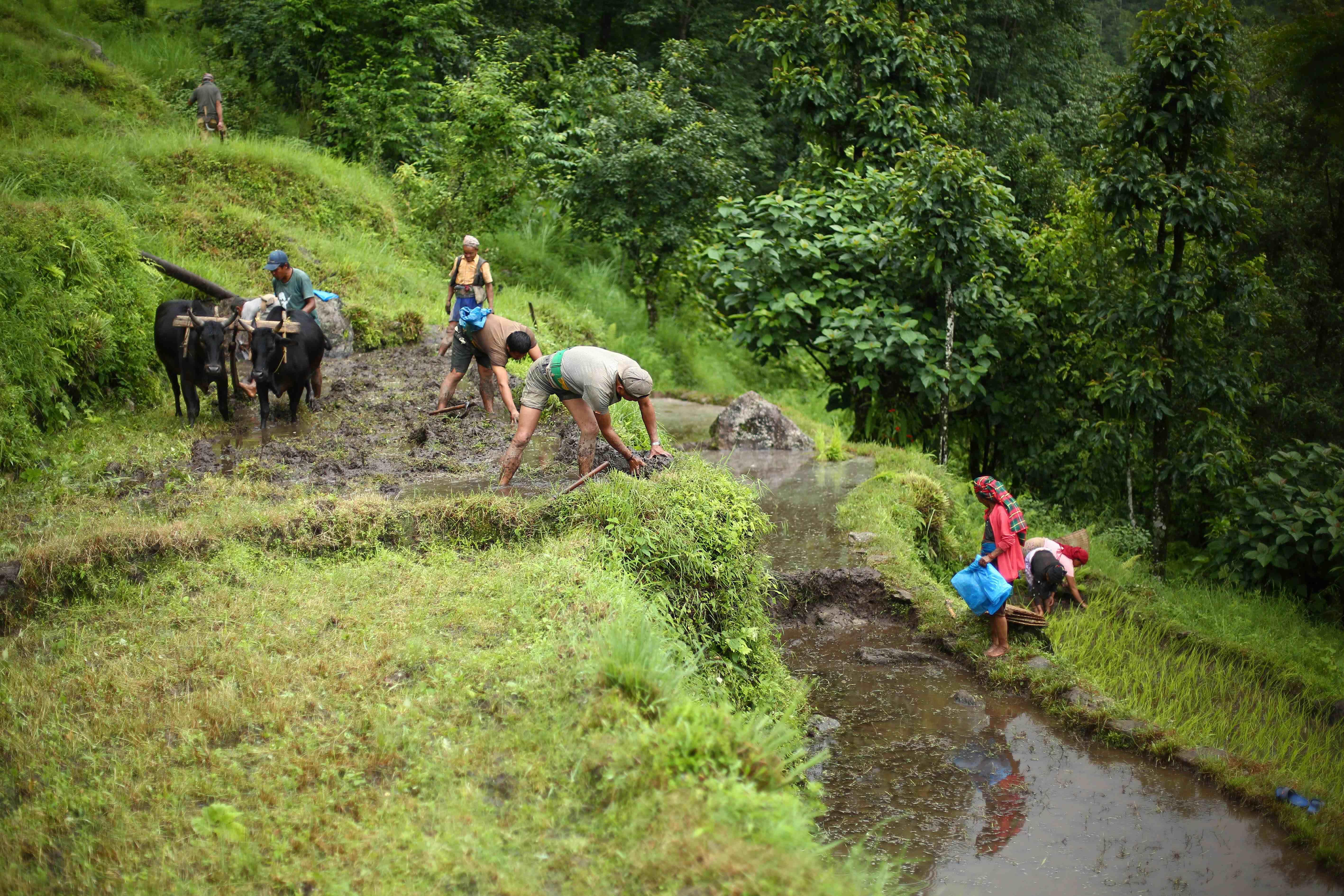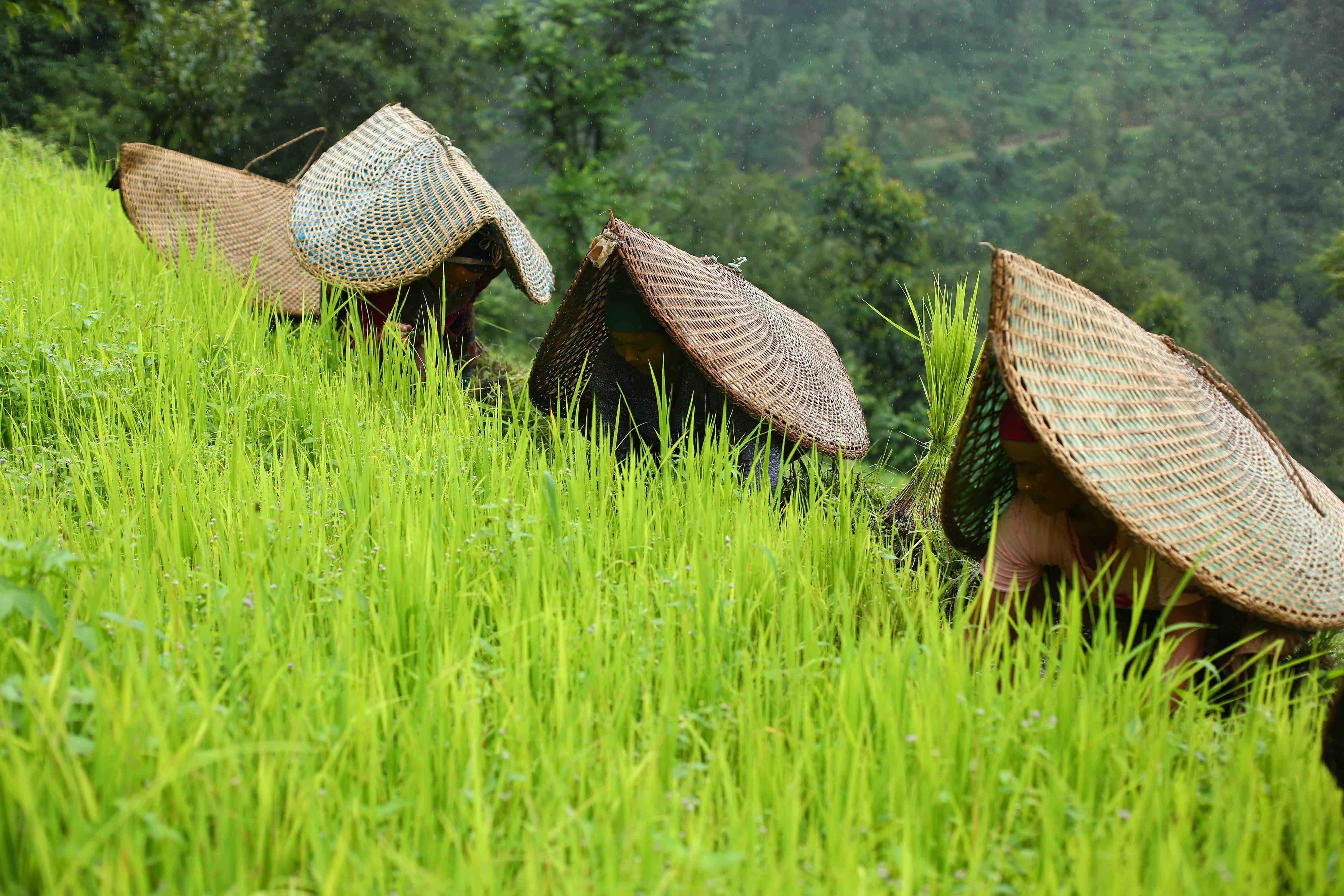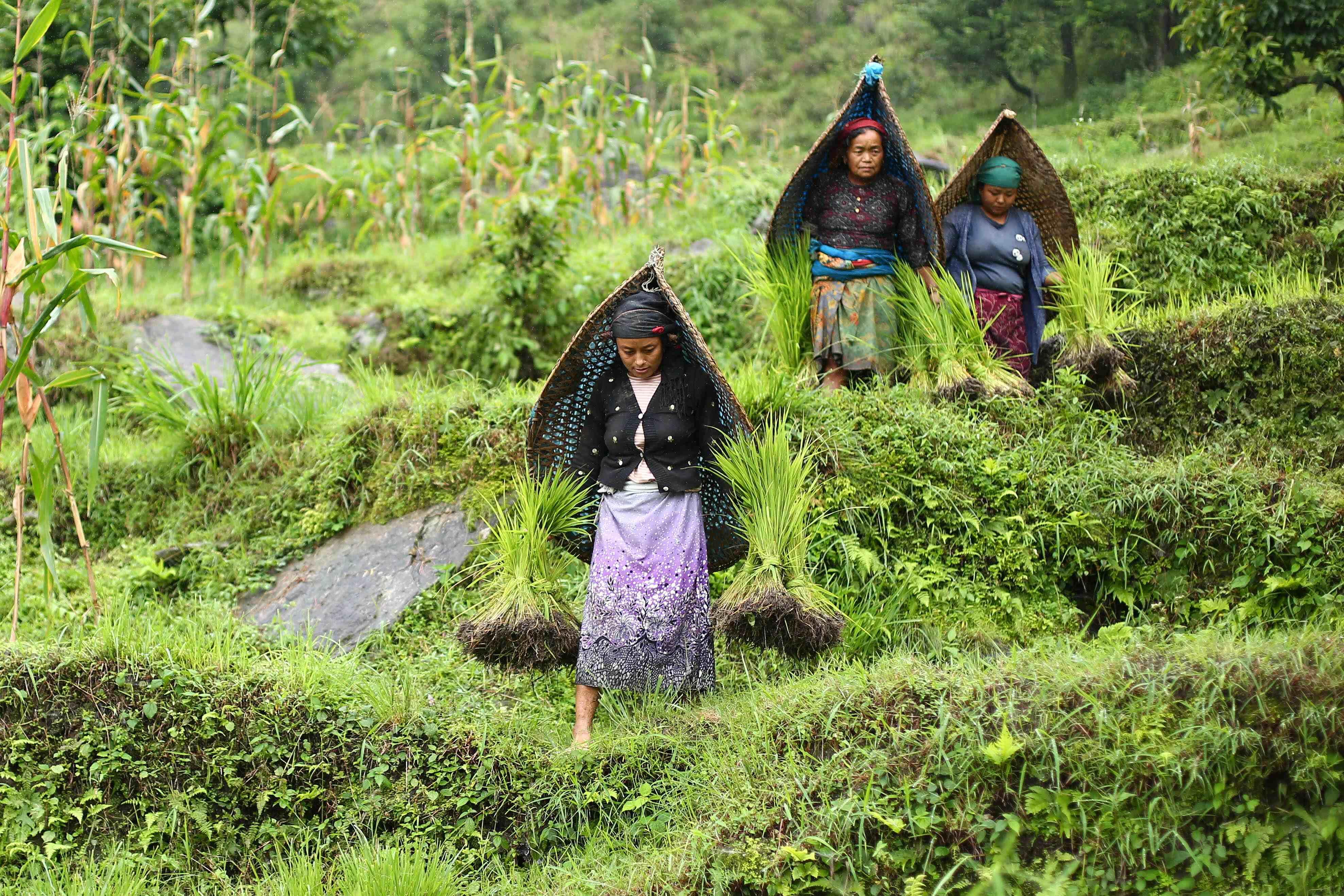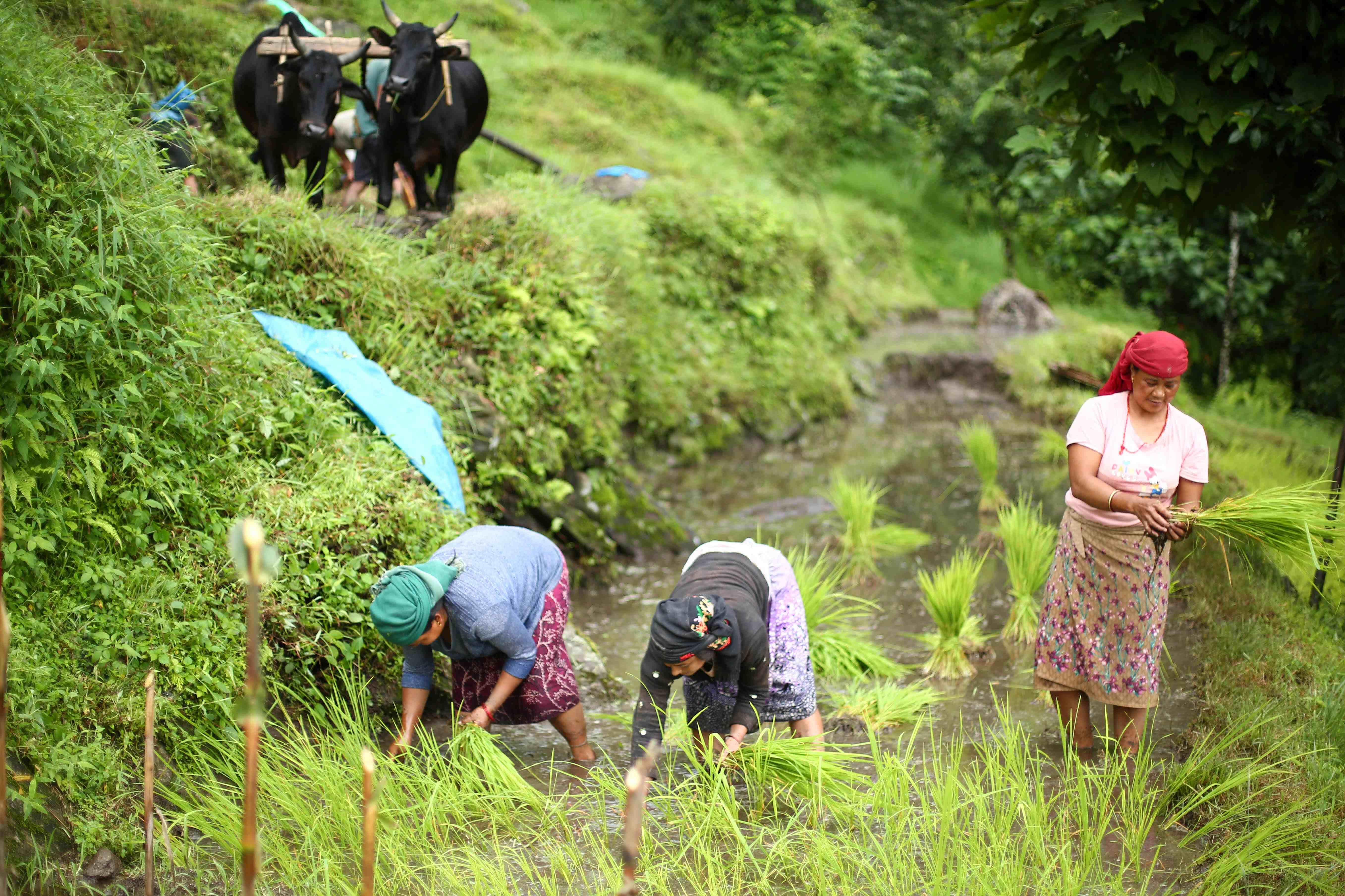 असार महिना सकिनै लाग्दा किसान रोपाइँमा व्यस्त छन्। कहीँ रोपाइँ सकिसकेको छ भने कहीँ बाँकी नै छ। विशेष गरी गाउँघरतिर पर्म लगाउने र पर्म तिर्ने जाने चलन रहेकाले रोपाइँ गर्न बाँकी नै छ। यही सिलसिलामा गोरखा जिल्ला अजिरकोट गाउँपालिकाको भीरकुन गाउँमा गर्न रोपाइँ गर्दै किसानहरू। तस्वीर : नेपाल फोटो लाइब्रेरी।