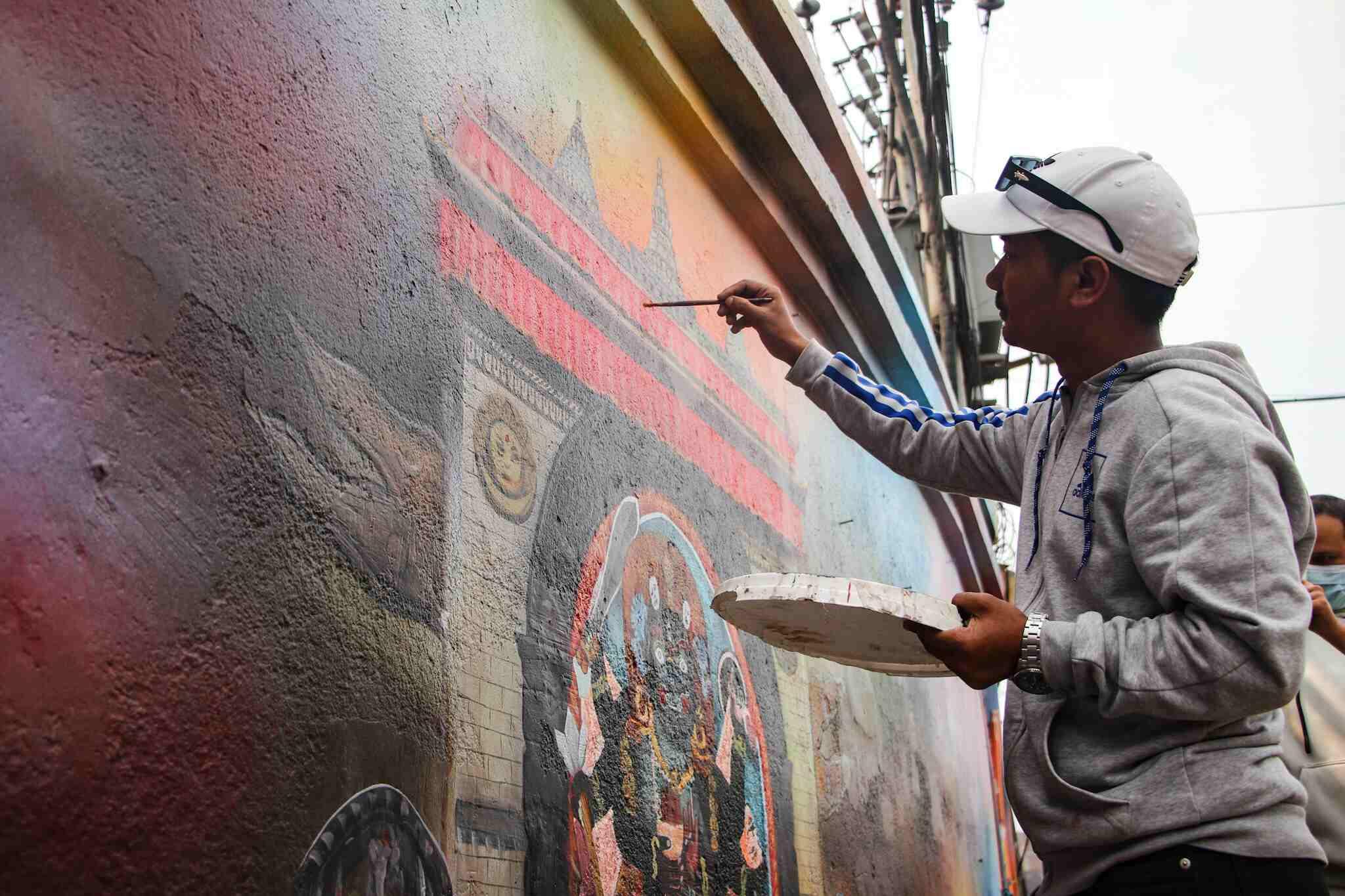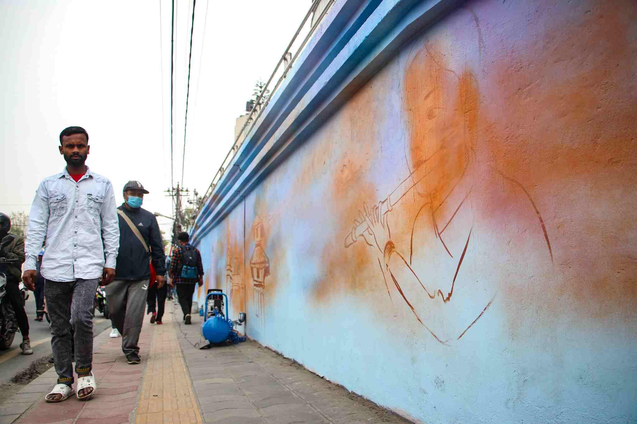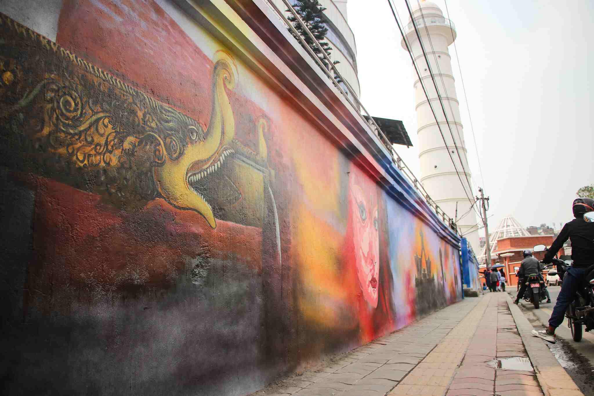 काठमाडौँ महानगरपालिकाले ‘वाल आर्ट’मार्फत खाली भित्ताहरू रङ्गाउन शुरू गरेको छ। फोहोर फल्ने, पोस्टर ठास्ने, अनावश्यक रूपमा लेख्ने गर्दा कुरुप देखिएपछि खाली भित्तामा काठमाडौँ महानगरले विभिन्न कला संस्कृति झल्किने गरी रङ रोगन गरेको हो। शुरूआती चरणमा सुन्धारामा रहेको नेपाल टेलिकमको भवनका भित्तामा रङ रोगन गरिएको हो। सुन्धारापछि त्रिपुरेश्वर ओरालो, प्रदर्शनी मार्गमा रहेका भित्ता, विमानस्थल, बबरमहलमा ‘वाल आर्ट’ गरिने महानगरले जनाएको छ। तस्वीर : नेपाल फोटो लाइब्रेरी