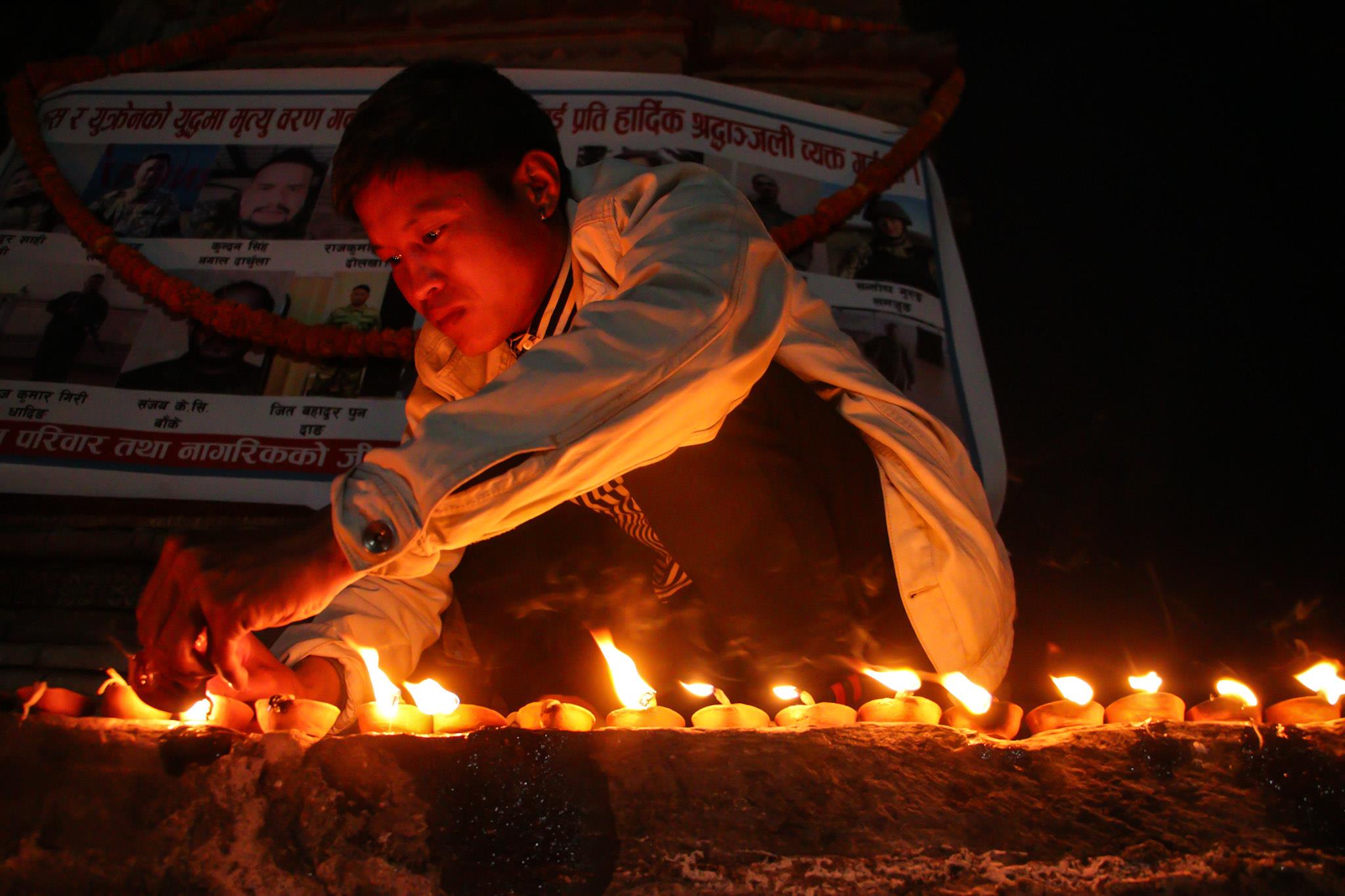 रुसले युक्रेनमाथि आक्रमण थालेको शनिबार दुई वर्ष पूरा भएको छ। रुसी राष्ट्रपति भ्लादिमिर पुटिनले २०२२ फेब्रुअरी २४ को बिहानै ‘विशेष सैन्य अभियान’को घोषणा गर्दा युक्रेनमाथि आक्रमण थालेका थिए। धेरैले केही दिनभित्रै मस्कोले युक्रेनविरुद्ध जित हात पार्ने अनुमान गरे पनि यी दुई देशबीचको युद्ध अझै जारी छ। यस क्रममा केही नेपाली रुसी सेनामा सामेल भए र केहीले ज्यान पनि गुमाए। रुस–युक्रेन युद्धका क्रममा ज्यान गुमाएकाहरूको शवको पर्खाइमा रहेका छन् आफन्तहरू। रुसी सेनामा रहेका नेपालीको उद्धार, मृतकका परिवारलाई राहत तथा बेपत्ता अवस्थामा भएकाहरूको अवस्था सार्वजनिक गर्न उनीहरूका परिवारजन माग गर्दै आएका छन्। उनीहरूले शनिबार प्रधानमन्त्रीलाई भेटेर माग पत्र बुझाउने र ध्यानाकर्षण गराउने प्रयास भएको थियो। तर प्रधानमन्त्रीबाट समय उपलब्ध नभएपछि प्रतिनिधिमूलक परिवारजनको उपस्थितिमा आफूहरूले प्राप्त जानकारीका आधारमा मृतक, बेपत्ता, घाइतेहरूको नयाँ विवरण सार्वजनिक गरेका छन्। साथै उनीहरूले शनिबार साँझ रुसमा ज्यान गुमाएका नेपालीप्रति श्रद्धाञ्जली अर्पण गर्दै उनीहरूको सम्मानमा द्वीप प्रज्वलन गरे। तस्वीर : फोटो लाइब्रेरी