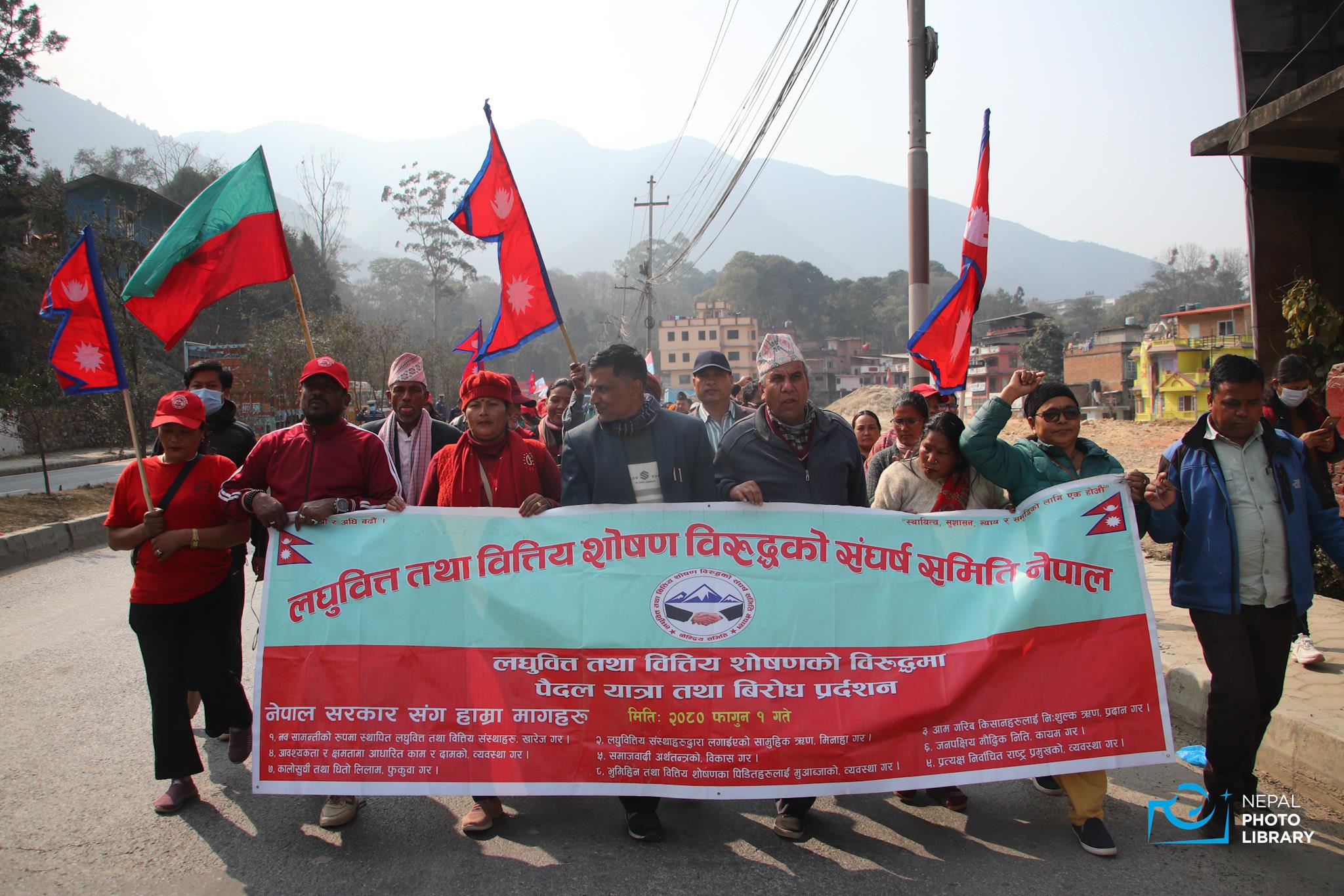 काठमाडौँ– लघुवित्त तथा वित्तीय शोषणविरुद्ध संघर्षमा उत्रिएका करिब ३ हजार पीडितहरू काठमाडौँमा आइपुगेका छन्। अन्य पीडित आउने क्रम जारी रहेको लघुवित्त तथा वित्तीय शोषण विरुद्धको संघर्ष समिति नेपालका केन्द्रीय अध्यक्ष मनीराम ज्ञवालीले जानकारी दिए। \r\n\r\nएक हजारभन्दा बढी पीडितहरू करिब ६ दिन लगाएर लघुवित्त तथा वित्तीय शोषणविरुद्ध पैदल यात्रा तथा विरोध प्रदर्शन मुग्लिङबाट काठमाडौँ आइपुगेका हुन्। सरकारले समिति बनाएर केही काम नगरेकोमा पुनः सरकारलाई झकझकाउन आन्दोलन गर्न आएको बर्दियाका पीडित जीवन सुनारले बताए। मुग्लिङबाट हिँडेका उनीहरू ६ दिनमा शनिबार साँझ थानकोटस्थित त्रिभुवन पार्कमा आएर बसेका थिए। आइतबार उनीहरू थानकोटबाट र्याली प्रदर्शन गर्दै कलंकी हुँदै तीनकुने गएर बस्ने र सोमबारदेखि शान्तिपूर्ण आन्दोलन शुरू गर्न केन्द्रीय अध्यक्ष ज्ञवालीले जानकारी दिए।\r\n\r\nउनीहरूले नवसामन्तीको रूपमा स्थापित लघुवित्त तथा वित्तीय संस्थाहरू खारेज गर्न, लघु वित्तीय संस्थाहरूद्वारा लगाइएको सामूहिक ऋण मिनाहा गर्न, समाजवादी अर्थतन्त्रको विकास गर्न, भूमिहीन तथा वित्तीय शोषणका पीडितहरूलाई मुआब्जाको व्यवस्था गर्न, आवश्यकता र क्षमतामा आधारित काम र दामको व्यवस्था गर्न, कालोसूची तथा धितो लिलाम फुकुवा गर्नुपर्ने माग अघि सारेका छन्। तस्वीर– फोटो लाइब्रेरी