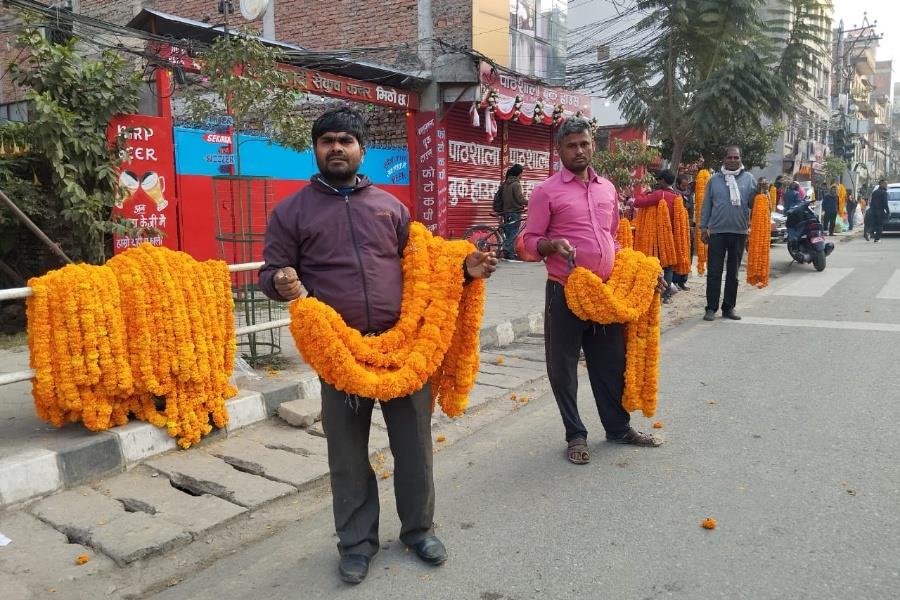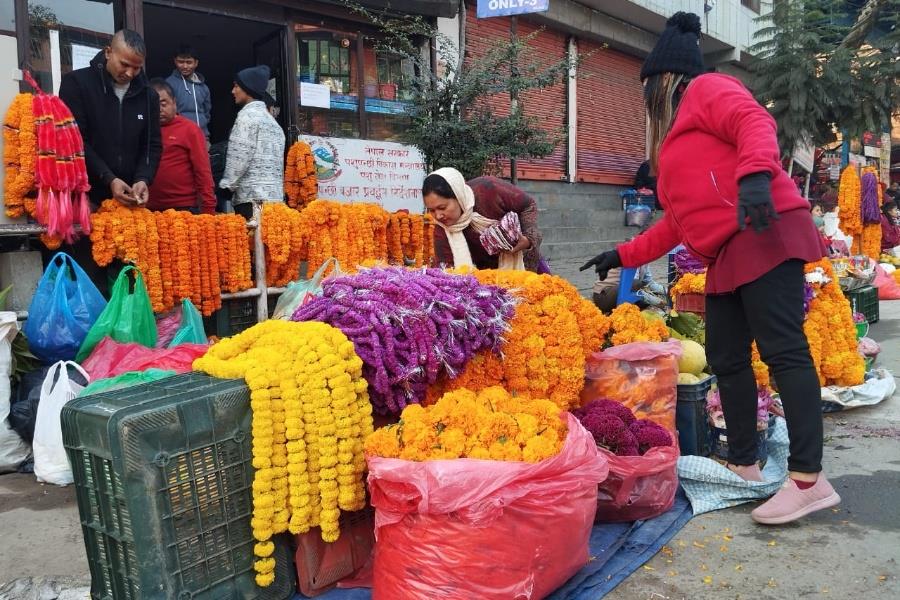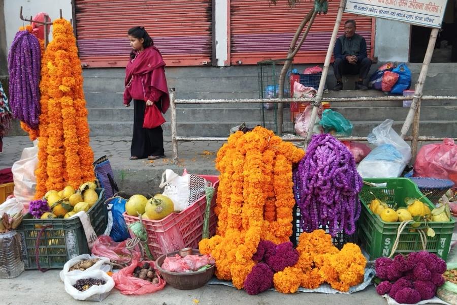 काठमाडौँका विभिन्न बजारमा बिक्रीका लागि राखिएका सयपत्री र मखमली फूल। तिहारमा फूलको माग अरू समयभन्दा बढी हुने गर्छ। तिहारलाई फूलैफूलको पर्व पनि भनिन्छ।