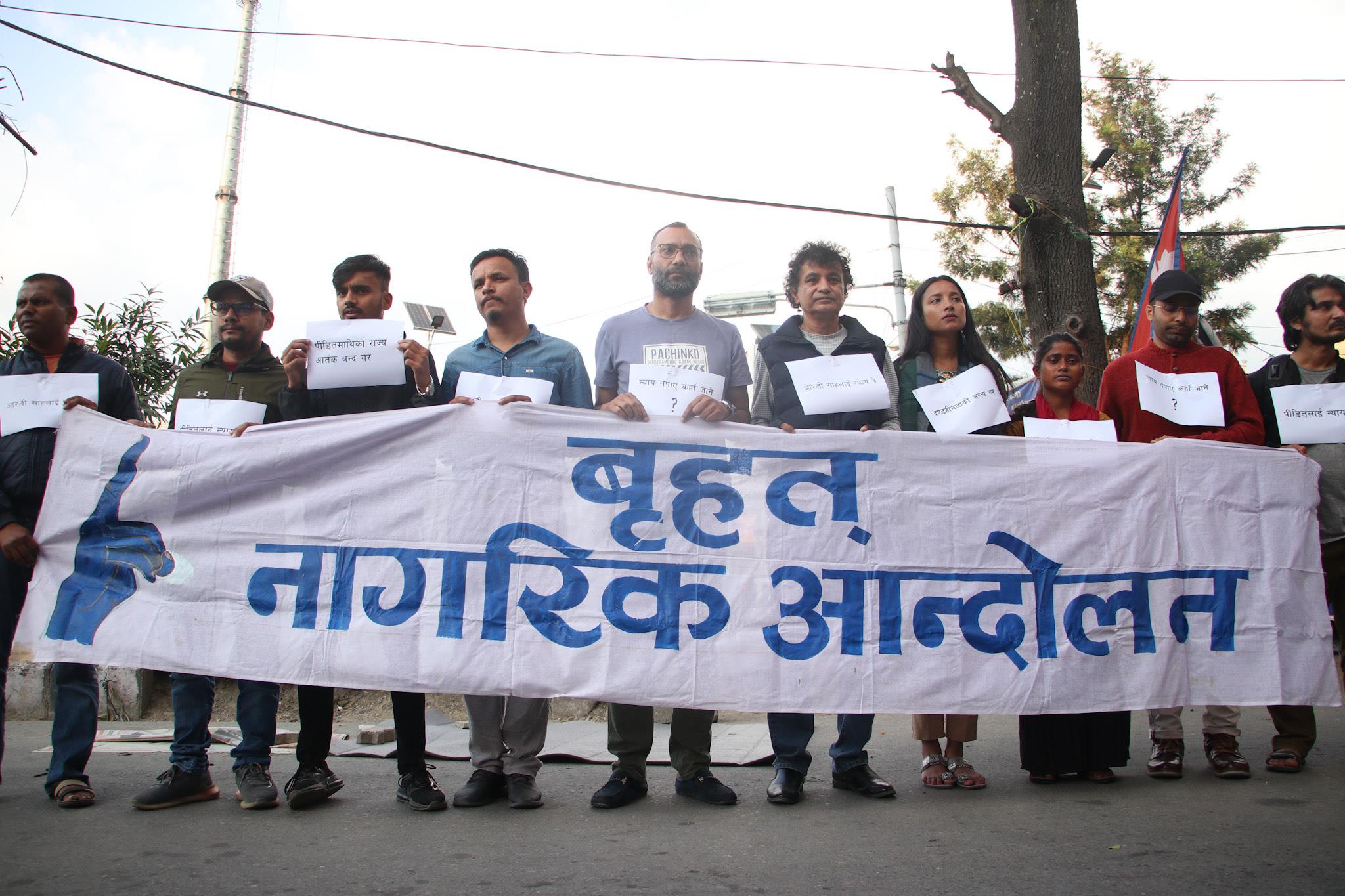 आरती साहको न्यायका लागि बृहत् नागरिक आन्दोलनले विरोध प्रदर्शन गरेको छ। आरतीको न्यायका लागि माइतीपक्ष १२१ दिनदेखि माइतीघर मण्डलमा धर्नारत थिए, तर आरती साहको आमाबुवा र भाइलाई शनिबार प्रहरीले बल प्रयोग गरी हटाएको थियो। प्रहरीले ब्यानरसमेत च्यातेर धरपकड गर्दै धर्नास्थलबाटै उनीहरूलाई हिरासतमा लिइएको विरोधमा बृहत् नागरिक आन्दोलनले आइतबार माइतीघरमा विरोध प्रदर्शन गरेको हो। बृहत् नागरिक आन्दोलनका अभियन्ताहरूले ‘आरती साहलाई न्याय दे’, ‘सरकार दण्डहीनता अन्त्य गर’, ‘म पनि यही देशको नागरिक हो सरकार’, ‘न्याय नपाए कहाँ जाने?’ लगायतका नारा लेखिएका प्लेकार्ड बोकेर विरोध प्रदर्शन गरेका थिए। विरोध प्रदर्शनमा बृहत् नागरिक आन्दोलनका अभियन्ता सञ्जीव उप्रेती, नवीन तिवारी, आरतीकी बहिनी मनिषा साहलगायत उपस्थित थिए।