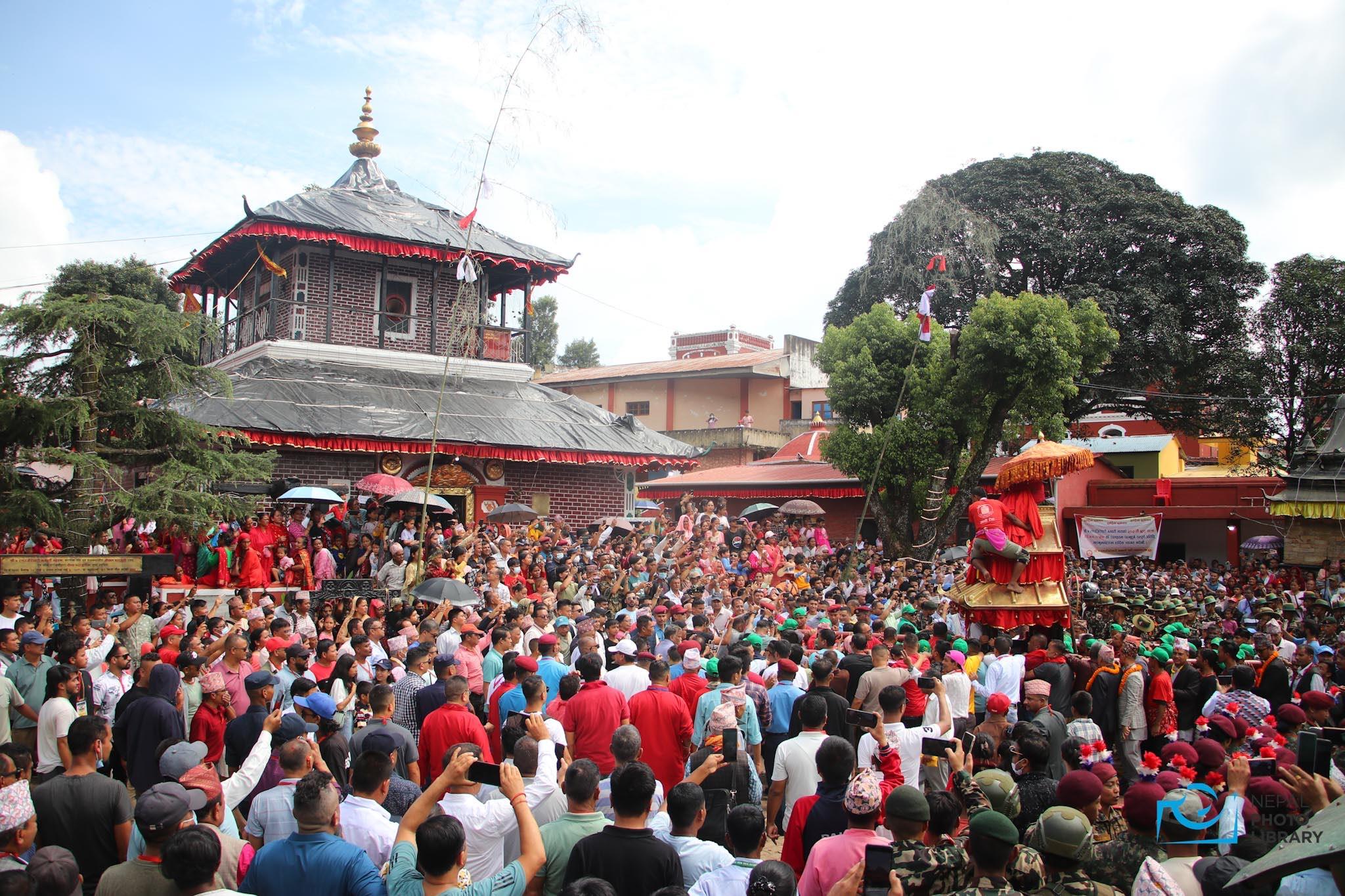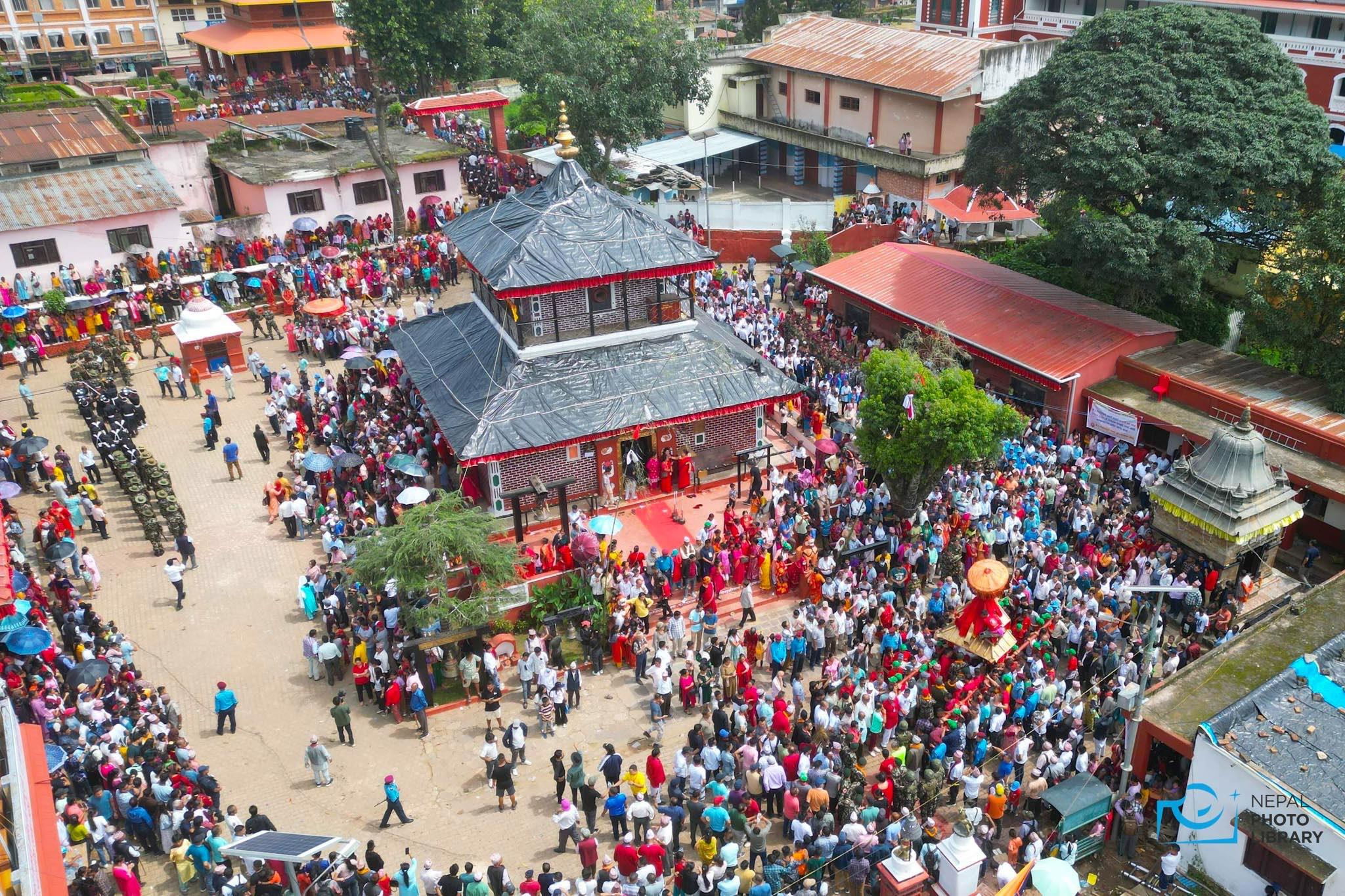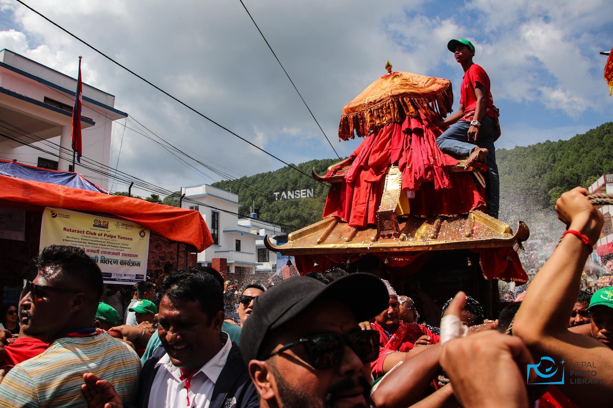 पाल्पामा ऐतिहासिक भगवती जात्राको रथयात्रा निकालिएको छ। नेपालले अंग्रेज सेनालाई युद्धमा पराजित गरी विजय हासिल गरेको खुसीयालीमा बिहीबार पाल्पामा विजयोत्सवस्वरूप भगवती जात्रा निकालिएको हो। नेपाली सेनाले सलामी दिएर तीनपटक मन्दिर परिक्रमा गराएपछि भगवती जात्रा रथयात्रा निकालिएको हो। भगवती जात्रालाई सिन्दूर जात्राका नामले पनि चिनिन्छ। विद्यालय एवं विभिन्न संघसंस्थाको उपस्थितिमा निकालिने भगवती जात्रा रथयात्रालाई भजनकीर्तन, पञ्चेबाजा, लाखेनाच, विभिन्न सांस्कृतिक झाँकीसहित तानसेन नगर परिक्रमा गराएर पुनः भगवतीको मन्दिरमा लगी विसर्जन गरिन्छ गरिन्छ। विजयोत्सव जात्रामा पाल्पाका साथै गुल्मी, अर्घाखाँची, कपिलवस्तु, नवलपरासी, चितवन, स्याङ्जा, कास्कीलगायत क्षेत्रबाट निकै उत्साहका साथ अवलोकनका निम्ति आउने गरेको पाइन्छ। तस्वीर: मनिष अर्याल