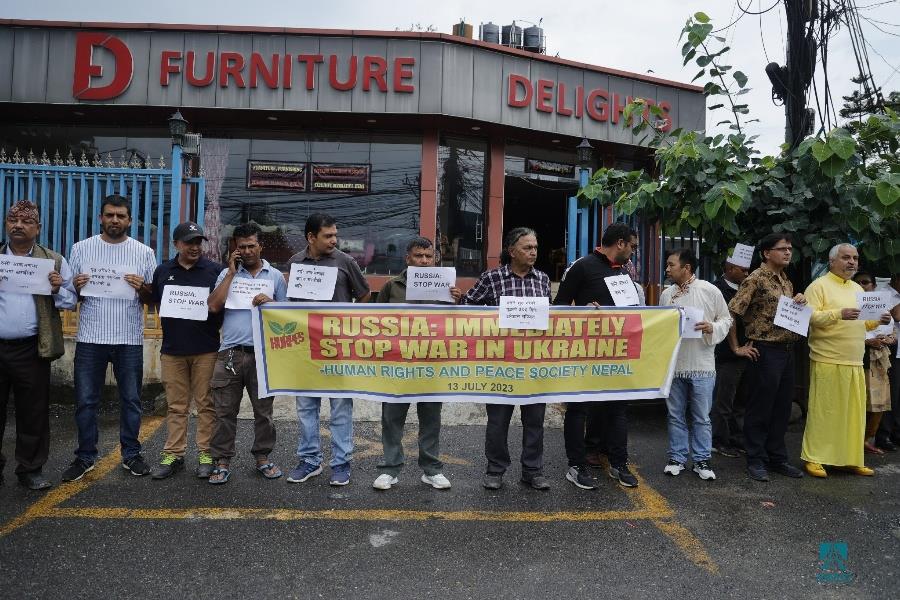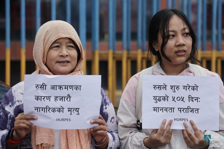 काठमाडौँ– काठमाडौँस्थित रुसी दूतावासअगाडि युक्रेनमाथिको आक्रमण तत्काल रोकी शान्ति वार्तामा आउन रुसलाई आह्वान गर्दै मानवअधिकार तथा शान्ति समाजले शान्तिपूर्ण प्रदर्शन गरेको छ। समाजले रुसी दूतावासमार्फत राष्ट्रपति भ्लादिमिर पुटिनलाई पत्र पठाउँदै तत्काल युद्ध रोकेर शान्ति कायम गर्न आग्रह गरेको छ। समाजको केन्द्रीय सभापति रामकृष्ण बरालको नेतृत्वमा भएको प्रदर्शनमा मानव अधिकारकर्मी कृष्ण पहाडी, समाजका पूर्वसभापति उत्तर पुडासैनी लगायतका अधिकारकर्मीहरूको उपस्थिति रहेको थियो। रुसले छिमेकी राष्ट्र युक्रेनमाथि आक्रमण गरेको बिहीबार ५०५औँ दिन भएको छ। २०२२ फेब्रुअरी २४ मा नेटोसँग सम्बन्धनजिक बनाएको भन्दै रुसले युक्रेनमाथि सैन्य कारबाही शुरू गरेको थियो। तस्वीर–फोटो लाइब्रेरी