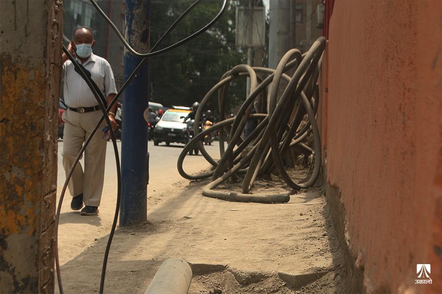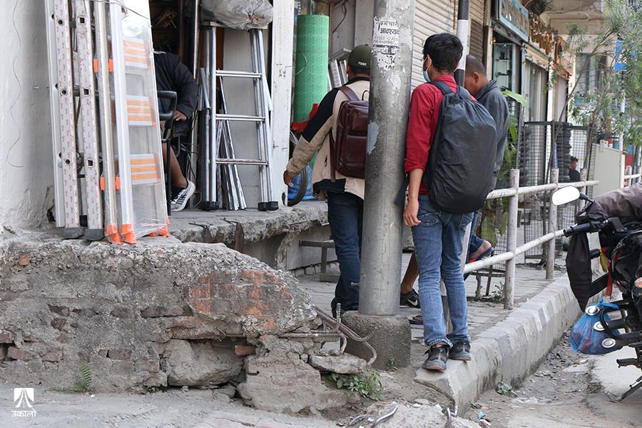 काठमाडौँका अधिकांश सडकपेटी पैदलयात्रुका लागि सहज छैनन्। सडकपेडीमा यात्रुहरू जोखिम मोलेर हिँड्न बाध्य छन्। निर्माण सामाग्री थुपारिँदा, सहायक सडक जोडिएका स्थानमा, बिजुलीका पोललगायतले जोखिम हुने गरेको छ। कतिपय स्थानमा सडकबाटै हिँड्नुपर्ने अवस्था छ। अपांगता भएका व्यक्तिलाई झनै कठिन हुने गरेको छ। तस्वीर: किसन पाण्डे/उकालो\r\n\r\n