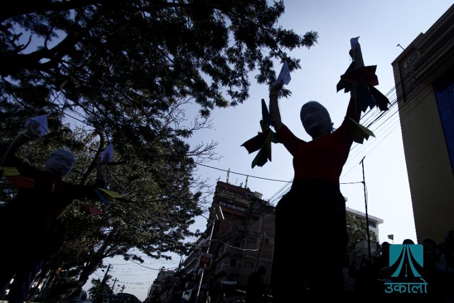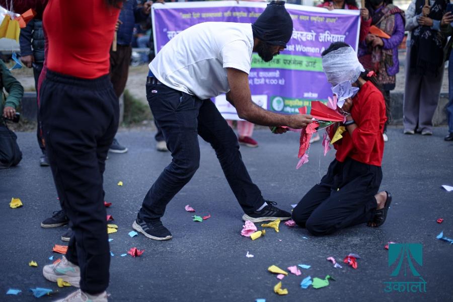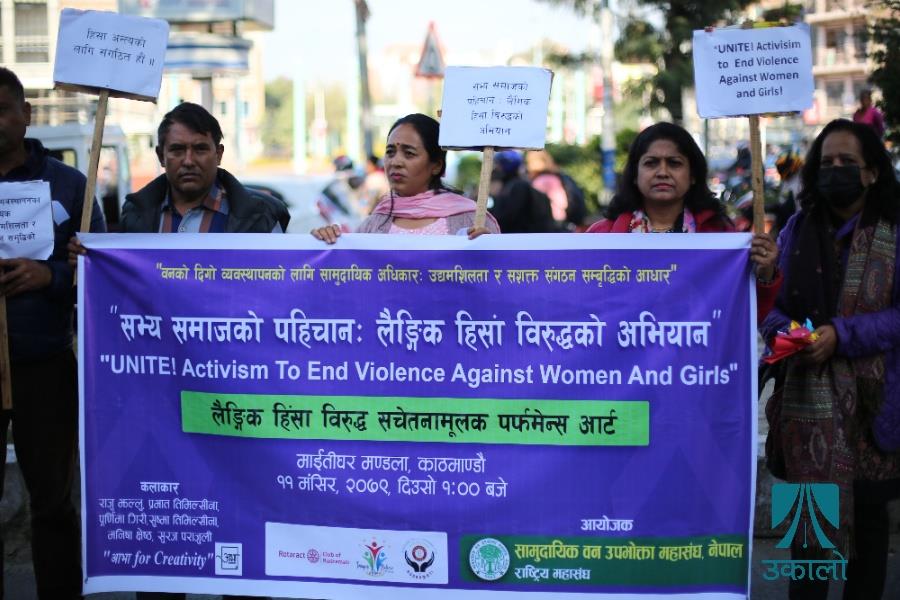 महिलामाथि हुने हिंसाविरुद्धको १६ दिने अभियानअन्तर्गत सामुदायिक वन उपभोक्ता महासंघ, नेपालको आयोजनामा \'लैंगिक हिंसाविरुद्ध सचेतनामूलक पर्फमेन्स आर्ट\' आयोजना गरिएको छ। माइतीघर मण्डलमा कलाकारहरूले नाटक प्रदर्शन गरेका हुन्। आभा फर क्रियटिभिटी समूहले \"निर्दोष पक्षी\" नामक उक्त नाटक देखाएको हुन्। तस्वीरहरू : अमित मचामसी