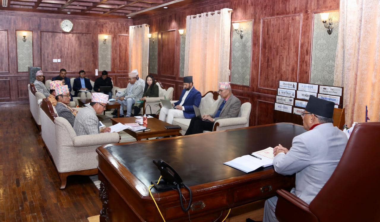 उपप्रधानमन्त्री तथा अर्थमन्त्री विष्णुप्रसाद पौडेल र उपप्रधानमन्त्री तथा गृहमन्त्री रवि लामिछाने र सरकारका मुख्यसचिव शङ्करदास वैरागीको उपस्थिति रहेको थियो। सो भेटघाटमा राष्ट्रियसभाको रिक्त सदस्यको निर्वाचन, राष्ट्रपति तथा उपराष्ट्रपति पदको निर्वाचन र एकीकृत निर्वाचन कानुनका विषयलगायत समसामयिक विषयमा छलफल तथा परामर्श भएको थियो।