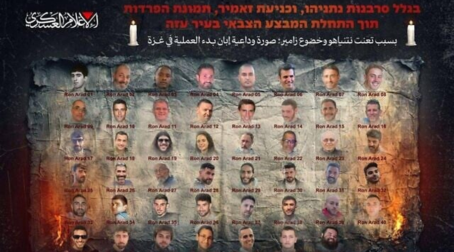यी तस्वीरमा जीवित र मृत सबै बन्धकहरूको अनुहार देखाइएको छ। हरेक अनुहारको तल 'रोन अराद' लेखिएको छ। यो नाम सन् १९८६ मा लेबनानमा बेपत्ता भएका इजरायली वायुसेनाका क्याप्टेनको हो। उनको मृत्यु भएको मानिए पनि उनको अवस्था अझै अज्ञात छ।