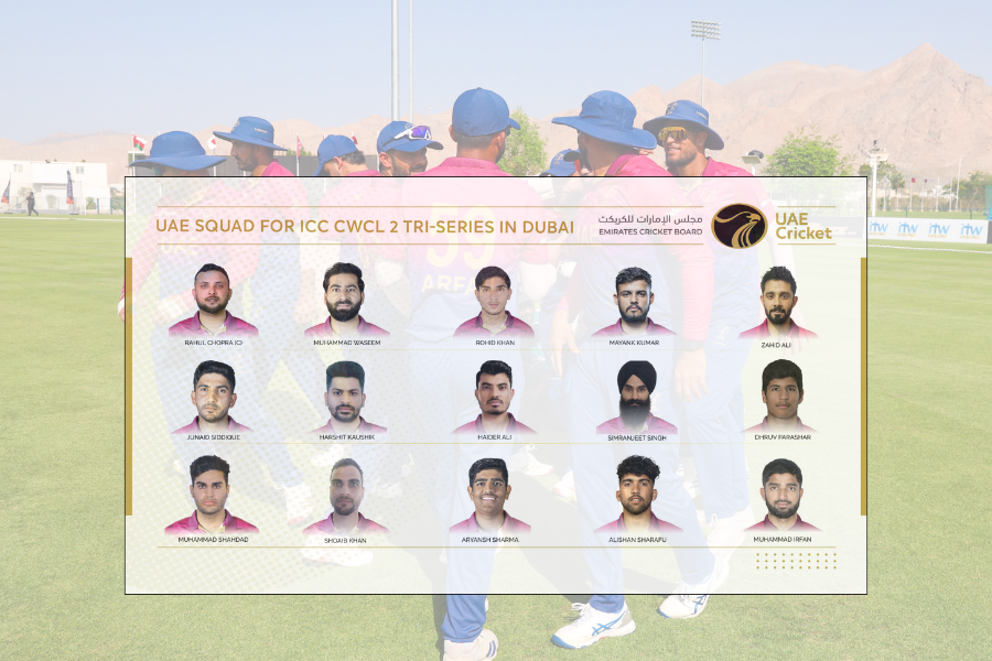 ब्याटर तथा विकेटकिपरसमेत रहेका कप्तान राहुल चोप्रा नेतृत्वमा यूएईले १५ सदस्यीय टोली घोषणा गरेको हो। यूएईको टोलीमा अलिशान शारफु, आर्यश शर्मा, ध्रुव पराशर, हैदर अलि, हर्षित कौशिक र जुनैद सिद्दिक छन्। त्यस्तै, मयन कुमार, मुहम्मद अर्फान, मुहम्मद शाहदाद, मुहम्मद वासिम, मुहम्मद रोहिद खान, शोएब खान, सिम्रनजित सिंह र जाहिद अली पनि टोलीमा समावेश छन्। यूएईको मुख्य प्रशिक्षक लालचन्द राजपुत छन्।