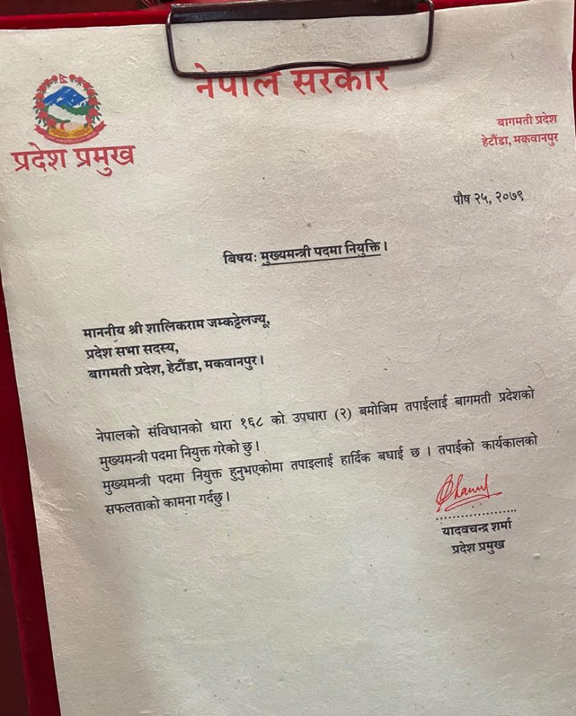 “नेपालको संविधानको धारा १६८ को उपधारा (२) बमोजिम तपाईंलाई बागमती प्रदेशको मुख्यमन्त्री पदमा नियुक्त गरेको छु”, प्रदेशप्रमुखले दिएको नियुक्तपत्रमा उल्लेख छ।