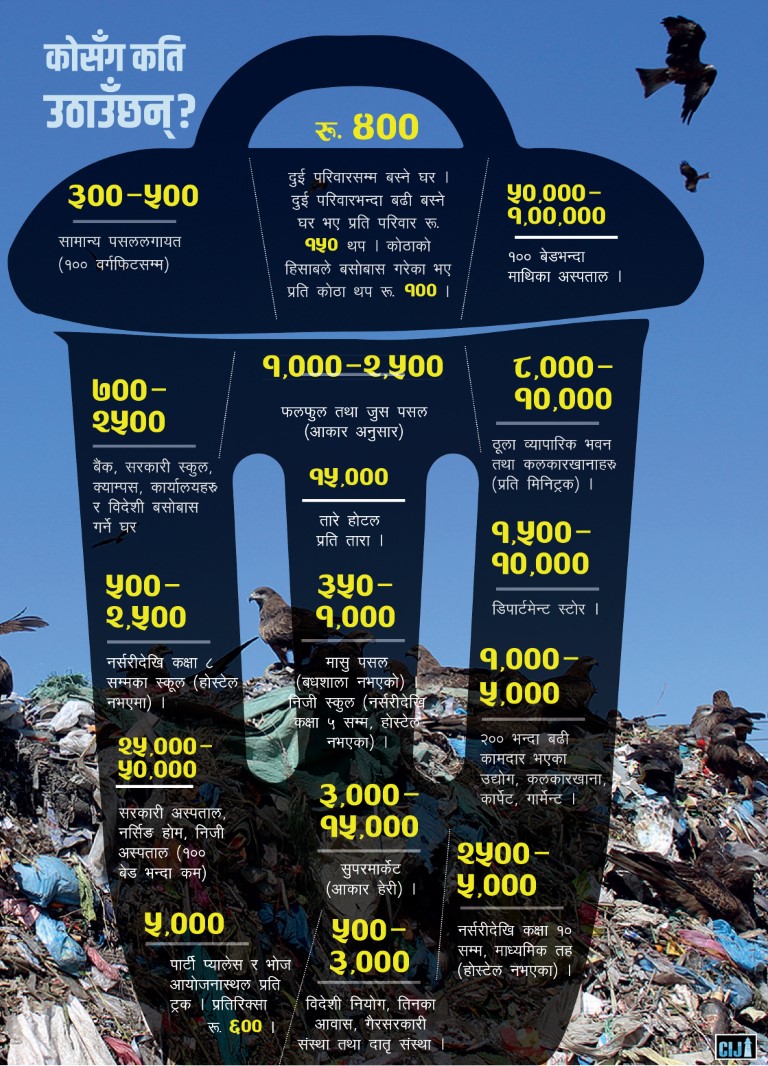 “फोहोर कति निस्कन्छ, त्यसको आधारमा घरधनीबाट ४५० देखि ५०० रुपैयाँसम्म लिन्छौँ। होटल व्यवसायीबाट ५ हजारदेखि ७ हजारसम्म, पार्टी प्यालेस र ब्यांक्वेटहरूबाट १० हजारसम्म लिन्छौँ”, उनले भनिन्।