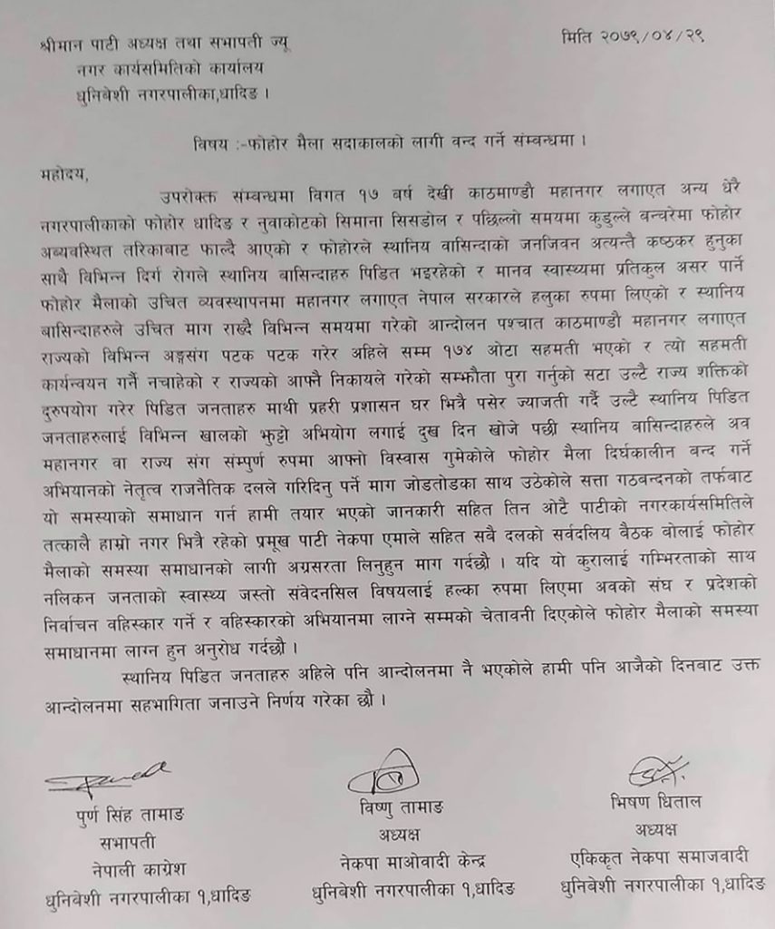 एउटा उदाहरण हेरौँ। गत जेठ–असारमा बालेनले फोहोर व्यवस्थापनको स्थायी समाधान खोज्ने पहल गरिरहँदा धादिङको धुनिबेसी–१ मा नेपाली कांग्रेस, नेकपा माओवादी केन्द्र र नेकपा एकीकृत समाजवादीका स्थानीय कमिटीले ‘फोहोरमैला सदाका लागि बन्द गर्ने’ भन्दै फोहोर फाल्न नदिने घोषणा गरे। पार्टीका माथिल्ला कमिटीलाई संयुक्त पत्र पठाएरै उनीहरूले काठमाडौँ उपत्यकाको फोहोरले १७ वर्षदेखि धादिङ र नुवाकोटको सीमाका बासिन्दाको जीवन कष्टकर बनाइरहेको उल्लेख गरेका थिए।