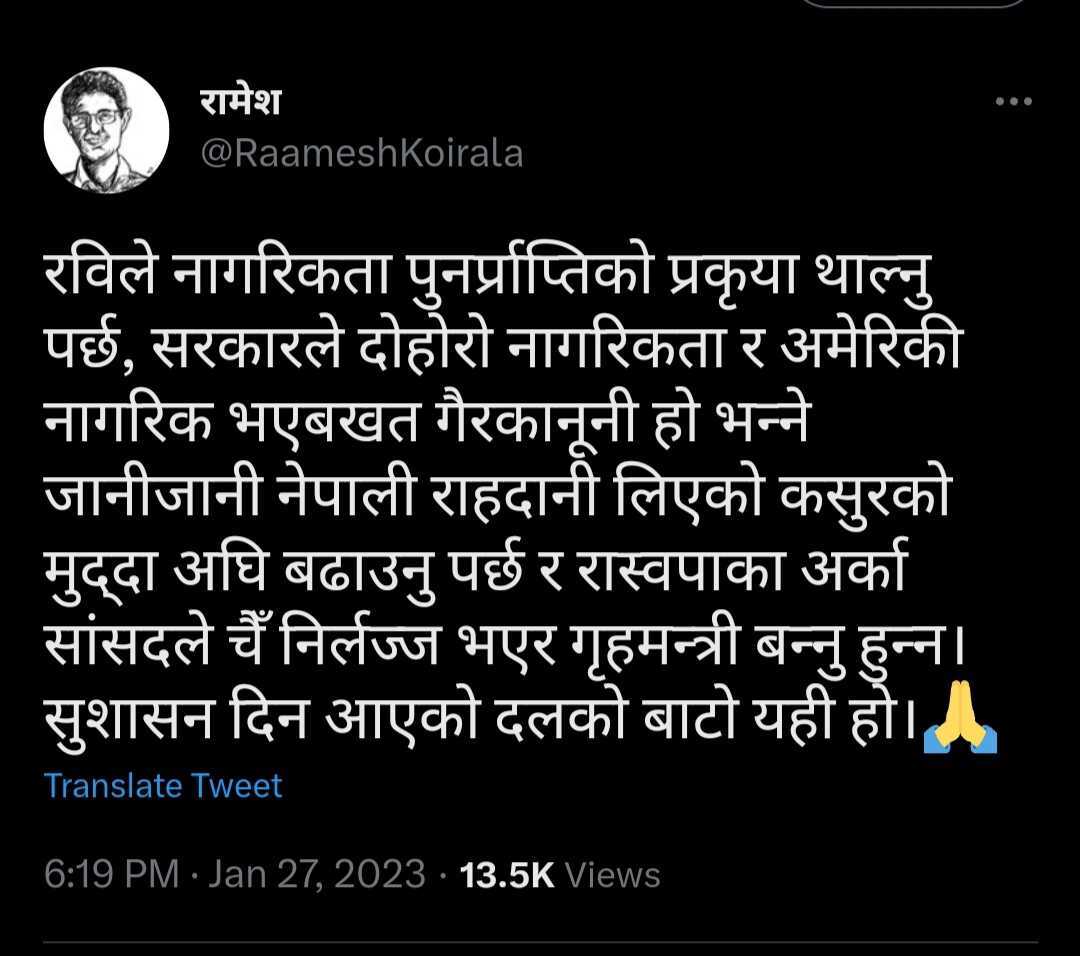 “रविले नागरिकता पुनः प्राप्तिको प्रक्रिया थाल्नु पर्छ, सरकारले दोहोरो नागरिकता र अमेरिकी नागरिक भएबखत गैरकानुनी हो भन्ने जानीजानी नेपाली राहदानी लिएको कसुरले मुद्दा अघि बढाउनु पर्छ र रास्वपाका अर्का सांसद चैँ निर्लज्ज भएर गृहमन्त्री बन्नु हुन्न। सुशासन दिन आएको दलको बाटो यही हो“, उनले भनेका छन्।