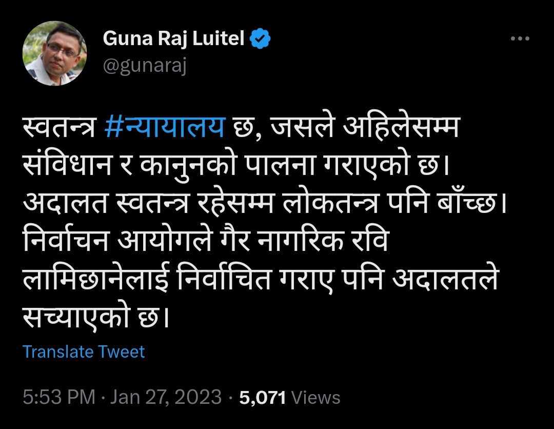 नागरिक दैनिकका सम्पादक गुणराज लुईंटेलले न्यायालय अझै पनि स्वतन्त्र रहेको र उसले संविधान र कानुनको पालना गरेको धारणा राखेका छन्। निर्वाचन आयोगले गैरनागरिकलाई निर्वाचित गराएको कदमलाई पनि अदालतले सच्याएको उनको भनाइ छ।