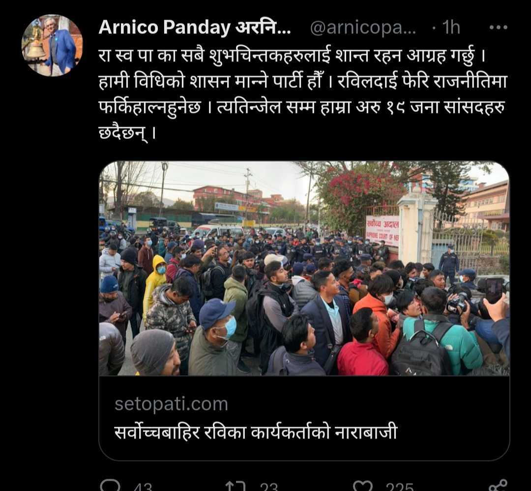 यता, रास्पवाका केन्द्रीय सदस्य अरनिको पाण्डेले शुभचिन्तकहरूलाई शान्त रहन आग्रह गरेका छन्। उनले आफ्नो पार्टीले विधिको शासनलाई मान्ने उल्लेख गरेका छन्। उनले रवि पुनः राजनीतिमा फर्कने आश्वासन दिएका छन्।