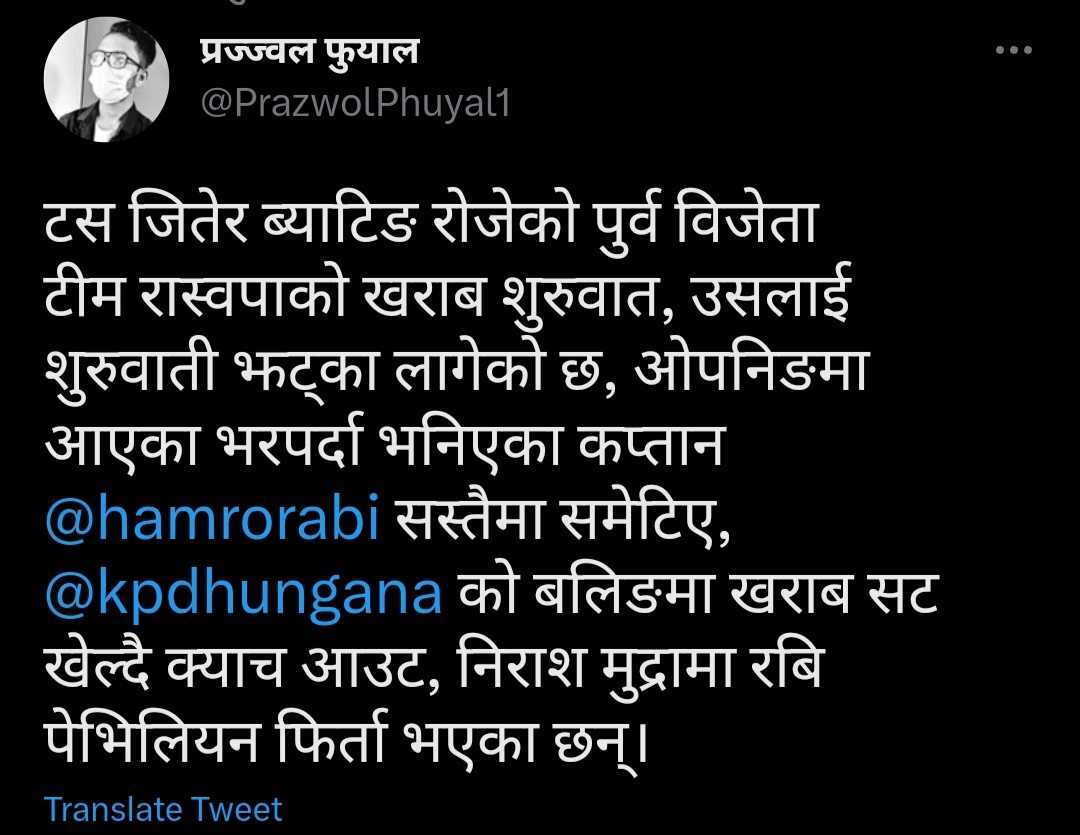 त्यस्तै, प्रशान्त फुयाँलले क्रिकेटको कमेन्ट्री शैलीमा लेखेका छन्, “टस जितेर ब्याटिङ रोजेको पूर्वविजेता टिम रास्वपाको खराब शुरुआत, उसलाई शुरुआती झट्का लागेको छ, ओपनिङमा आएका भरपर्दा भनिएका कप्तान (हाम्रो रवि) सस्तैमा समेटिए, (केपी ढुंगाना) को बलिङमा खराब सट खेल्दै क्याच आउट, निराश मुद्रामा रवि पेभिलियन फिर्ता भएका छन्।“