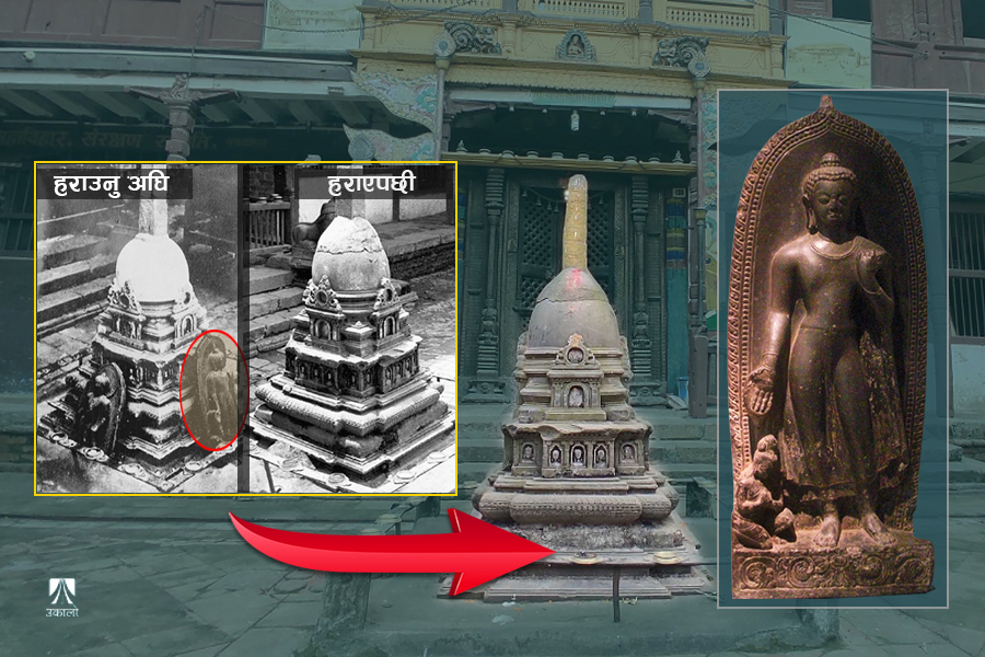 “एउटा मूर्ति चोरी भएपछि चैत्यको उत्तर दिशातर्फ रहेको बुद्धको अर्को मूर्तिलाई मूल मन्दिरभित्र ताल्चा लगाएर राख्यौँ। तर, त्यो मूर्ति पनि आखिरमा चोरी भयो”, उनले भने।