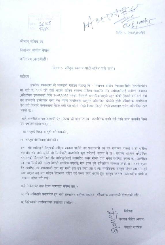 रवि लामिछाने नेतृत्वको राष्ट्रिय स्वतन्त्र पार्टीलाई खारेज गर्नुपर्ने माग गर्दै युवराज पौडेलले निर्वाचन आयोगमा निवेदन दिएका छन्।