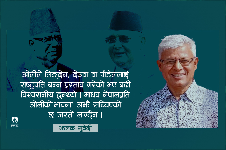 नेकपा एमाले अध्यक्ष केपी शर्मा ओलीले 'कार्ड'का रूपमा मात्रै राष्ट्रपतिको उम्मेदवारका रूपमा नेकपा समाजवादीका अध्यक्ष माधवकुमार नेपाललाई राष्ट्रपति बनाउन प्रस्ताव पेस गरेको देखिन्छ। यद्यपि, इमानदारीपूर्वक नेपाललाई राष्ट्रपतिको उम्मेदवारका रूपमा उनले प्रस्ताव गरेझैँ देखिँदैन। गत पुस १० गते तोडिएको भनिएको कांग्रेस, माओवादी र समाजवादी गठबन्धन पुनः जोडिनेतर्फ अघि बढेका बेला गठबन्धनबाट नेपाललाई झिक्ने प्रयासस्वरूप ओलीले नयाँ कार्ड फ्याँकेका हुन सक्छन्। यसो गरेर ओलीले नजिकिँदै गरेको गठबन्धन भत्काउने, प्रचण्डलाई कांग्रेसतिर जान नदिने, जाँदा पनि माधवकुमार नेपाललाई भने आफूतिर तानेर गठबन्धन कमजोर बनाउने दाउपेच गरेका हुन सक्छन्। त्यसो हुँदा ओलीले माधवकुमार नेपाललाई अन्तिमसम्म राष्ट्रपतिमा समर्थन कायम राख्छन् भन्नेमा म आशावादी छैन।