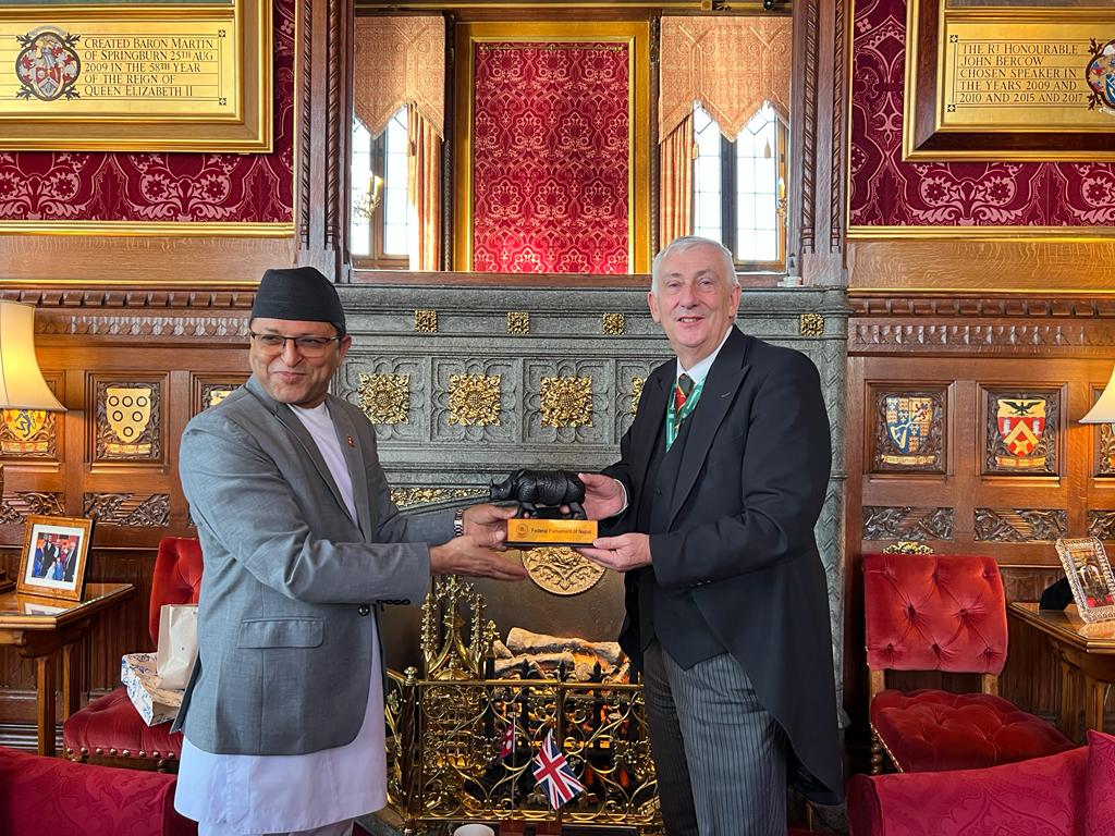 लण्डन- बेलायतको भ्रमणमा रहेका राष्ट्रियसभाका अध्यक्ष गणेशप्रसाद तिमिल्सिना र बेलायतको तल्लो सदन हाउस अफ कमनका सभामुख सर लिण्डसे होयलबीच भेटवार्ता भएको छ।