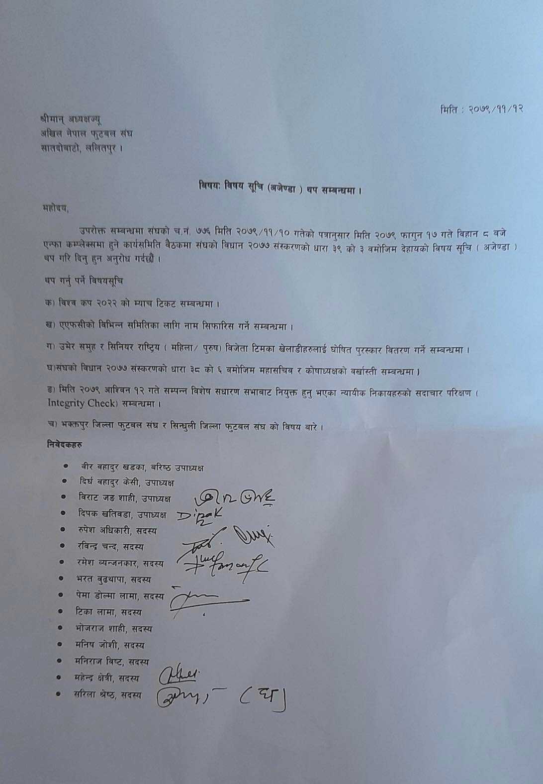 उनीहरूले एन्फाको कार्यसमिति बैठकमा उनीहरूको बर्खास्तीको मागसहितको ६ अजेन्डा राख्न माग गरेका छन्। पत्रको बुँदा 'घ' मा भनिएको छ, "संघको विधान २०७७ संस्करणको धारा ३८ को ६ बमोजिम महासचिव र कोषाध्यक्षको बर्खास्ती सम्बन्धमा।"